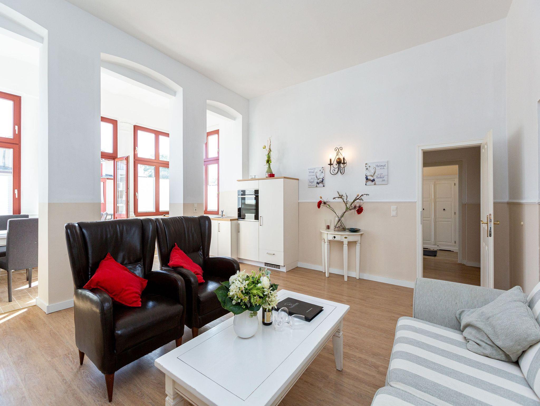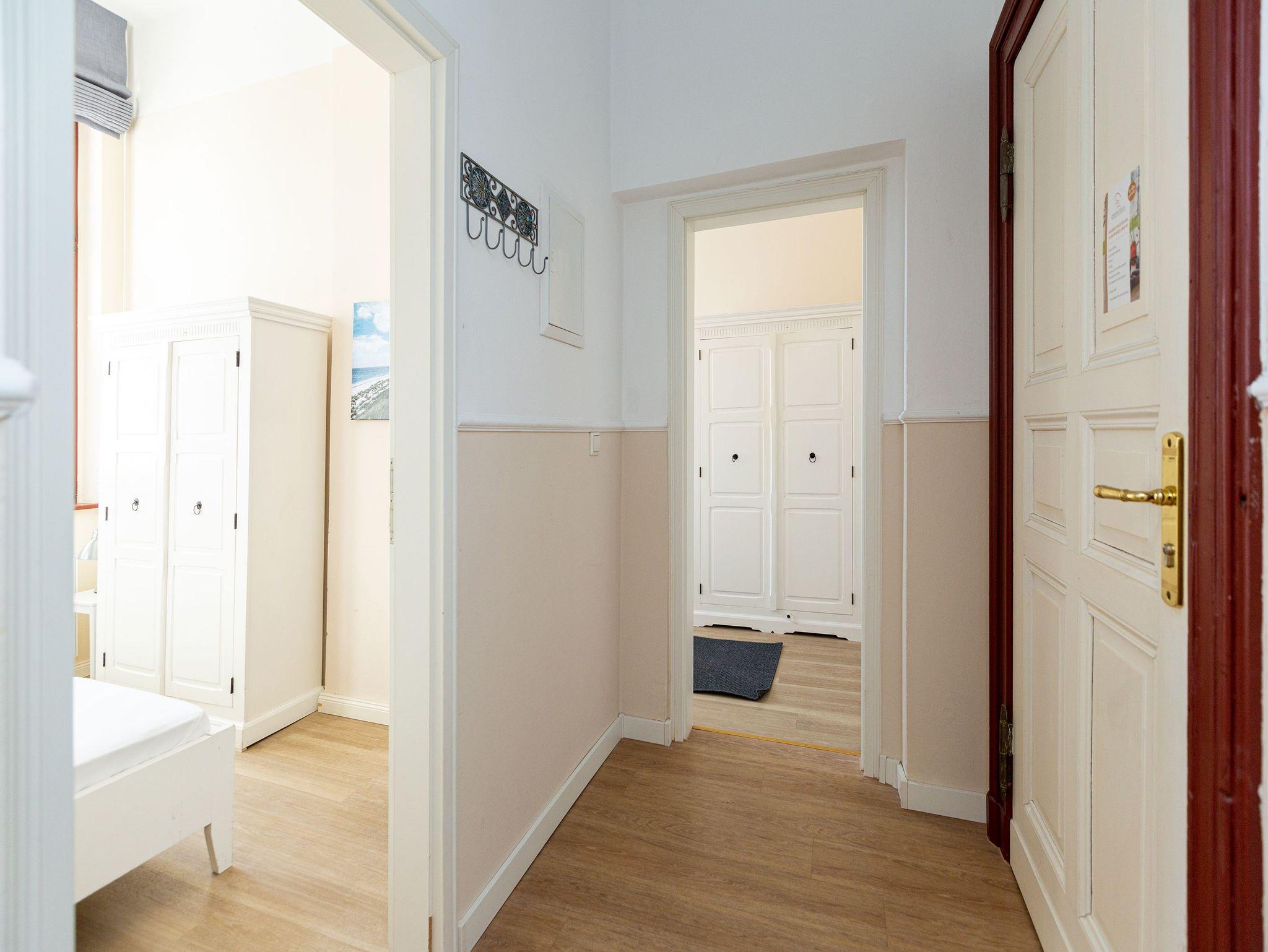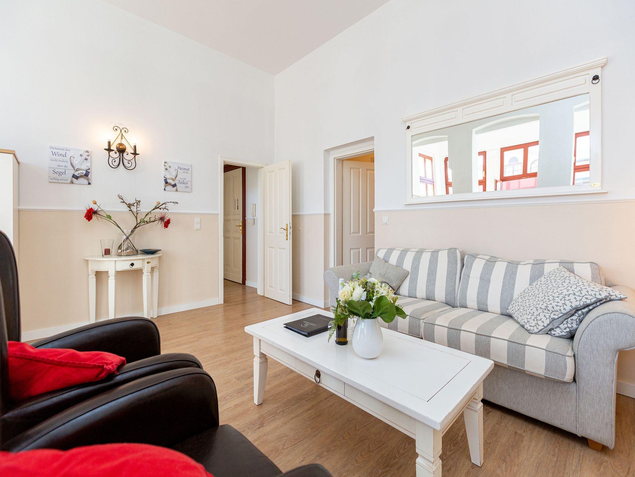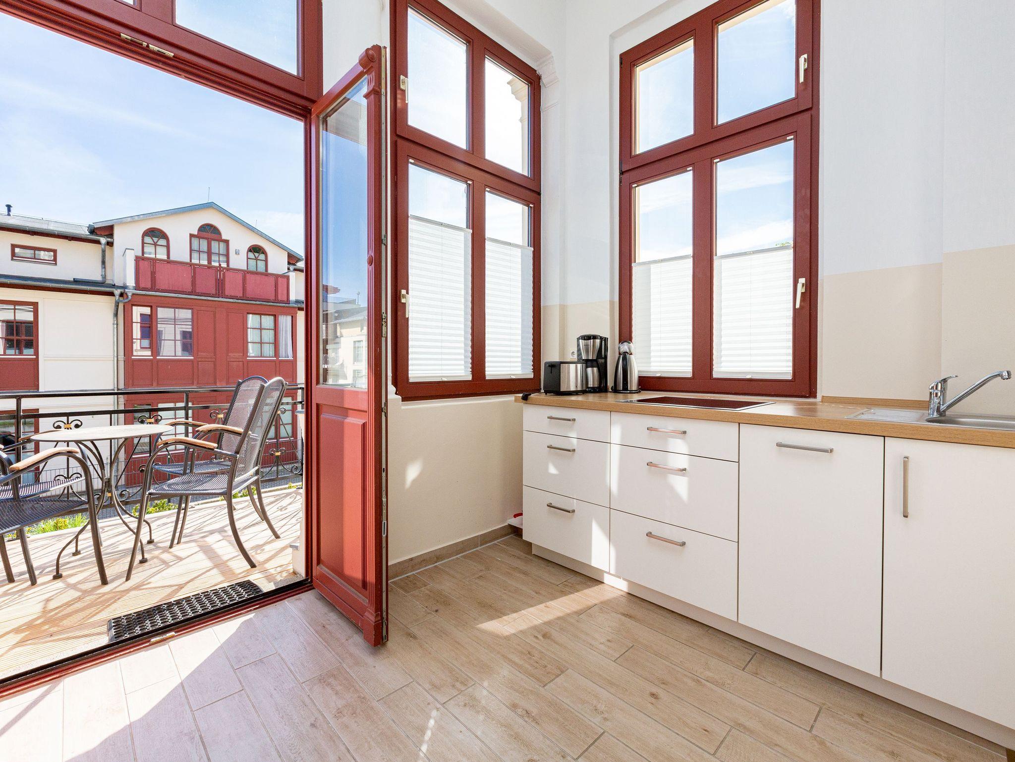 Willkommen in diesem charmanten 3-Raum-Appartement im Hochparterre! Mit einer großzügigen Fläche von 60 qm ist sie ideal für bis zu 3 Personen und ein Kleinkind im Alter von bis zu 3 Jahren (im Kinderreisebett). Hier finden Sie alles, was Sie für einen komfortablen und erholsamen Aufenthalt für Ihren Usedomurlaub benötigen. Das Wohnzimmer lädt mit einer gemütlichen Sitzgruppe und einem TV zum Entspannen und Verweilen ein. Von hier aus gelangen Sie auf die angrenzende Loggia, die Ihnen einen wunderbaren Ausblick bietet. Hier befindet sich auch die Küchenzeile und ein Essplatz. Das Appartement verfügt über zwei Schlafzimmer, die mit einem komfortablen Doppelbett und einem Einzelbett ausgestattet sind. Das Badezimmer ist mit einer Dusche und einem WC ausgestattet. Ein PKW-Stellplatz direkt am Haus ist für Ihren Komfort ebenfalls vorhanden. Auf Wunsch stellen wir Ihnen gerne ein Kinderreisebett (ohne zusätzliche Matratze und Bettzeug) und gegen Aufpreis auch einen Kinderhochstuhl zur Verfügung. Um Ihnen einen stressfreien Start in den Urlaub zu ermöglichen, sind die Betten bei Ihrer Ankunft bereits bezogen und Handtücher liegen für Sie bereit (Erstausstattung). Zudem können Sie unser kostenfreies WLAN-Netzwerk im gesamten Haus nutzen.