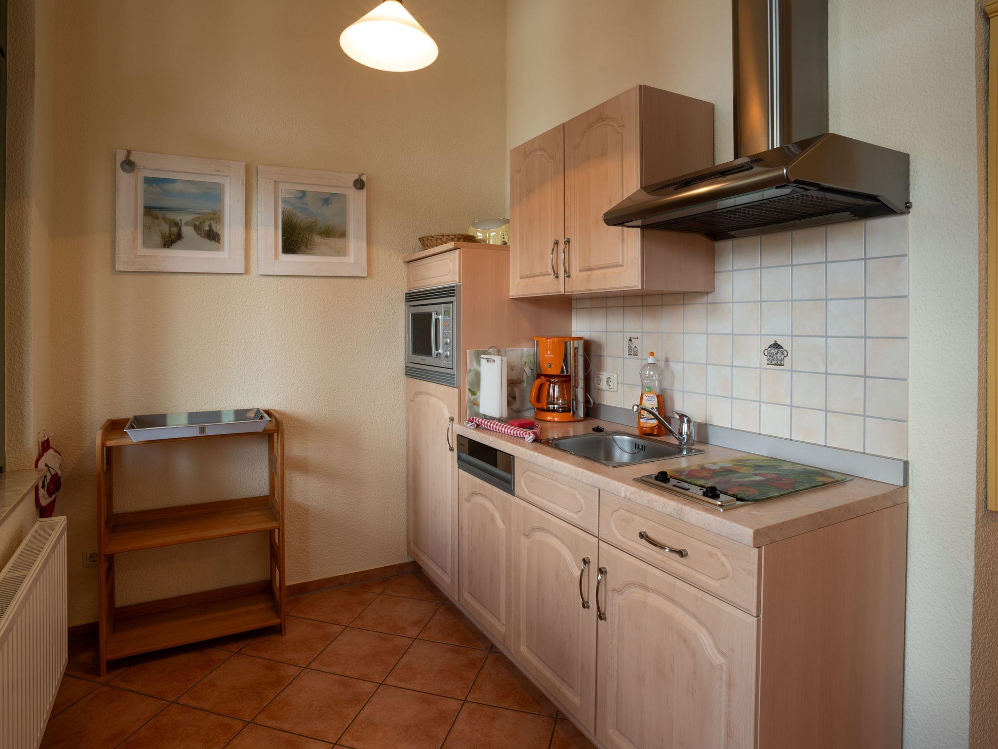 Ceranfeld und Mikrowelle. Bad mit Dusche und WC.