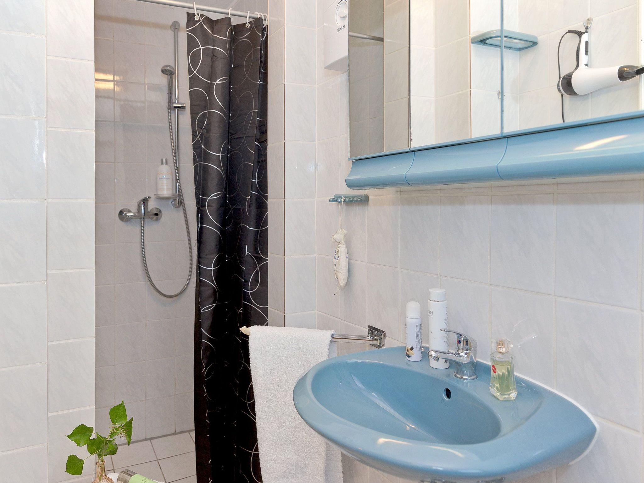 Das Badezimmer mit Fenster verfügt über eine Dusche, ein WC sowie einen Haartrockner und rundet den komfortablen Gesamteindruck ab.
