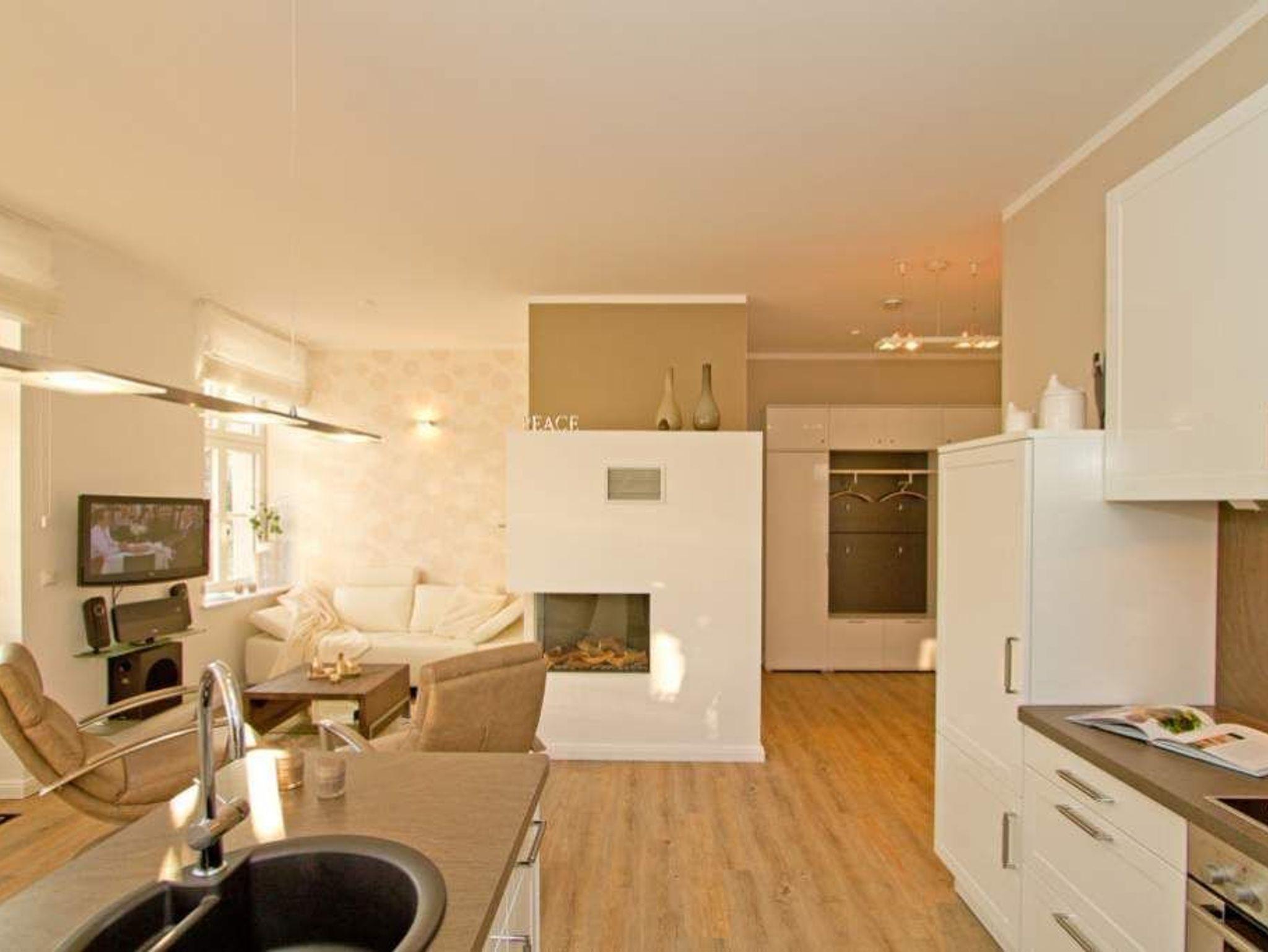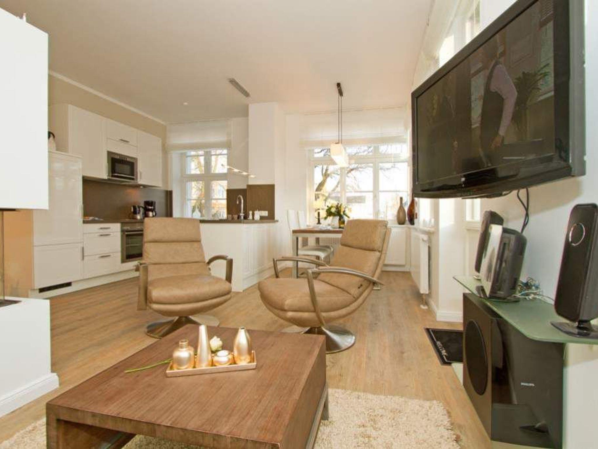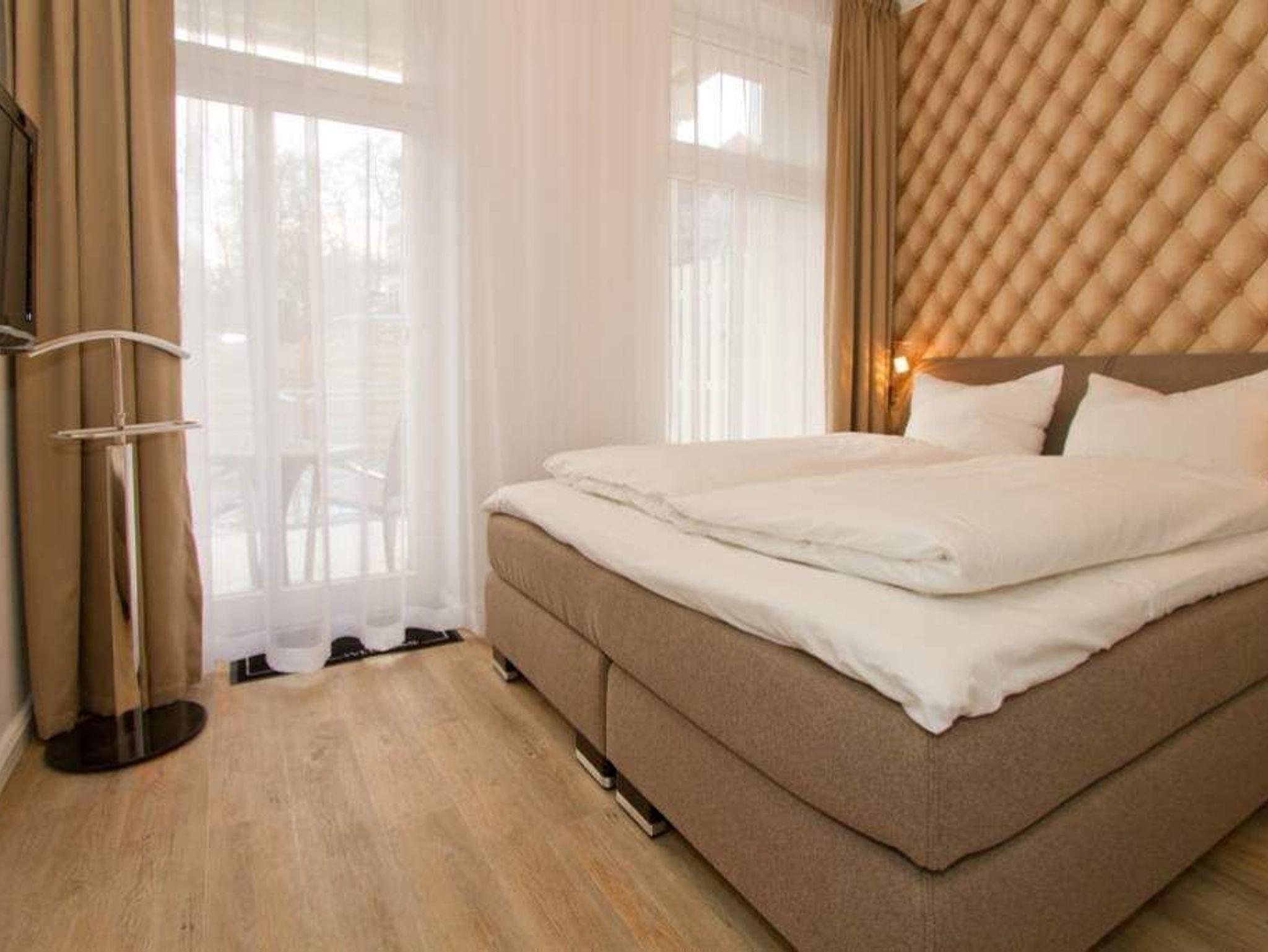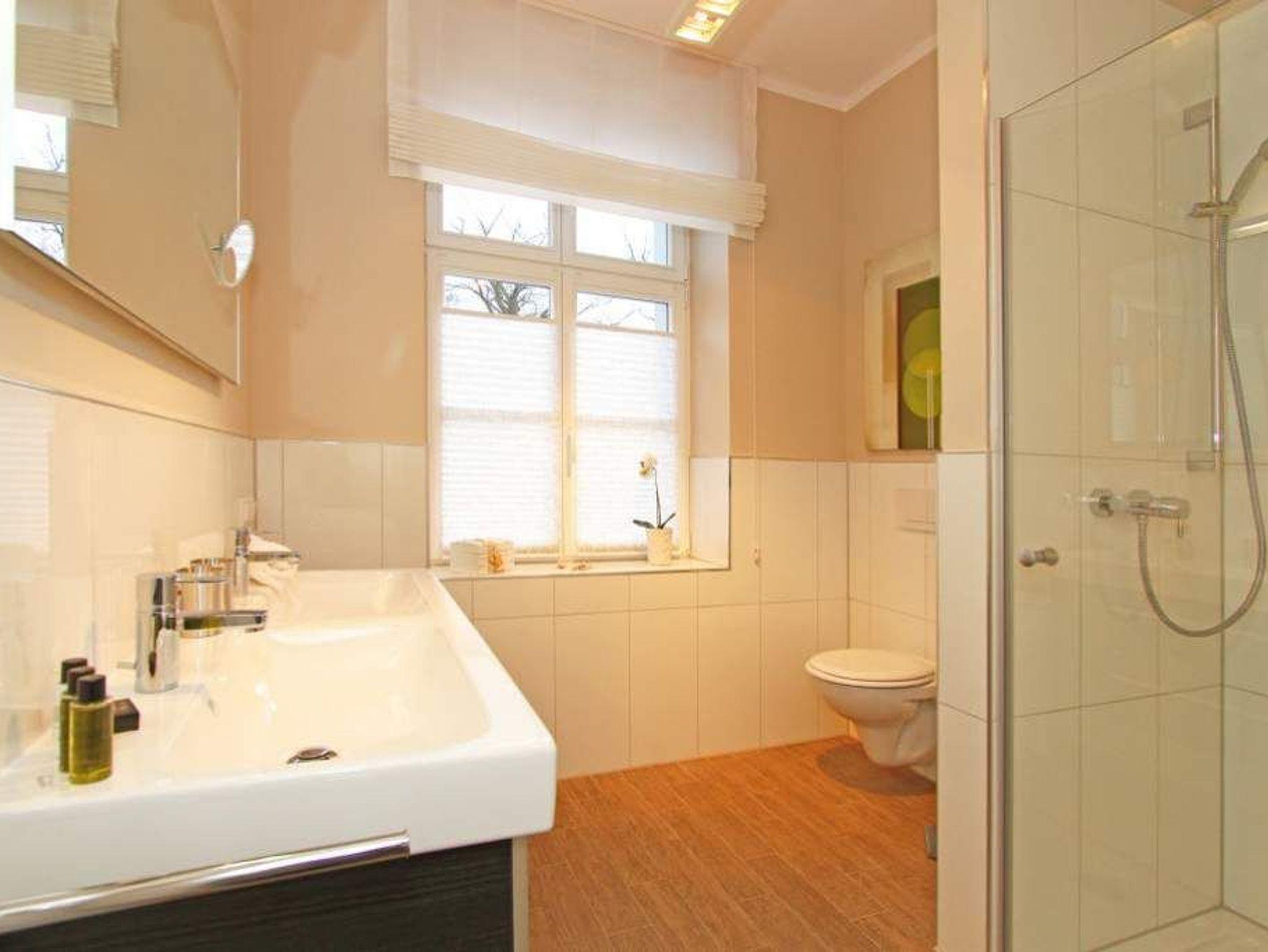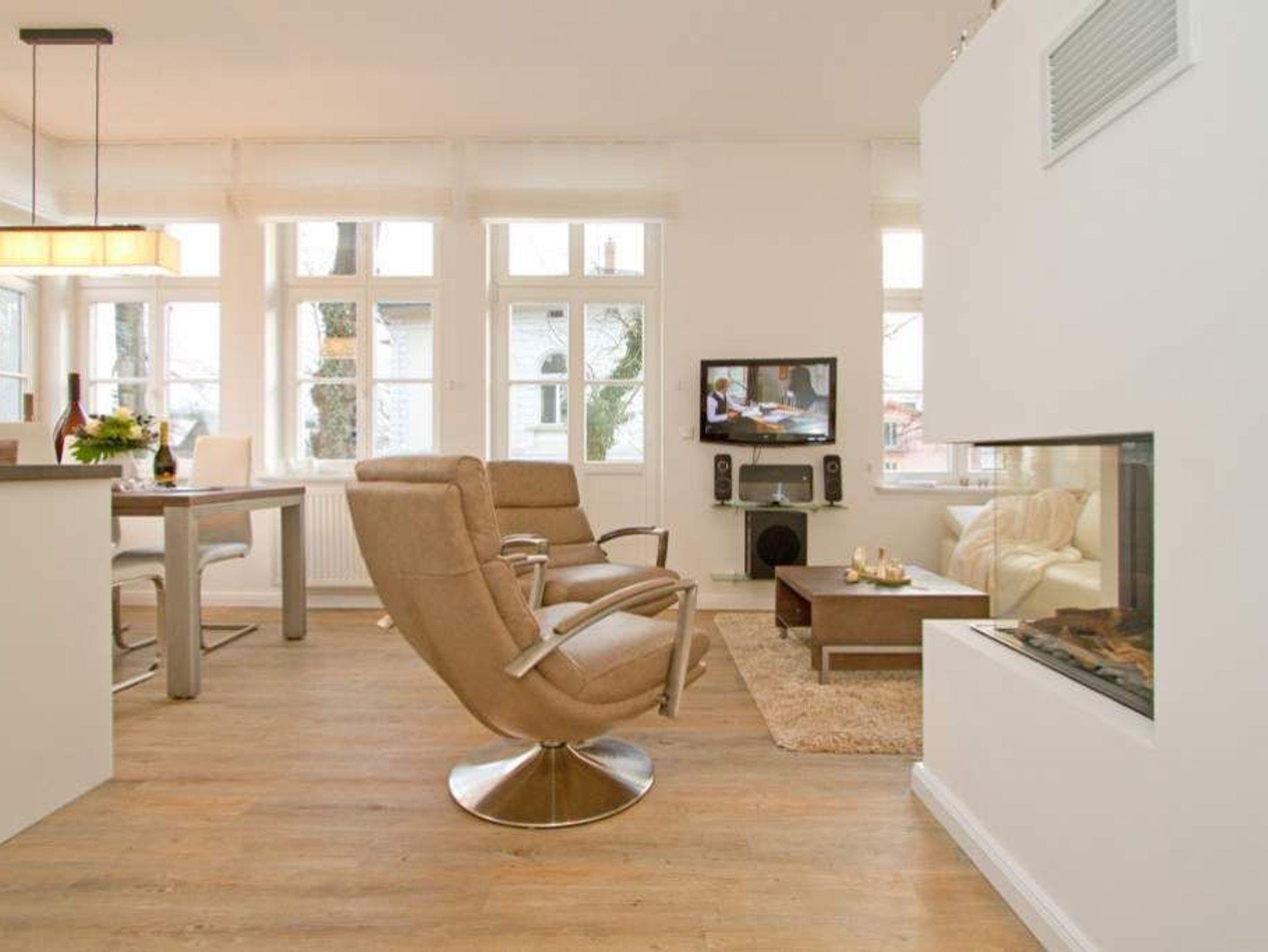 Edle Ausstattung und charmante Details! Willkommen in Ihrem Waldschloss - Urlaubsdomizil! Die großzügige 3-Raum-Ferienwohnung ( 75 qm) für 4 Personen und ein Kleinkind ( bis 3 Jahre im Kinderreisebett) im Erdgeschoss bietet neben ausreichend Platz, eine luxuriöse Ausstattung und Möblierung, die viel Urlaubsflair versprüht. Ausstattungstechnisch wurde selbstverständlich an alles gedacht. Der geschmackvoll möblierte Wohnbereich mit Flat-TV bietet auch einen per Fernbedienung bedienbaren Gas-Designkamin. Ein Highlight besonders in der kalten Jahreszeit. An den schönen Essbereich in der verglasten Veranda, schließt sich eine offene, komplett ausgestattete Küche (auch Waschmaschine vorhanden) an. Auch die beiden Schlafzimmer mit Boxspringbetten ( 1,60 m) für erholsamen Schlaf sind mit je einem Flat-TV ausgestattet. Für Ihren Komfort steht die Erstausstattung Wäsche (Bettwäsche, 1 Duschtuch [&] 2 kleine Handtücher) für Sie bereit. Ergänzt wird die Wohnung durch ein schönes Bad mit Doppelwaschtisch und Echtglasdusche und ein Gäste-WC. Wer keine Lust auf Strand hat, macht es sich auf den beiden großen und sonnigen Terrassen gemütlich, bequeme Gartenmöbel, ein eigener Strandkorb und eine Sonnenliege warten hier auf Sie. Für Kleinkinder können ein Kinderreisebett (ohne Matratze und Kinderbettzeug) und ein Kinderhochstuhl gegen einen Aufpreis bestellt werden. Das WLAN-Netz im Haus kann kostenfrei genutzt werden.