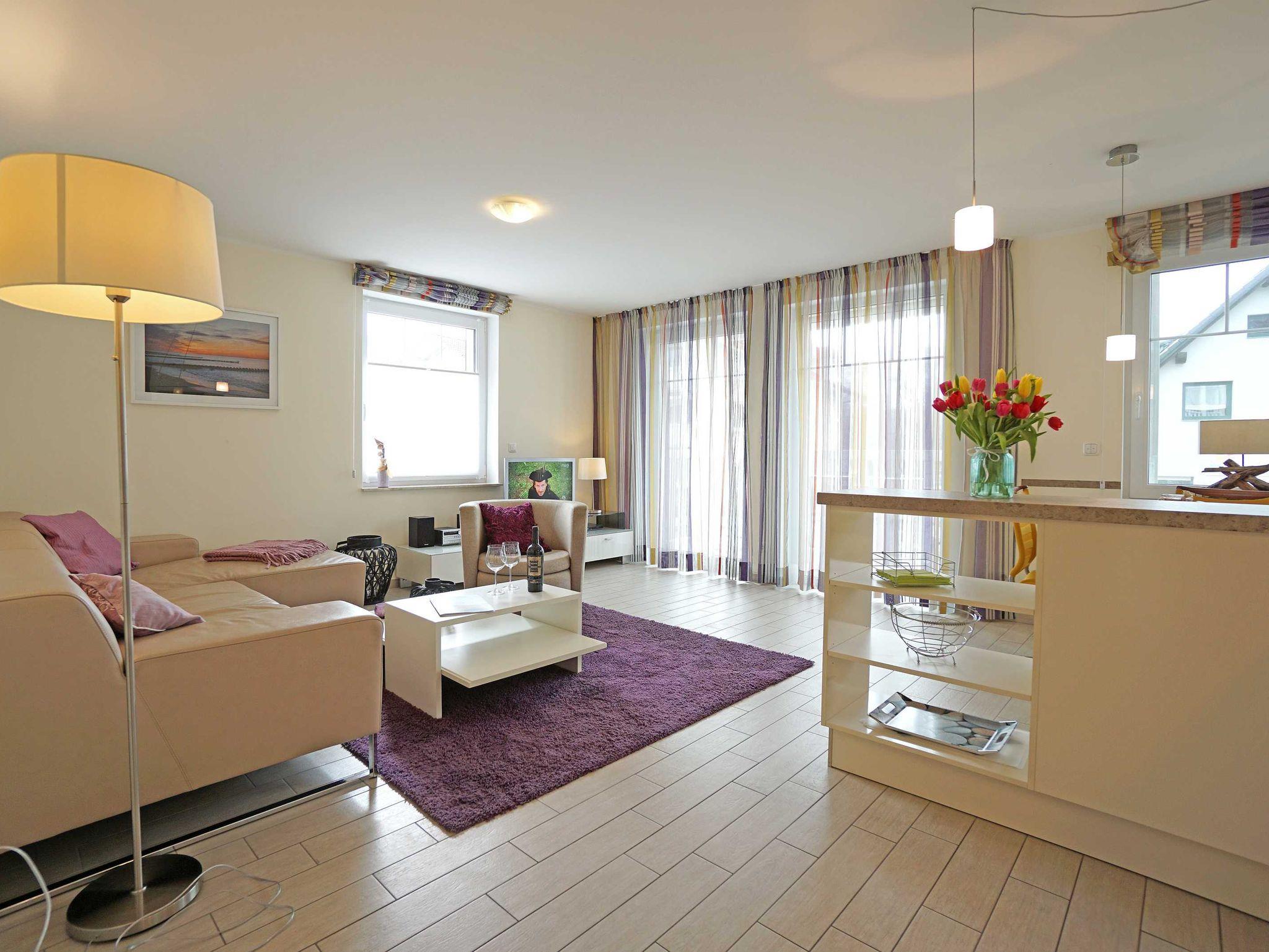 Moderne, stilvoll eingerichtete 2-Zimmer-Ferienwohnung im Erdgeschoss 46 qm, Wohnzimmer mit Sitzgruppe, komplett ausgestattete Küchenzeile mit Essbereich, Schlafzimmer mit Doppelbett, Bad mit Dusche und WC, Balkon, Pkw Tiefgaragenstellplatz.