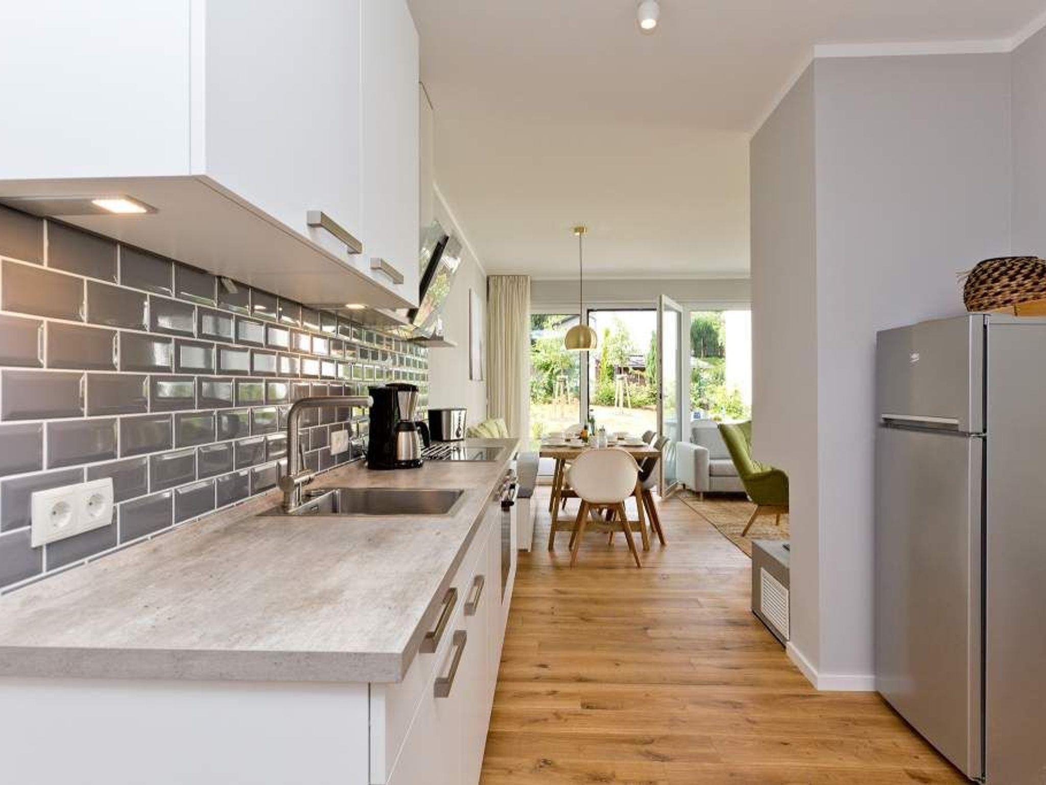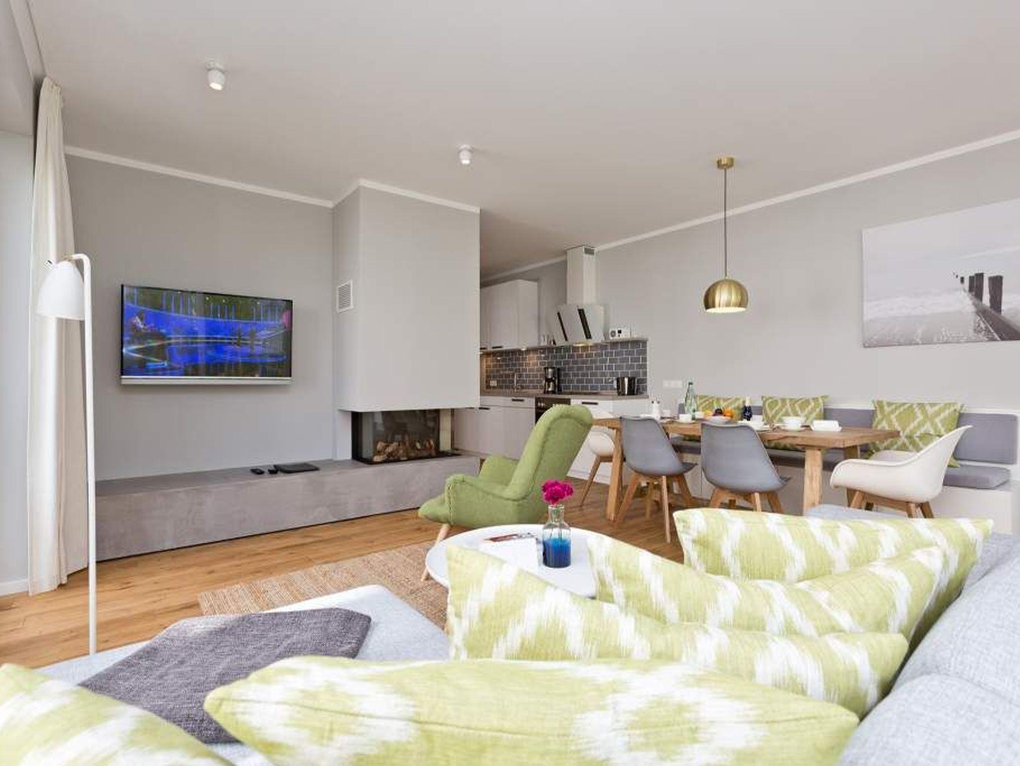 Treten Sie ein in ein Wohlfühldomizil der Extraklasse. Sonne pur empfängt Sie auf der großen Südwest-Terrasse dieses wunderschön und elegant eingerichteten 3-Raum-Appartements im Erdgeschoss der Villa Strandgrün. Nordisch nobel sorgt die Kombination aus grauen Wänden mit echtem Eichenholzparkett, den Metrofliesen der offenen Küche und den skandinavischen Design-Möbeln für ein edles Ambiente und viel Gemütlichkeit. Die 80 Quadratmeter große Wohnung für 4 Personen verfügt über zwei Schlafzimmer mit extra angefertigten Einbauschränken und hochwertigen Boxspringbetten (1,80 m x 2,00 m und 1,60 m x 2,00 m). Jeder Schlafraum ist mit einem Flat-TV ausgestattet. Der Wohnbereich mit großer Wohlfühllandschaft, Gas-Kamin und einem Essbereich mit edlem Echtholztisch lädt zum Entspannen und Wohlfühlen ein. Auch hier gibt es einen großen Flat-TV. Die Ferienwohnung wartet mit zwei Luxusbädern mit Waschtisch und WC auf. Highlight des Masterbades ist die große Panorama-Sauna mit Glasfront und großzügiger Dusche. Das zweite Bad verfügt über eine Badewanne. Die Küche ist voll ausgestattet. Für einen unbeschwerten Urlaub ist die Erstausstattung mit Wäsche inklusive. Das WLAN-Netz ist kostenfrei nutzbar.