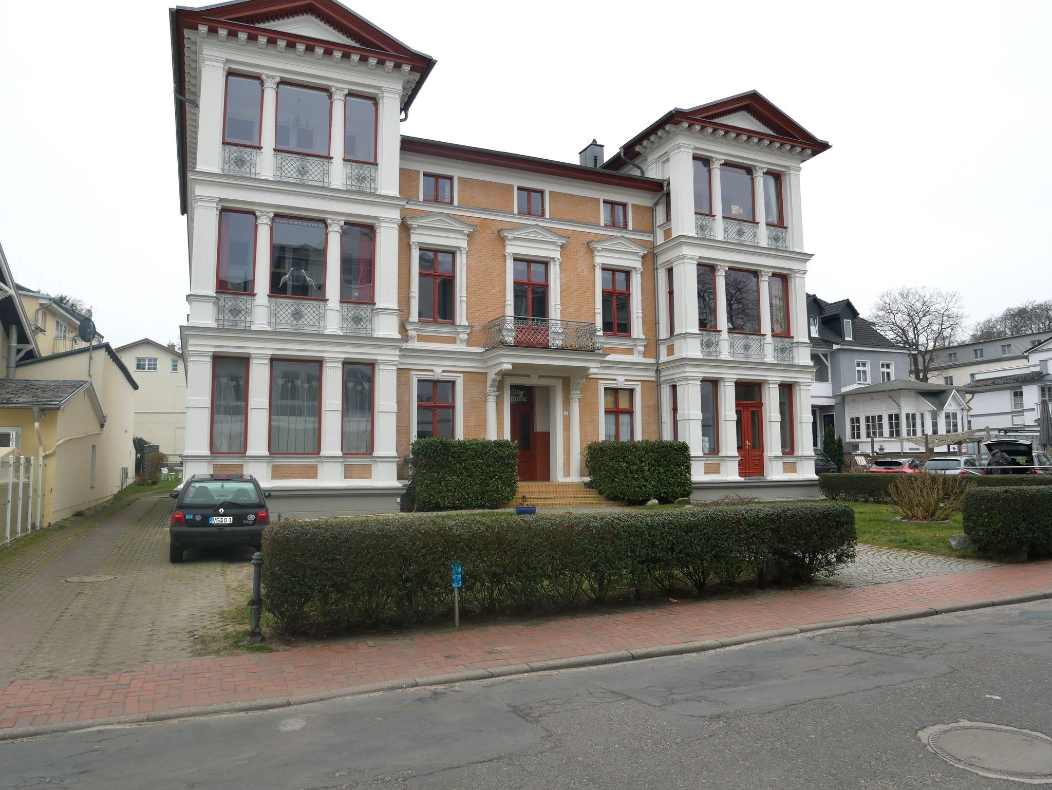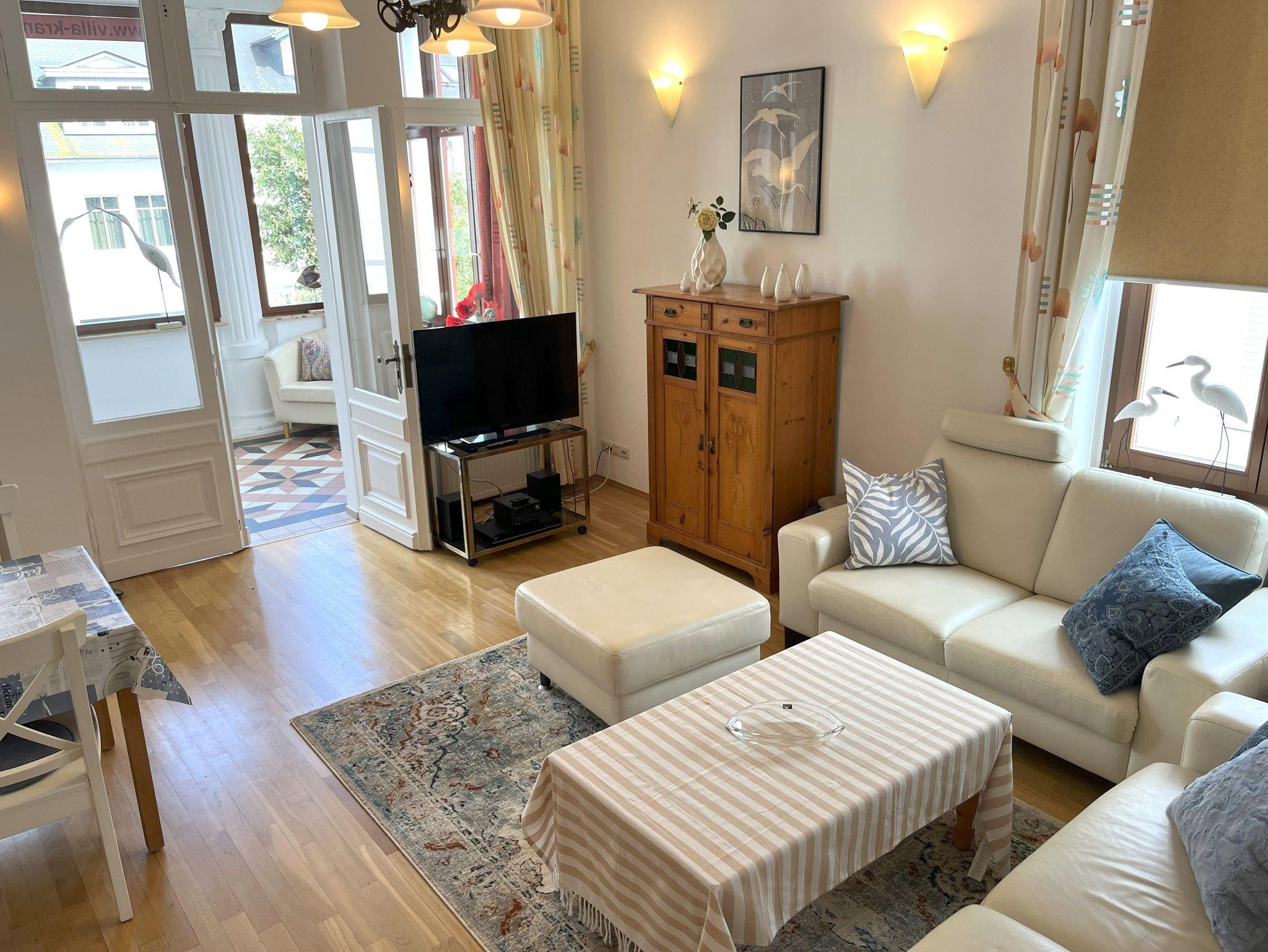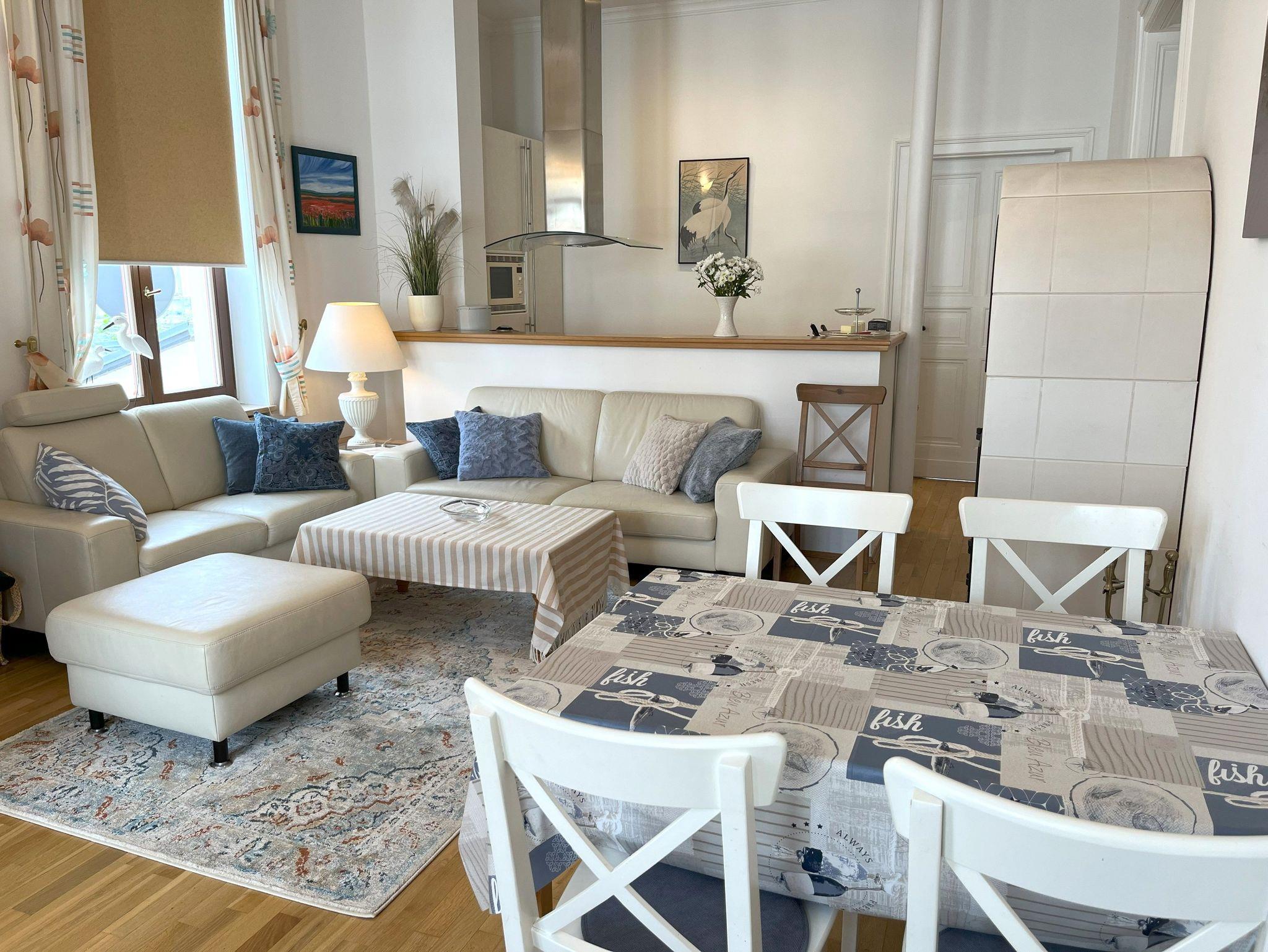 Die ca. 80 qm große Ferienwohnung befindet sich im 1. Obergeschoß der Villa Kramme. Der lichtdurchflutete Wohnraum besteht aus einer offenen Küchenzeile ausgestattet mit Kühlschrank mit Gefrierfach, Cerankochfeld, Backofen, Spülmaschine, Mikrowelle, Wasserkocher, Toaster, und Kaffeemaschine. Im Wohnbereich befindet sich der Esstisch mit Stühlen, einer Sitzgruppe aus Leder, Flachbild TV und einem Kamin. In der geschlossenen Loggia steht die Schlafcouch für die Aufbettung der 3+ 4 Person und 2 Ledersessel mit kleinen Tisch.