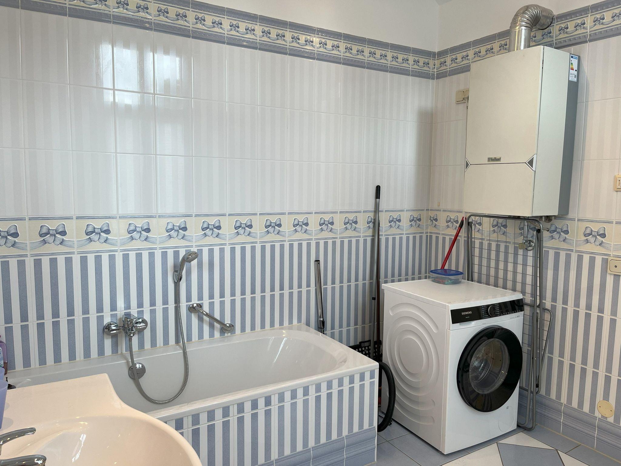 Das große Schlafzimmer verfügt über ein Doppelbett, Kleiderschrank und Kinderbett. Vom Schlafzimmer aus gelangen Sie in das große Tageslicht Badezimmer mit Badewanne, WC, Waschmaschine. Das zweite Badezimmer ist mit Dusche und WC ausgestattet.