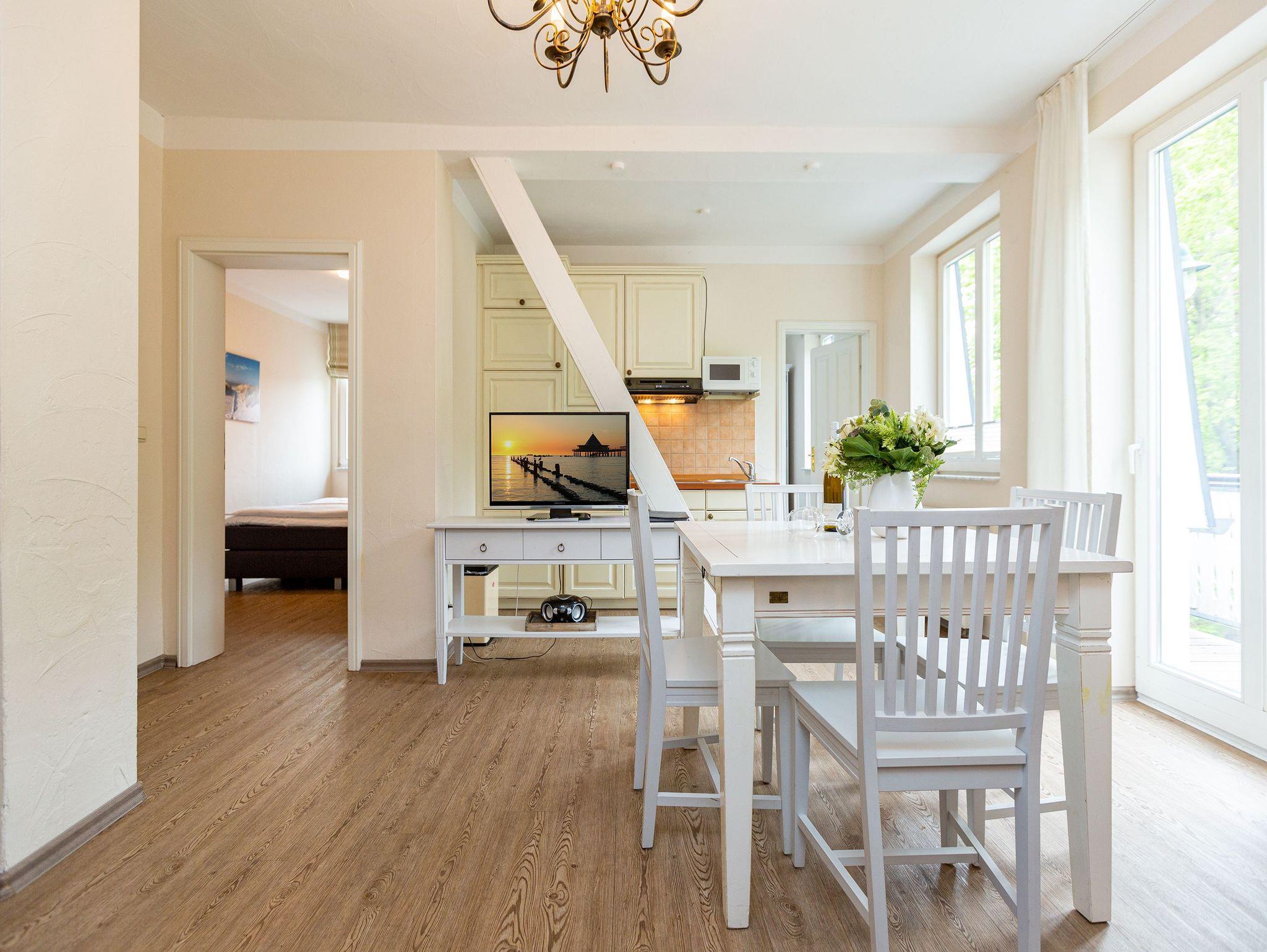 Ein Paradies mit schönen Balken, offen, licht und geschmackvoll eingerichtet erwartet Ostseeliebhaber direkt unter dem Dach der wunderschönen alten Bädervilla Amelia. Hier können Sie den Charme der Kaiserzeit noch spüren, ohne auf den modernen Komfort verzichten zu müssen. Vom großen und lichtdurchfluteten Wohnzimmer können Sie mitten hineintreten in die Usedomer Sonne. Ein Südbalkon lädt zum ausgiebigen Sonnenbaden ein. Hier können Sie auch gemütlich essen und zusammensitzen. An kühleren Tagen bietet sich dafür der schöne Esstisch in der offenen Wohnküche an. Zu der gehören alle Geräte, die zum Kochen, Backen und Zubereiten leckerer Speisen nötig sind ? inklusive erlesenem Geschirr. Auf der komfortablen Vintage-Sitzgruppe lässt es sich herrlich entspannen. Der große Flat-TV oder das Radio mit CD Player sorgen für Unterhaltung. Das Appartement 12 besitzt zwei Schlafzimmer, die Platz für bis zu vier Personen bieten. Zwei[nbsp][nbsp]Boxspringdoppelbetten verführen nicht nur zum Schlafen. Genießen Sie die Ruhe der sie umgebenden Villengegend mit viel Grün. Die Ostsee ? gerade einmal einen Steinwurf entfernt ? rauscht an manchen Tagen sanft bis in Ihre Träume. Das Zustellen eines Kinderreisebettes (ohne zusätzliche Matratze [&] Bettzeug) ist möglich. Auch können wir gegen einen Aufpreis einen Kinderhochstuhl zur Verfügung stellen. Das Badezimmer mit edlem Marmor gefliest verfügt über eine Dusche, einen Waschtisch und ein WC. Für Ihren Pkw gibt es am Haus einen Stellplatz. Das WLAN Netz im Haus kann kostenfrei genutzt werden. Bei Anreise haben wir Ihre Betten bereits bezogen und Handtücher für Sie bereit gelegt.
