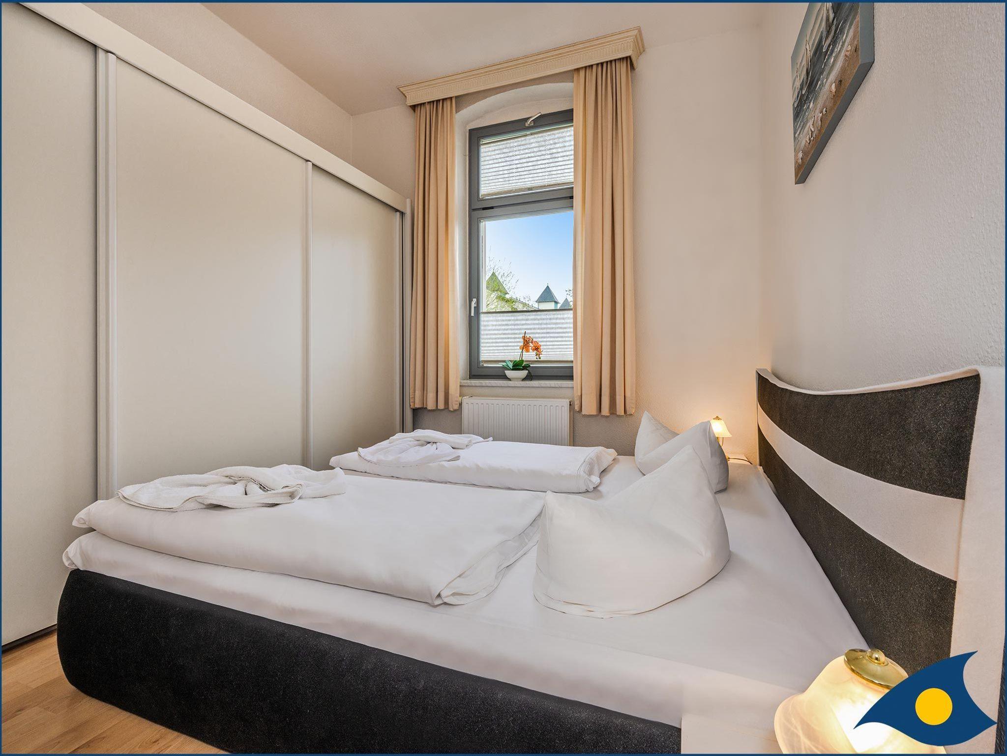 Der Schlafraum zur Hofseite ist mit einem bequemen Doppelbett und einem großen Kleiderschrank ausgestattet. Hier erholen Sie sich von Ihren Ausflügen auf der Insel und finden genügend Platz für Ihre Urlaubsgarderobe. Das Badezimmer mit WC und Dusche trägt zum Wohlfühlen bei.