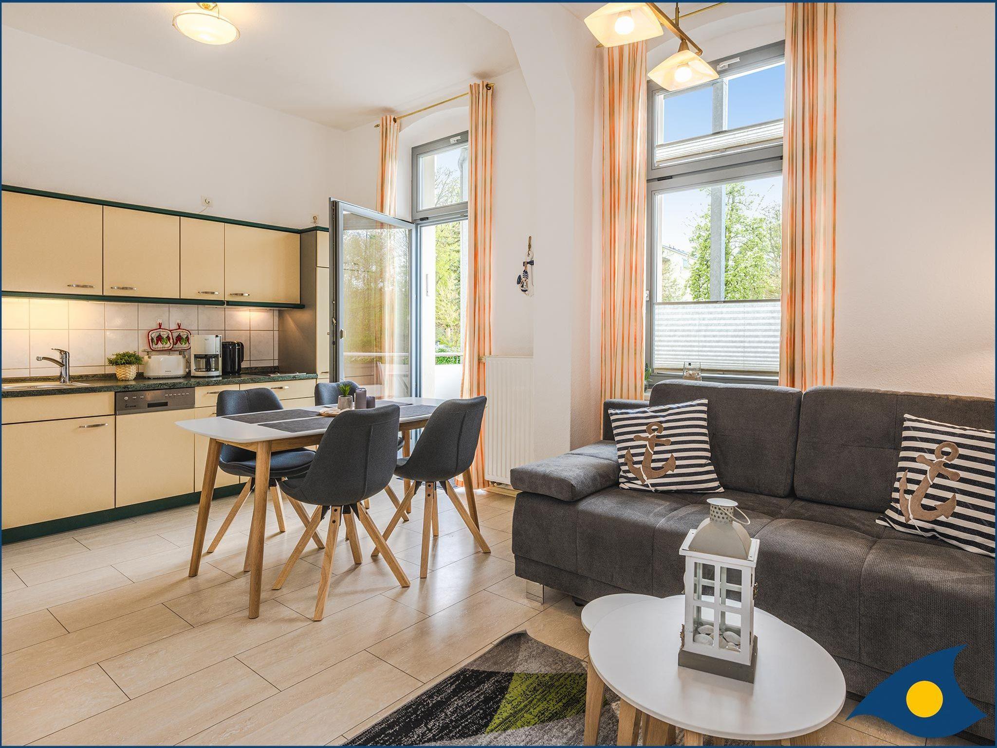 Zu diesem Traumappartement gehört ein wunderschöner, in Richtung Westen (Hofseite) ausgerichteter Balkon. Der großzügige Wohnraum lädt zum Kochen, Schlemmen, Fernsehen oder einem Spieleband mit der Familie oder Freunden ein. Die Küchenzeile bietet Ihnen alles, was Sie für die Zubereitung eines morgendlichen Frühstücks oder Ihres Lieblingsessens benötigen. Der Geschirrspüler kümmert sich um den Abwasch. So haben Sie mehr Zeit um die Sehenswürdigkeiten der Insel zu besichtigen, an der Promenade zu flanieren oder für das Bad in der Ostsee. Der Essbereich grenzt an der Küchenzeile an und ist hell am Fenster gelegen.