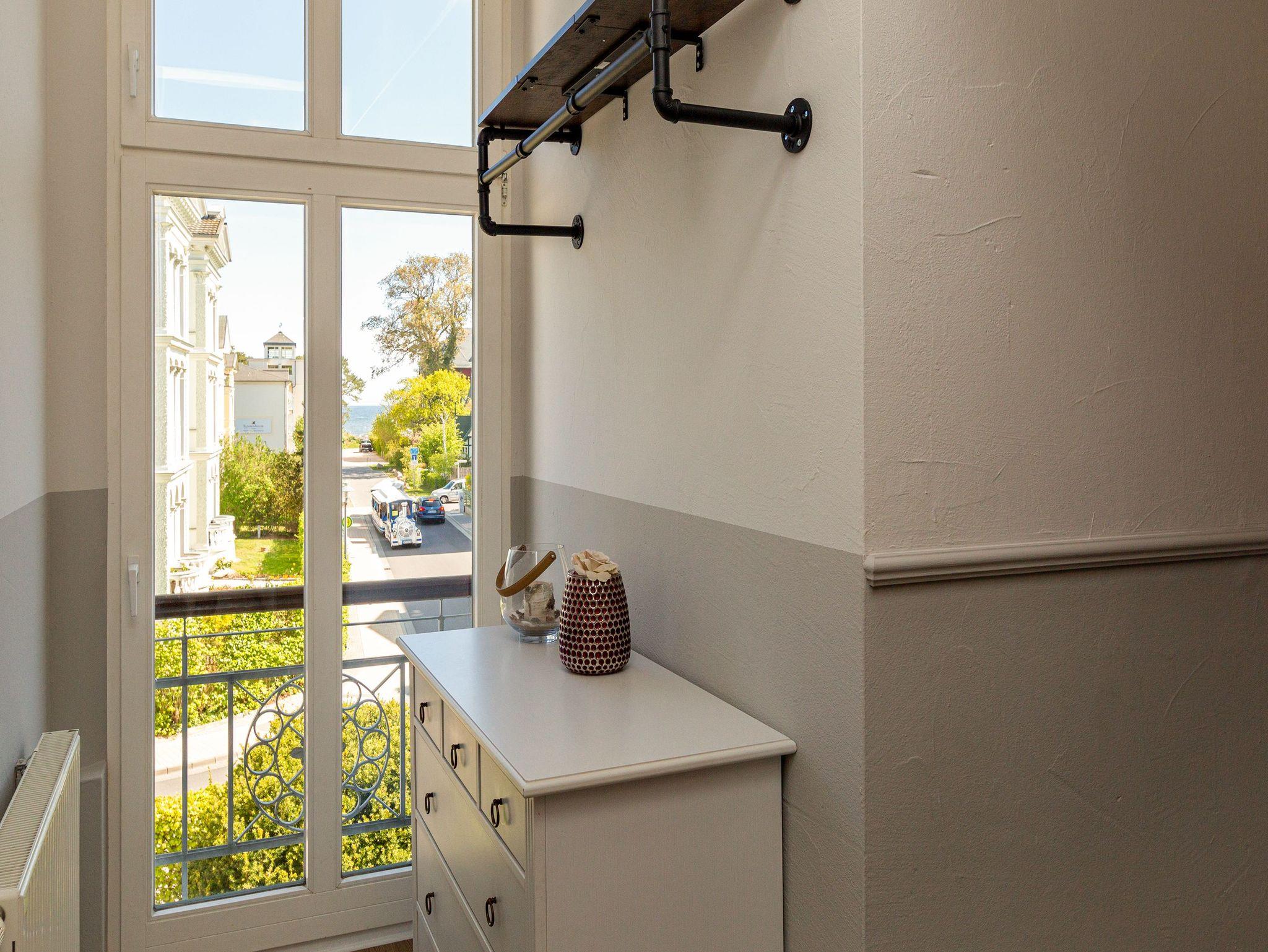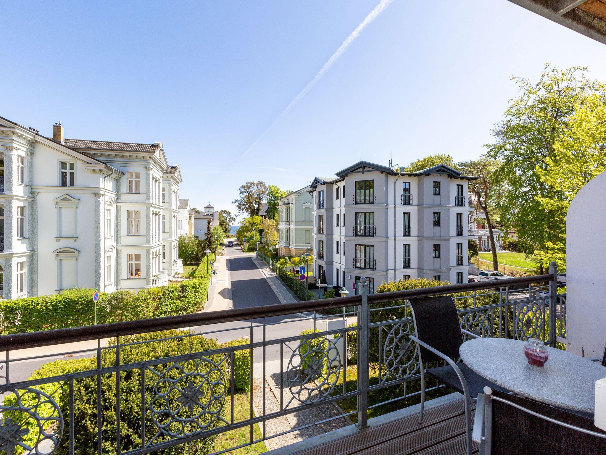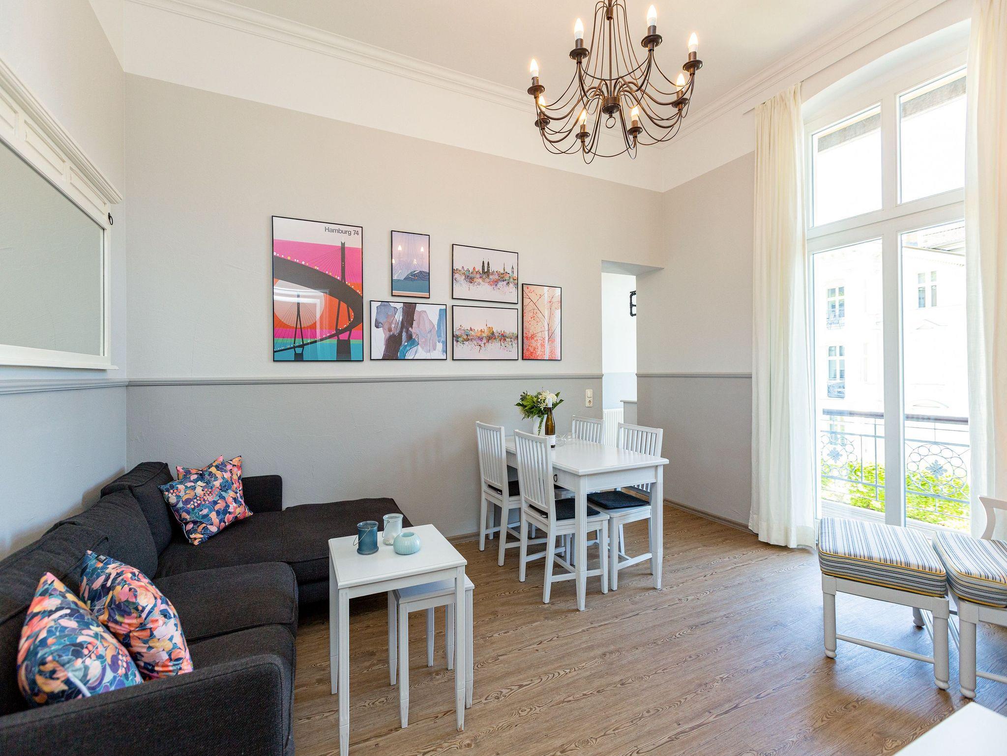 Hohe, luftige Räume, Stuck an der Decke, Zierleisten an den Wänden, ausgewählte und erlesene Möbel ? was so eine richtige Bädervilla ist, kann damit seine Besucher in eine elegante und mondäne Welt entführen. So auch das Appartement Nummer 6 in der wunderschön sanierten alten Villa Amelia im 1. Obergeschoss. Kaiserzeitliches Flair durchzieht die drei Räume, in denen bis zu 3 Erwachsene [&] 1 Kind bis 15 Jahre eine wahrhaft exklusive Auszeit nehmen können. Edles Weiß und Möbel im Vintage-Stil bestimmen die Einrichtung. Viel Platz haben Sie auf der gemütlichen Sitzgruppe. Ein Flat-TV gehört zum Home-Entertainment dazu. Außerdem lädt ein schöner Essplatz zum Dinieren und Zusammensitzen ein. Treten Sie hinaus auf den Balkon und atmen Sie die frische Salzluft der nur ein paar Meter entfernten Ostsee tief ein. Sie ist nicht nur gesundheitsfördernd, sondern pustet so manches Mal den Kopf gehörig durch, befreit die Gedanken vom Stress des Alltags. Erholsame Träume kommen in den beiden gemütlichen Schlafzimmern ? ausgestattet mit komfortablen Boxspringdoppelbetten und großen Schränken ? nach einem Tag am Strand von ganz allein. Kommt der Appetit, können Sie sich in der offenen Küche nach Herzenslust bekochen. Sie ist voll ausgestattet. Geschirr finden Sie in den Schränken. Auch das Badezimmer lässt Sie in Ihrem exklusiven Anspruch nicht im Stich. Feiner Marmor, eine Dusche, Waschtisch und WC gehören zur Ausstattung. Entspannen Sie ohne Sorgen. Denn Handtücher liegen bei der Anreise bereit und die Betten sind bezogen. Das WLAN Netz im Haus kann kostenfrei genutzt werden.