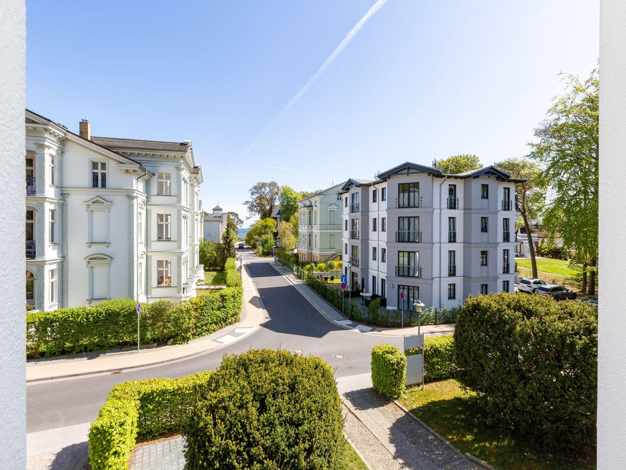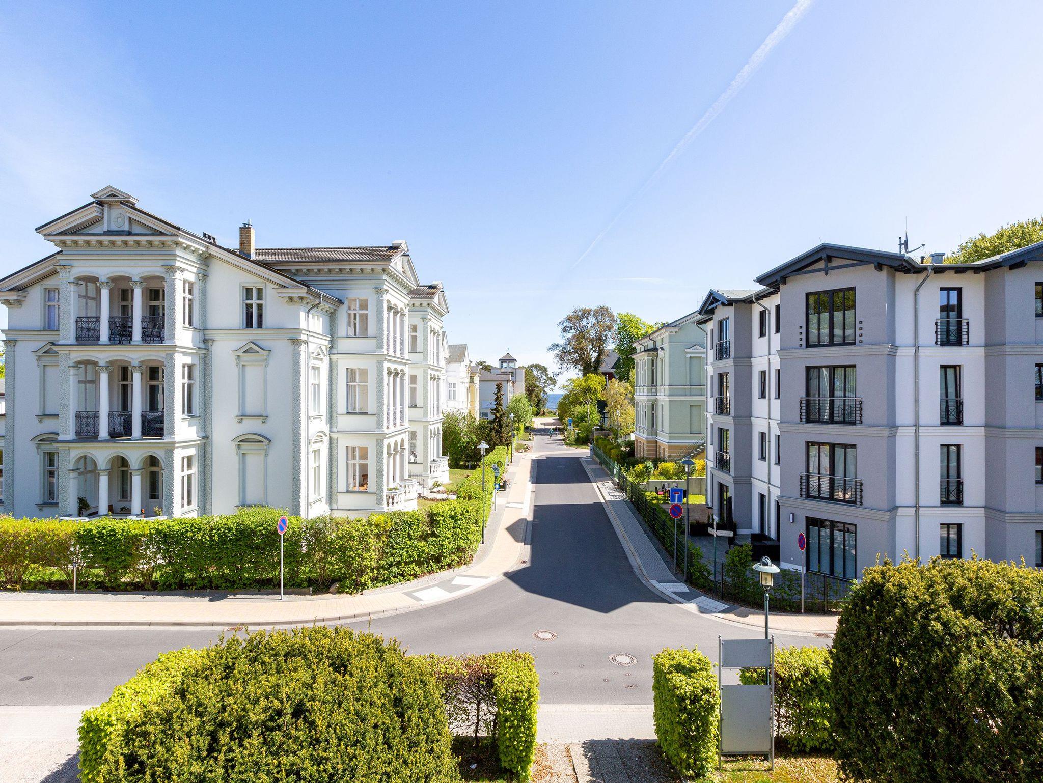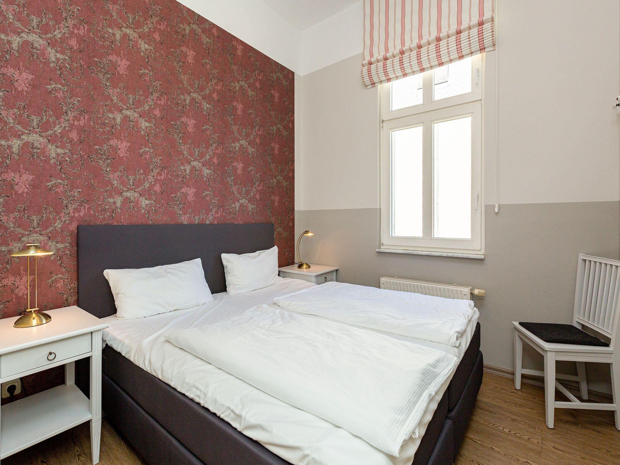 Hohe, luftige Räume, Stuck an der Decke, Zierleisten an den Wänden, ausgewählte und erlesene Möbel ? was so eine richtige Bädervilla ist, kann damit seine Besucher in eine elegante und mondäne Welt entführen. So auch das Appartement Nummer 6 in der wunderschön sanierten alten Villa Amelia im 1. Obergeschoss. Kaiserzeitliches Flair durchzieht die drei Räume, in denen bis zu 3 Erwachsene [&] 1 Kind bis 15 Jahre eine wahrhaft exklusive Auszeit nehmen können. Edles Weiß und Möbel im Vintage-Stil bestimmen die Einrichtung. Viel Platz haben Sie auf der gemütlichen Sitzgruppe. Ein Flat-TV gehört zum Home-Entertainment dazu. Außerdem lädt ein schöner Essplatz zum Dinieren und Zusammensitzen ein. Treten Sie hinaus auf den Balkon und atmen Sie die frische Salzluft der nur ein paar Meter entfernten Ostsee tief ein. Sie ist nicht nur gesundheitsfördernd, sondern pustet so manches Mal den Kopf gehörig durch, befreit die Gedanken vom Stress des Alltags. Erholsame Träume kommen in den beiden gemütlichen Schlafzimmern ? ausgestattet mit komfortablen Boxspringdoppelbetten und großen Schränken ? nach einem Tag am Strand von ganz allein. Kommt der Appetit, können Sie sich in der offenen Küche nach Herzenslust bekochen. Sie ist voll ausgestattet. Geschirr finden Sie in den Schränken. Auch das Badezimmer lässt Sie in Ihrem exklusiven Anspruch nicht im Stich. Feiner Marmor, eine Dusche, Waschtisch und WC gehören zur Ausstattung. Entspannen Sie ohne Sorgen. Denn Handtücher liegen bei der Anreise bereit und die Betten sind bezogen. Das WLAN Netz im Haus kann kostenfrei genutzt werden.