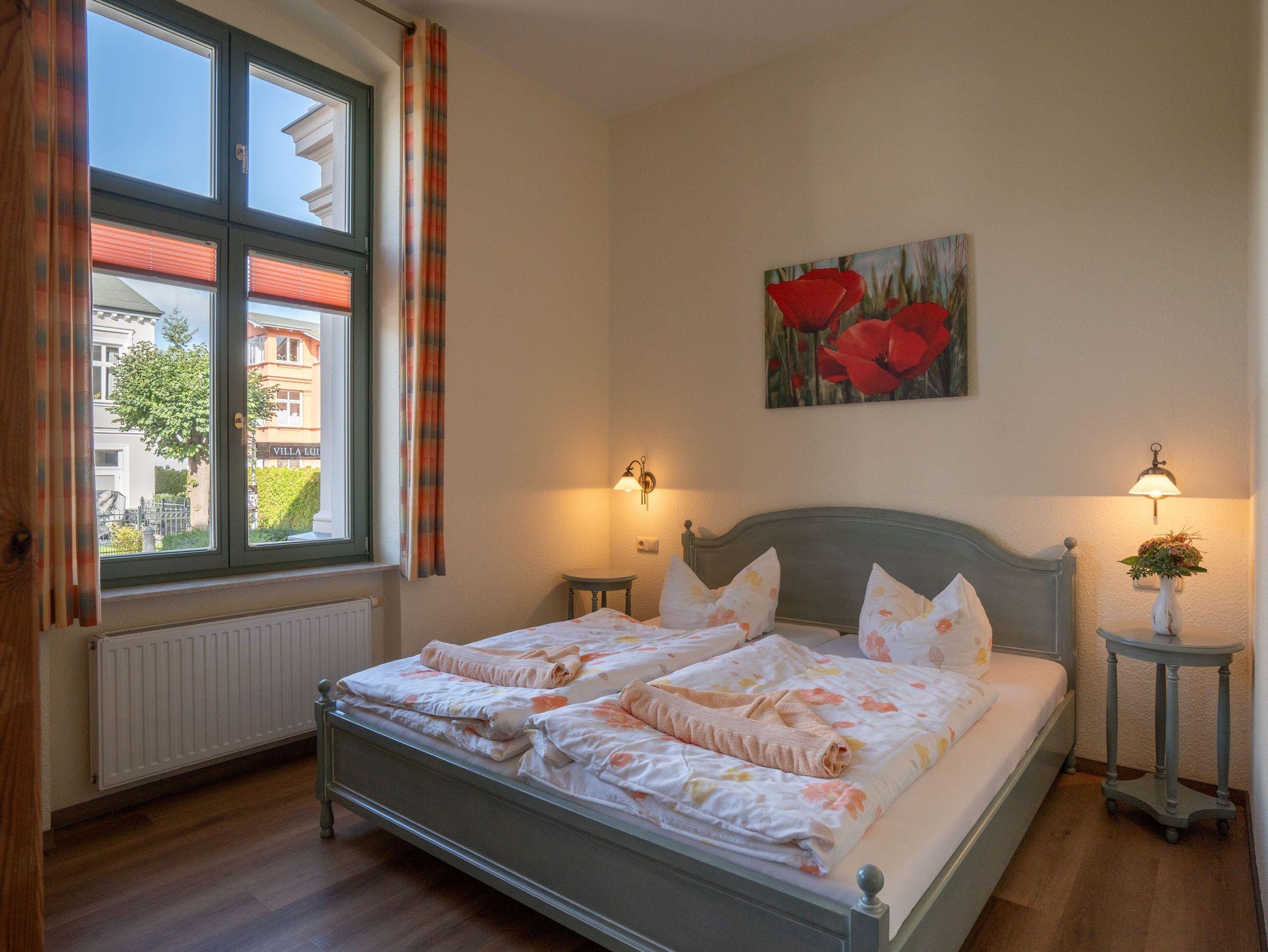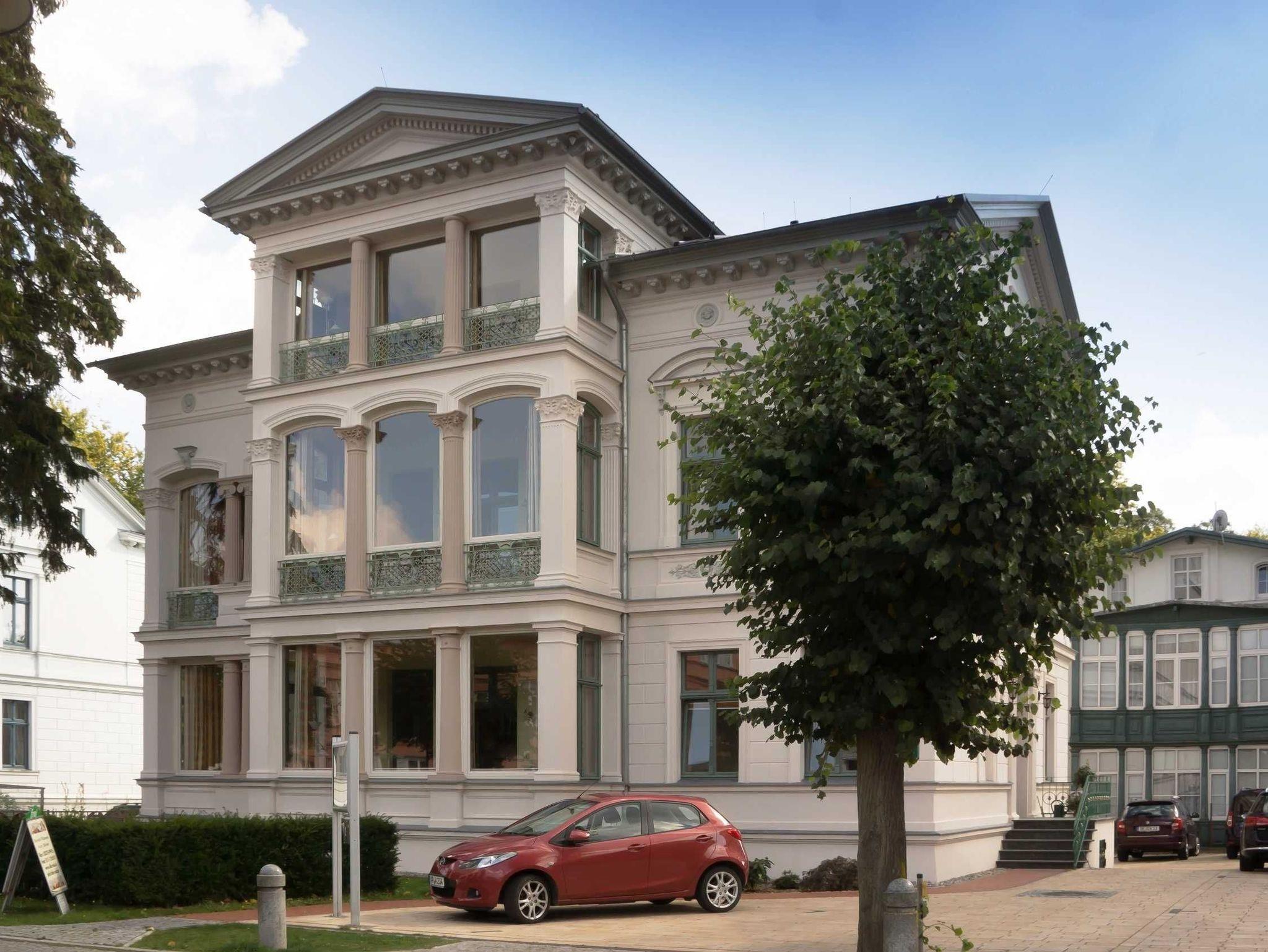 Auf der Terrasse vor dem Haus (Gemeinschaftsnutzung) haben Sie einen herrlichen Blick auf die alten Villen im Stil der Bäderarchitektur.
