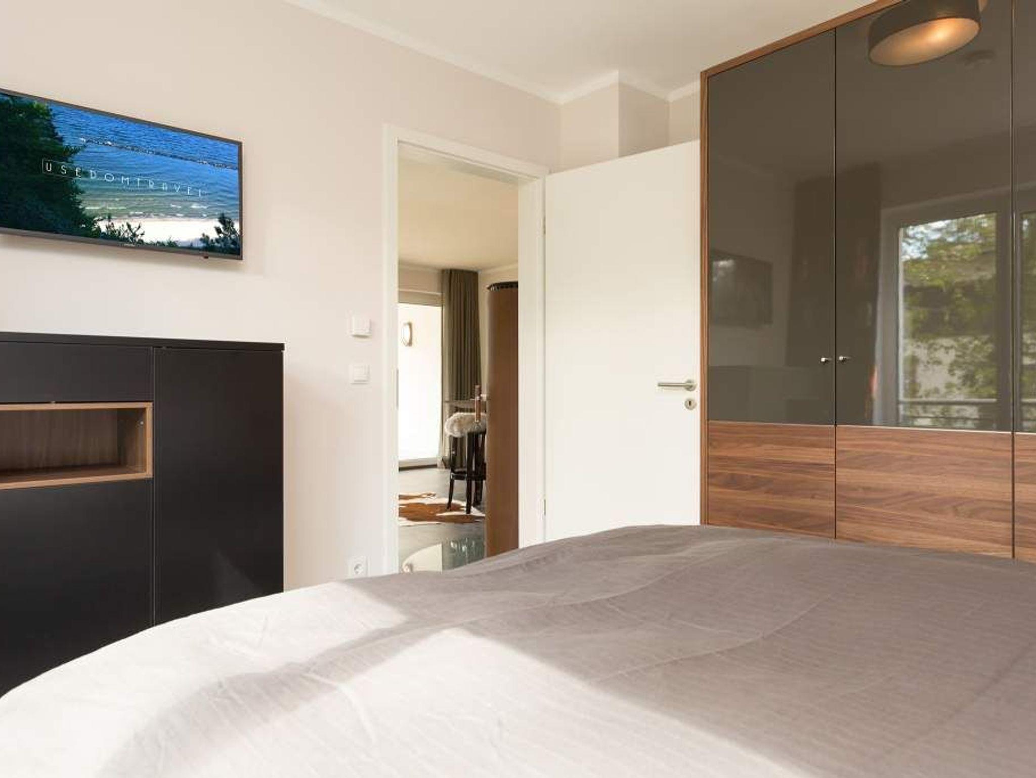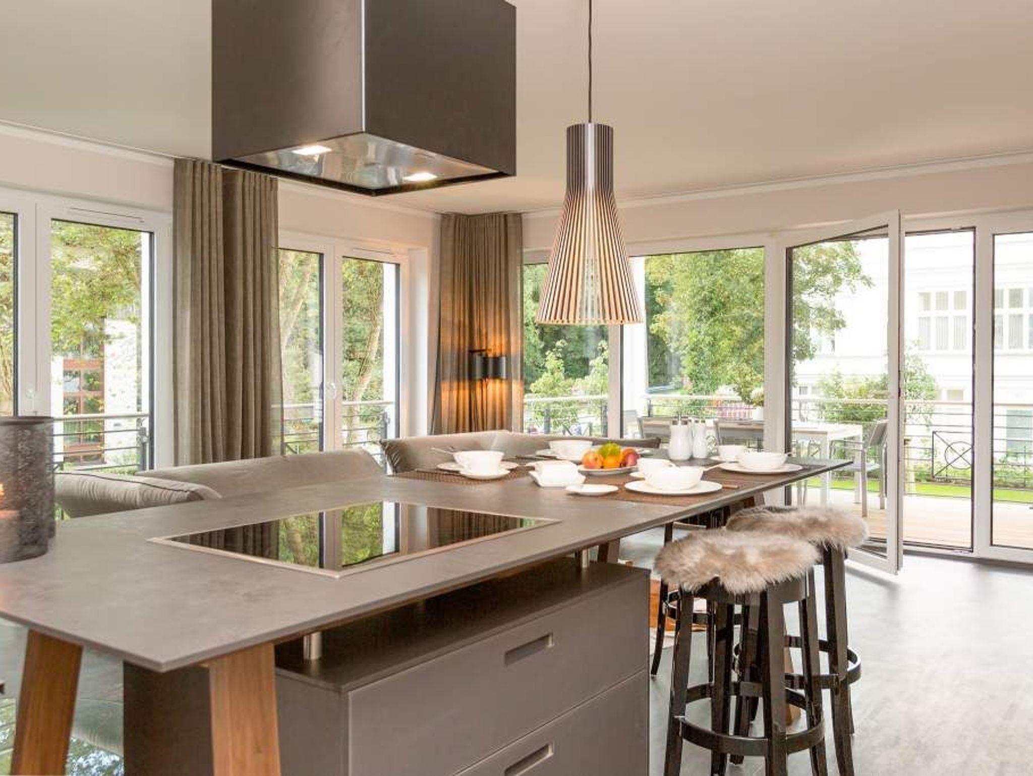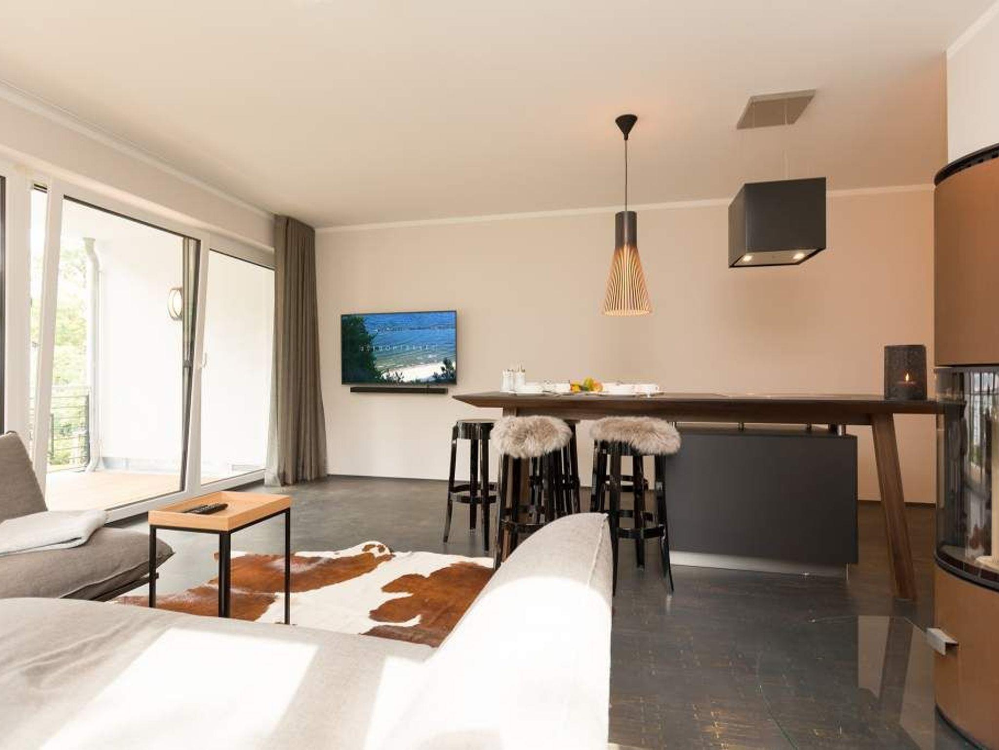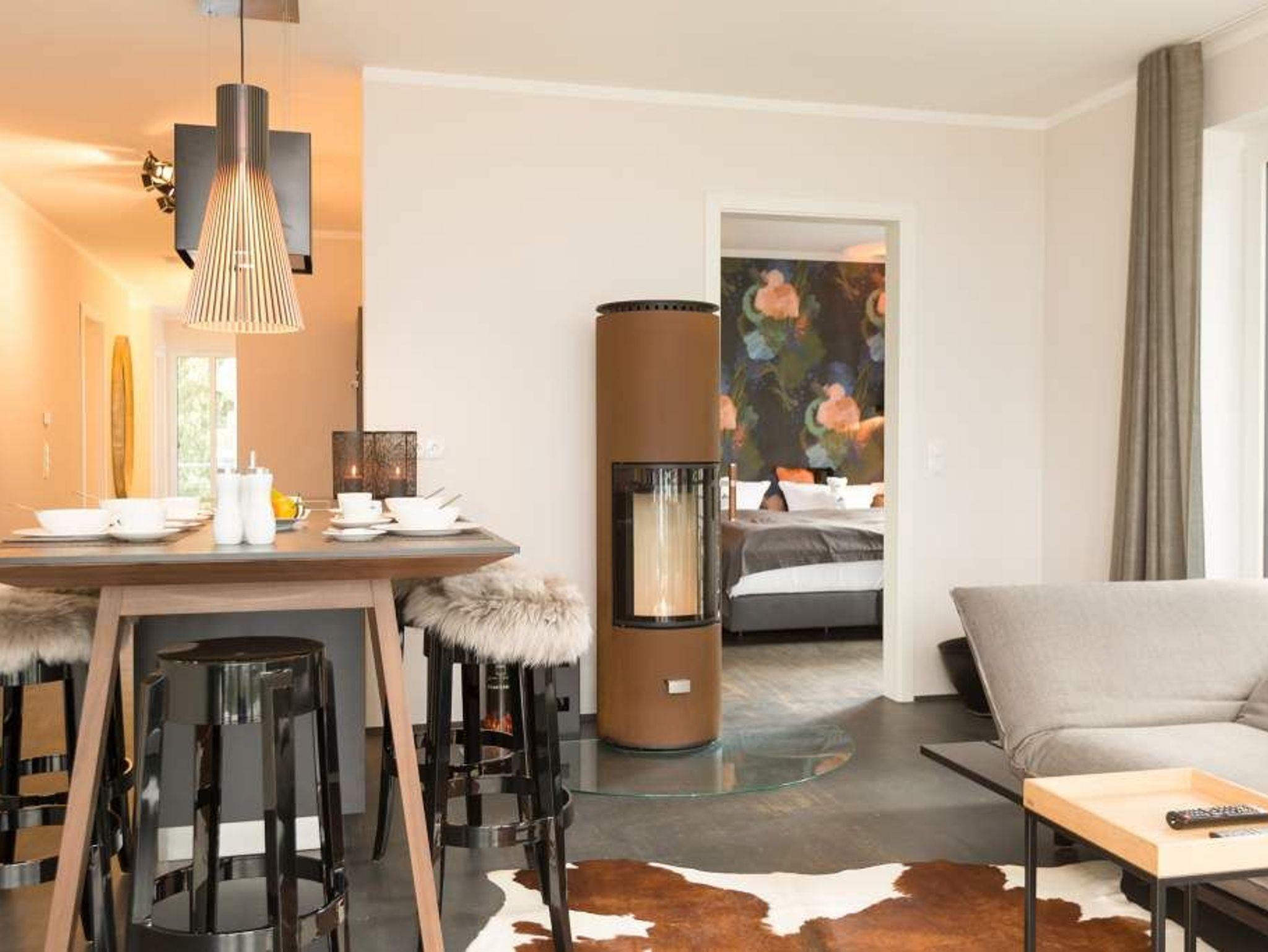 Eine Wohnung mit Stil, extravagant und exklusiv, ist die Ferienwohnung 06 im ersten Obergeschoss der Villa Strandgrün. Nur einen Steinwurf von der Ostsee entfernt laden ihre drei hellen und komfortabel ausgestattete Zimmer zum Wohlfühlen und entspannten Urlauben ein. In den 87 Quadratmetern finden vier Personen und ein Kleinkind (bis zwei Jahre im Kinderreisebett) bequem Platz. Ein Highlight des Wohnzimmers ist der offene Essbereich mit Tresen, Barhockern und einer stylischen Kochinsel. Die Küche ist übrigens voll ausgestattet. Ein zweites Highlight ist der Kamin, der abends oder an Schietwetter-Tagen für eine behagliche Atmosphäre sorgt. Ebenso wie die kuscheligen Schaf- und Kuhfelle auf den Hockern oder dem beheizbaren Fußboden. Auf der Design-Wohnlandschaft lässt es sich herrlich relaxen. Alltagsstress? Schon nach kurzer Zeit in diesem Appartement wird Ihnen dieses Wort, wie ein Fremdwort vorkommen. Genießen Sie die Sonne, die fast den ganzen Tag auf den großen, überdachten Südbalkon mit Blick in den Garten scheint. Ein zweiter, kleinerer Balkon ist über eines der beiden Schlafzimmer zugänglich. In beiden lichtdurchfluteten Schlafzimmern warten hochwertige Doppelboxspringbetten (1,80 m x 2,00 m) nur darauf, Ihnen wunderschöne Träume zu verschaffen. Ausgestattet sind beide Schlafzimmer und auch das Wohnzimmer mit Flat-TVs. Der Fernseher im Wohnzimmer enthält einen Blue-Ray-Player. Sie lieben Sauna? In der Wohnung Nummer 6 können Sie, so oft Sie wollen, in ihre ganz eigene kuschelige Wohlfühlzone abtauchen. Denn in eines der beiden Bäder ist eine finnische Sauna eingebaut. Ansonsten sind beide Bäder geräumig, verfügen über Waschtisch, Dusche und WC. Auch eine Waschmaschine und ein Safe gehören zur Ausstattung der Wohnung. Das WLAN ist kostenfrei. In der Tiefgarage ist für Sie ein Pkw-Stellplatz reserviert. In einem separaten Abstellraum in der Garage können Fahrräder verwahrt werden. Im Urlaub sollte nichts das Entspannen stören. Darum sind die Betten bereits bezogen und Handtücher liegen für Sie bereit.