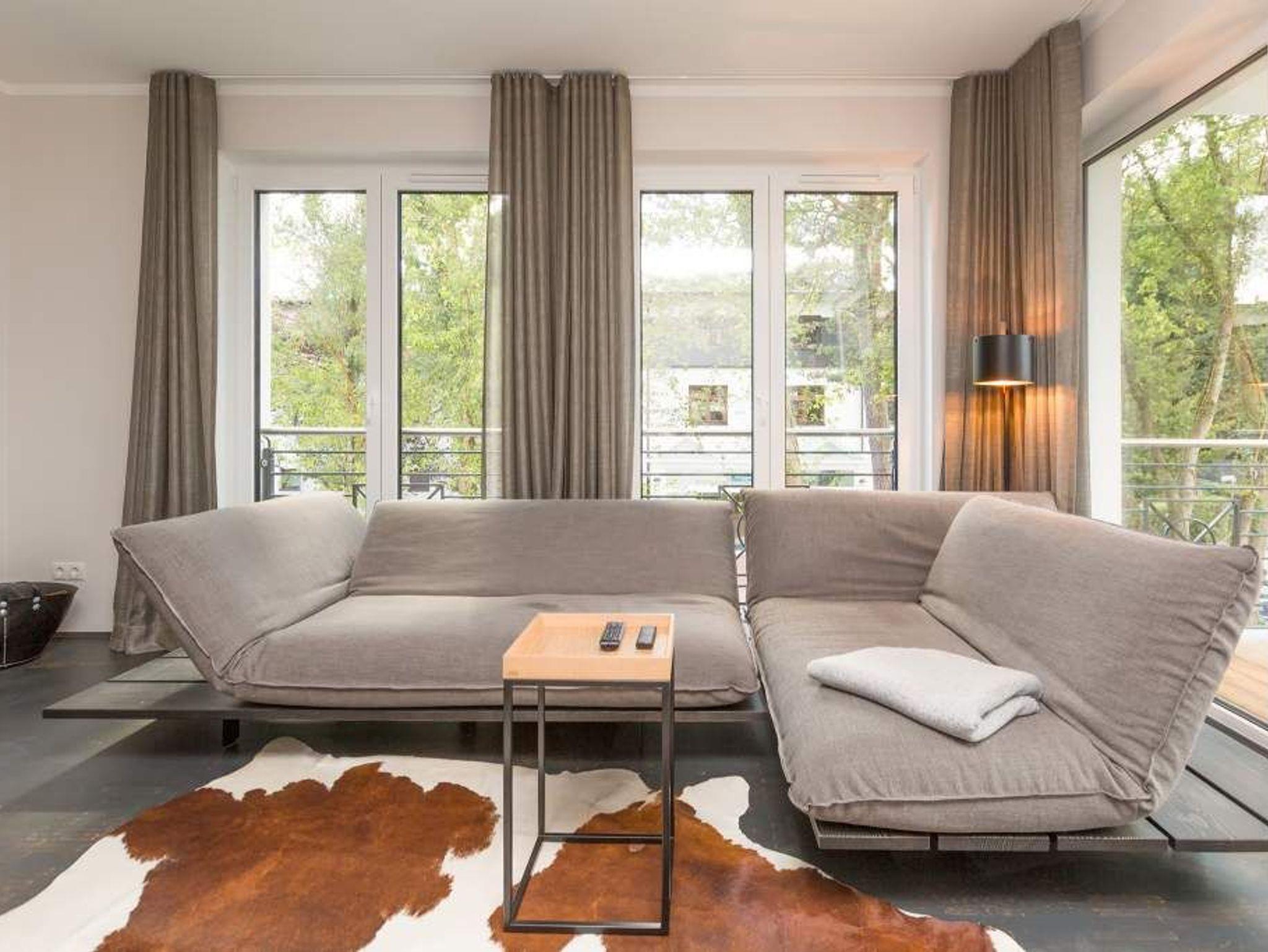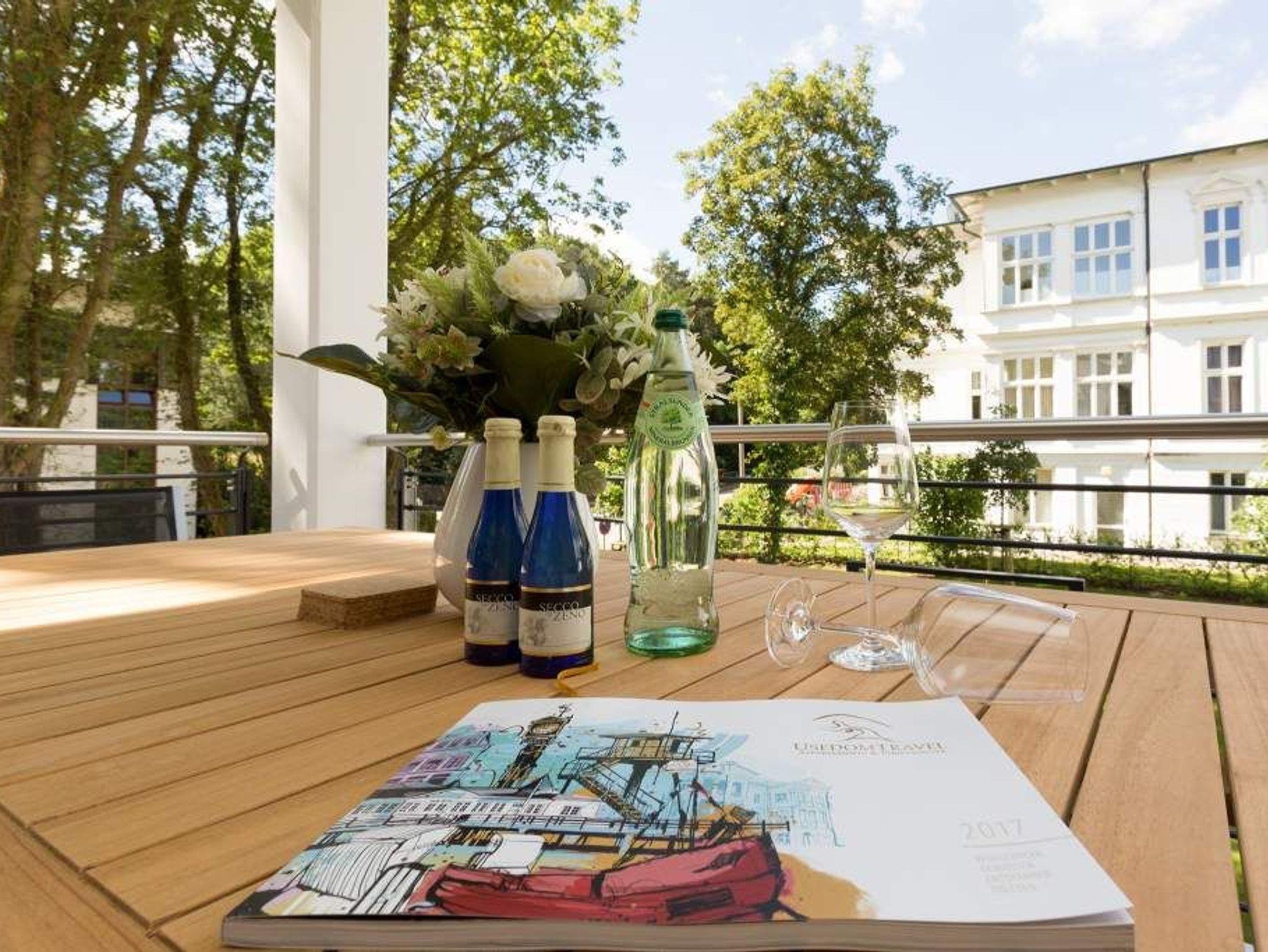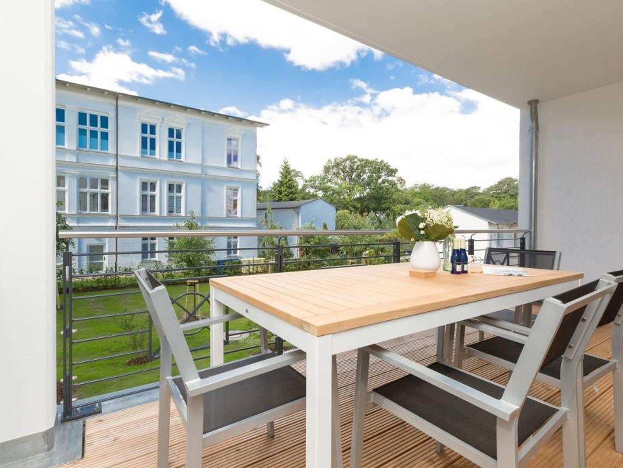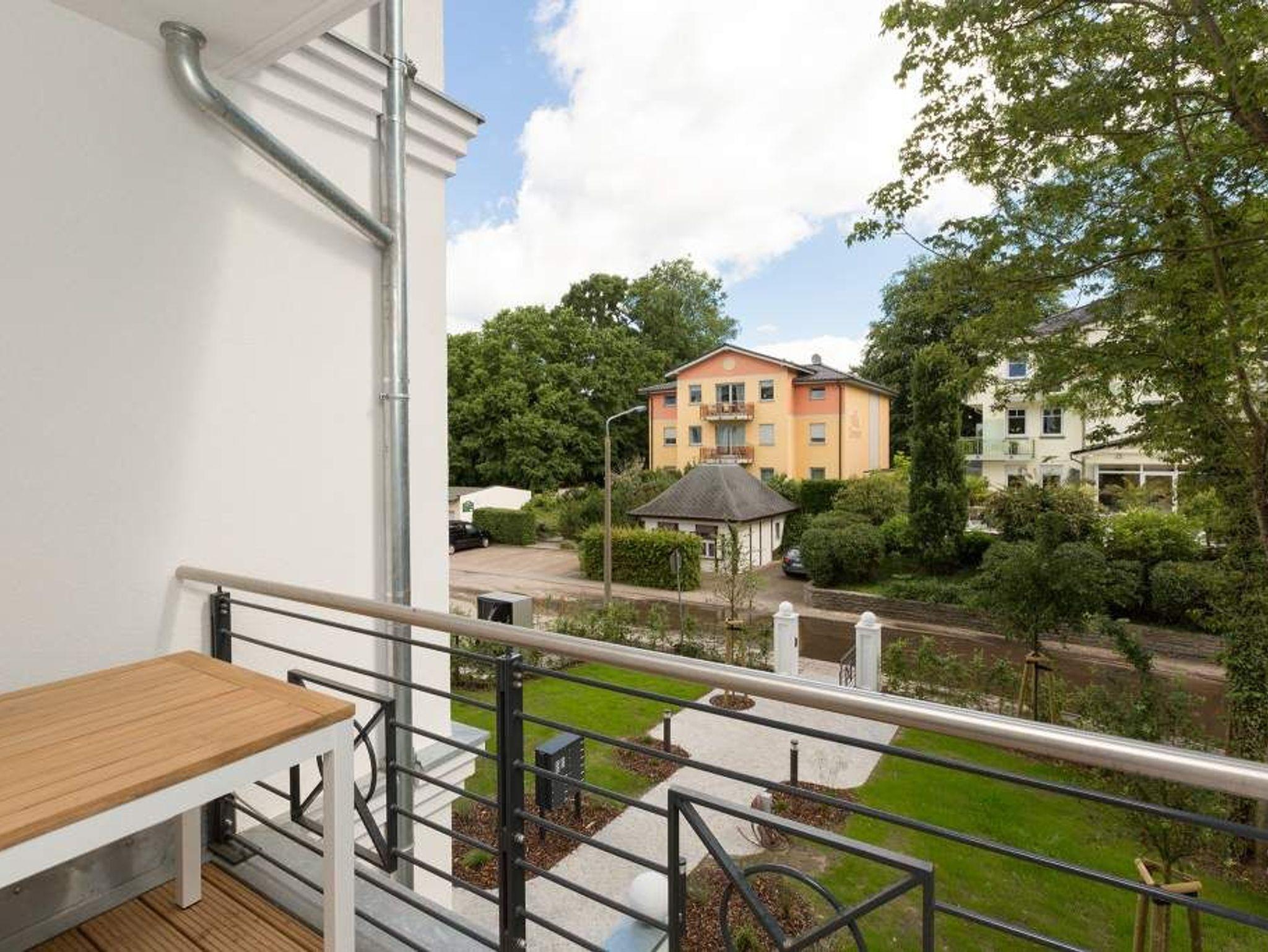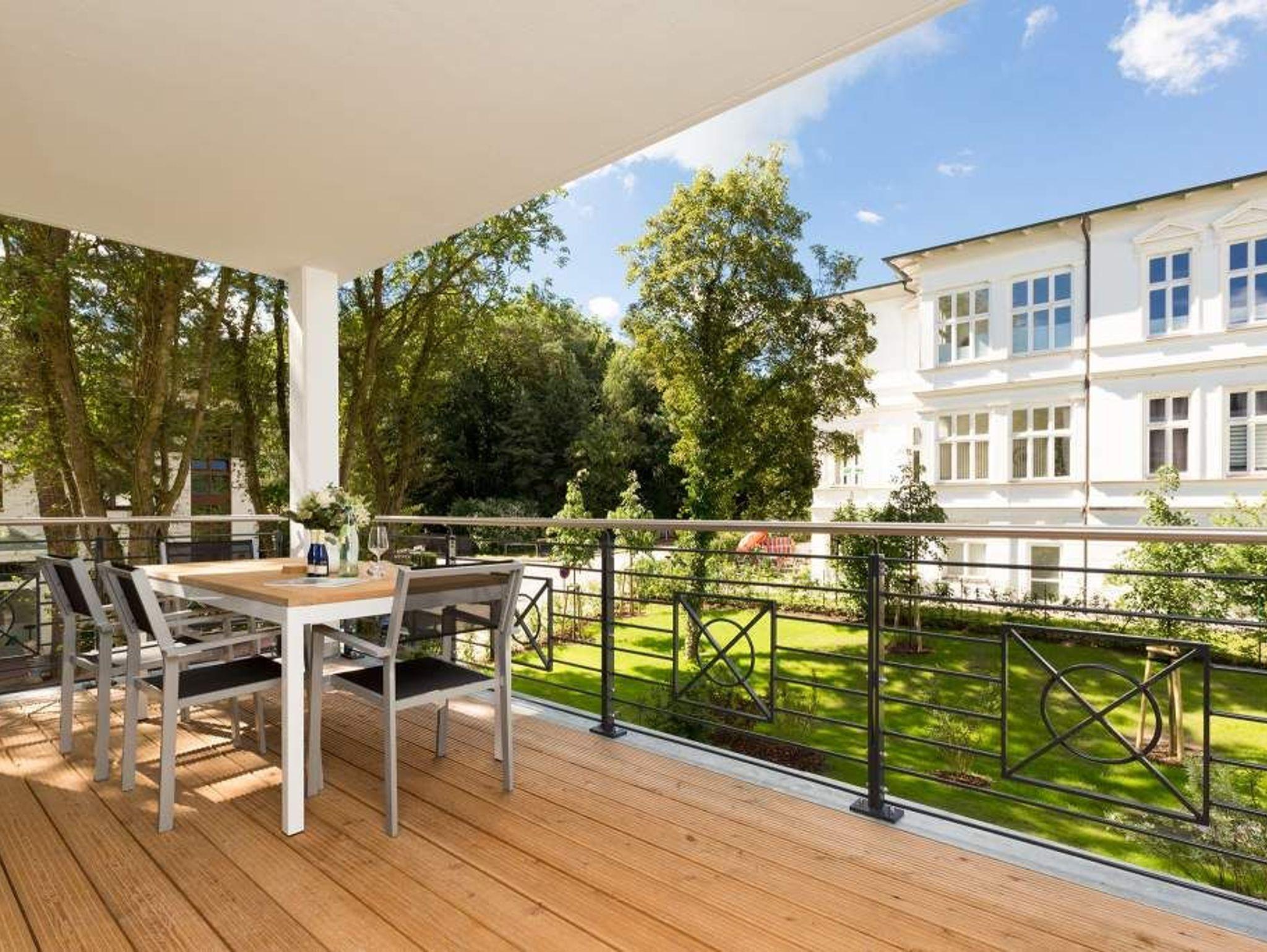 Vogelzwitschern und das sanfte Rauschen der Ostsee: Umgeben von wunderschönen, alten Bäumen atmet die 2017 fertig gestellte Villa Strandgrün das Flair der sie umgebenden Bädervillen. Mit seinen Balkonen und Erkern, die die Fassade untergliedern und auflockern, passt sich das strandnahe (100 Meter) Urlaubsdomizil angenehm in das Bild der aufwendig sanierten Villen um sie herum ein und wirkt selbst wie eine Weiterführung der einst mondänen Architektur des 19. Jahrhunderts. Das stilvolle Äußere setzt sich im exklusiven und eleganten Wohndesign im Inneren fort. Jede Ferienwohnung verfügt über eine Sonnenterrasse oder mehrere Balkone. Besondere Highlights eines jeden Appartements sind der Kamin, eine Sauna und je zwei Bäder bzw. ein zusätzliches Gäste WC. Die großzügigen 3- und 4-Raum-Suiten wurden mit allem Komfort konzipiert und ausgestattet. Vom ASA-Geschirr bis zu den hochwertigen Designmöbeln steht das Wohlfühlen an erster Stelle. In der Tiefgarage gibt es für jedes Appartement einen Stellplatz. Außerdem steht für jede Wohnung ein Briefkasten am Haus zur Verfügung.