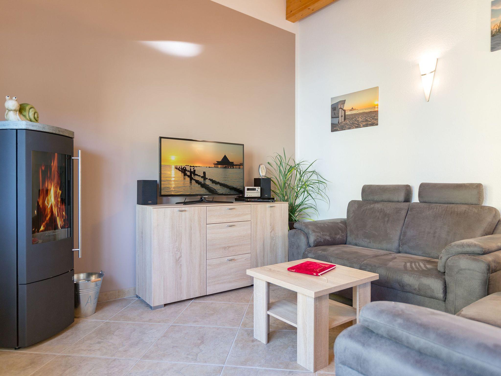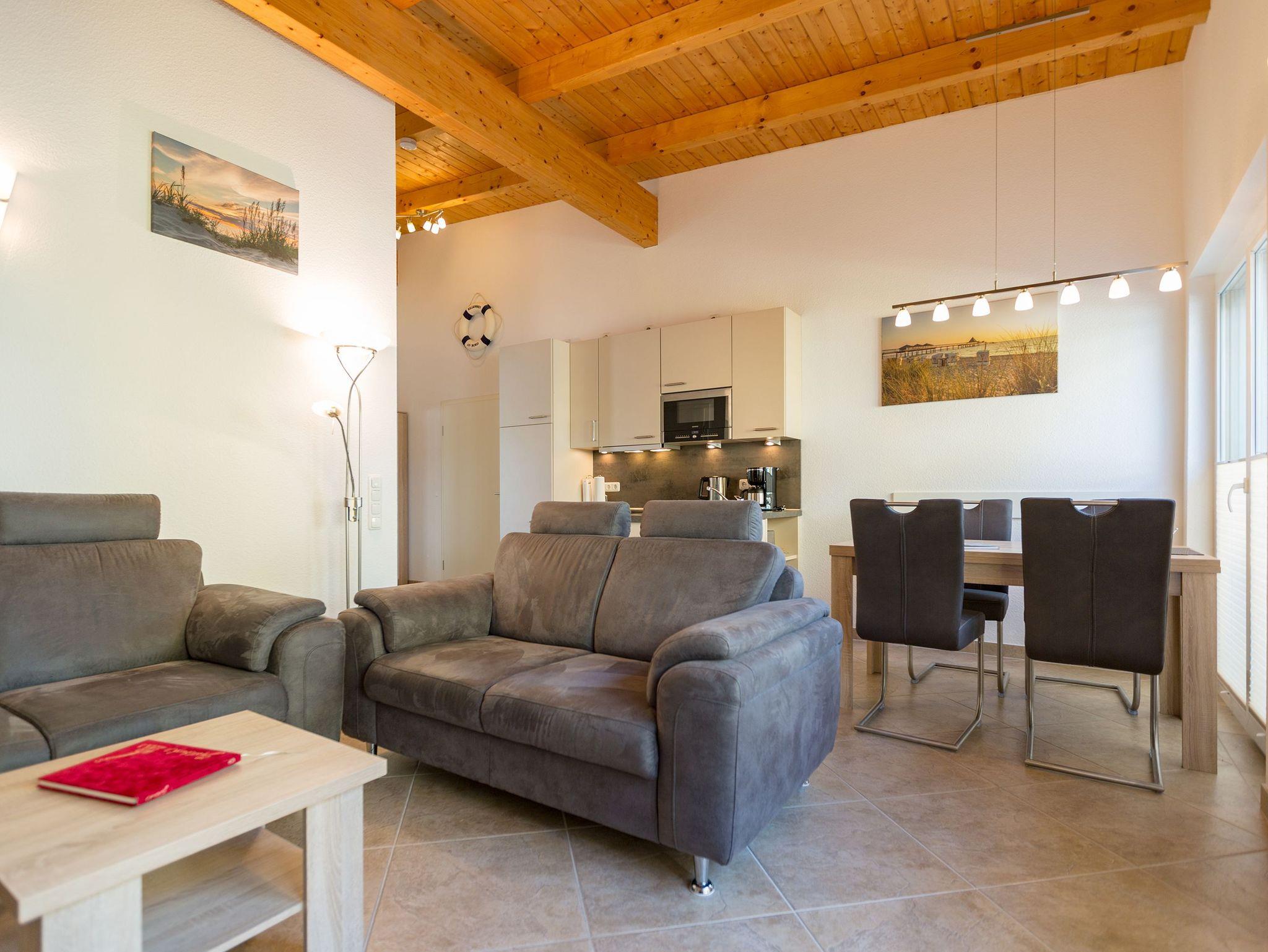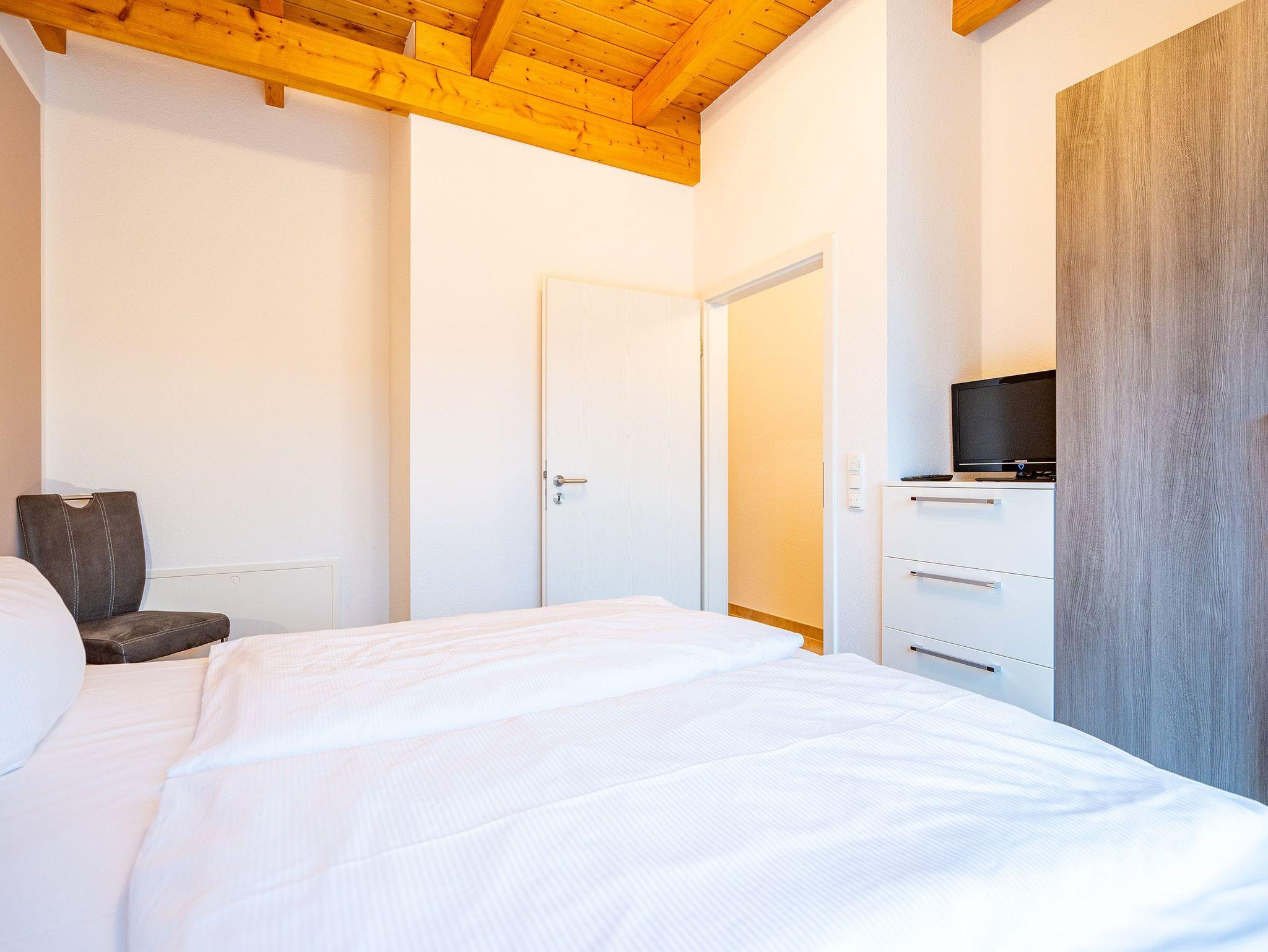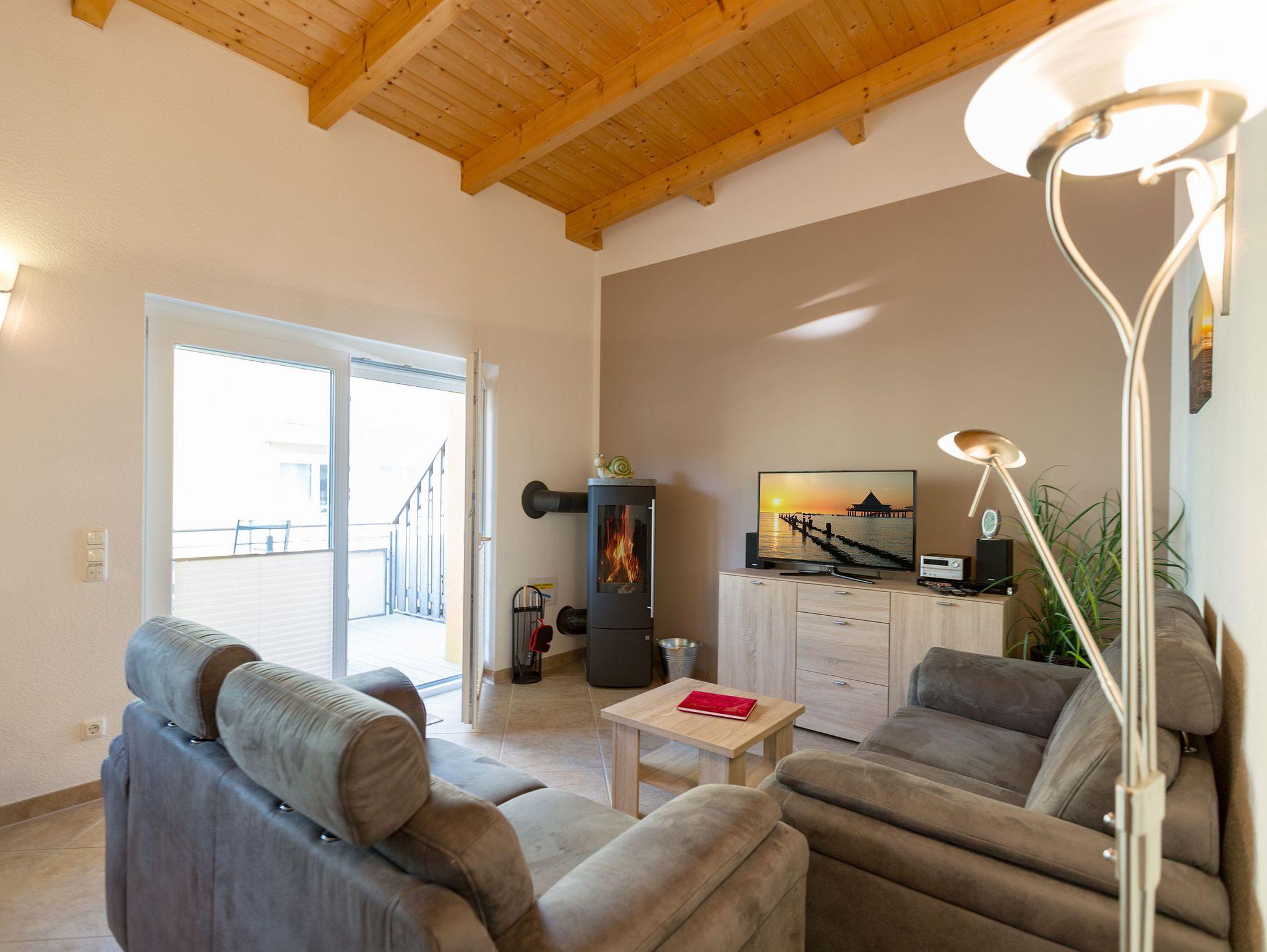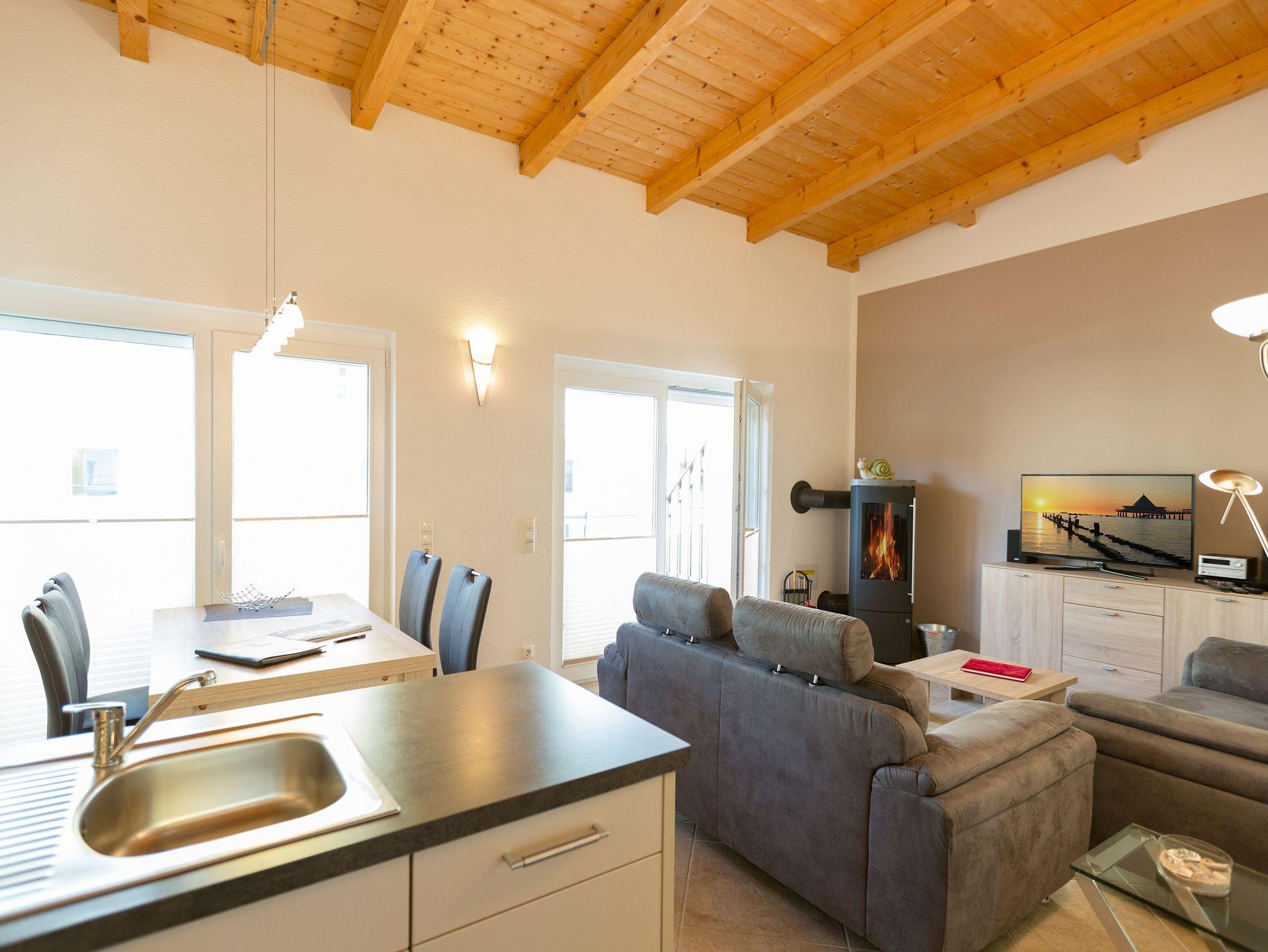 Der Urlaub mit der Familie oder den Freunden kann kommen. Denn in diesem 64 Quadratmeter großen Auszeitparadies im 1. Stock ist Platz für vier Personen und ein Kleinkind bis drei Jahre (im Kinderreisebett). Drei lichte und hohe Räume mit offener Balkendecke, modernes Design, die technische Ausstattung auf dem neuesten Stand und all das mit Liebe zu einem harmonischen Wohnkonzept vereint ? hier wird der Urlaub zum unvergesslichen Erlebnis. Auf zwei Balkonen (18 und 11 Quadratmeter groß) können Sie ausspannen und Sonne tanken. Sowohl das Wohnzimmer als auch beide Schlafzimmer haben Zugänge zu ihnen. Im Inneren wartet ein stylisches und sehr gemütliches Wohn-Esszimmer auf Sie. Die großen Fenster lassen viel Licht hinein. Kalte Füße gehören dank der Fußbodenheizung in allen Räumen der Vergangenheit an. Zwei moderne Sofas sorgen für viel Komfort beim Relaxen vor dem Echtholz-Kaminofen oder dem 3D-Flat-TV. Auf dem Blue-Ray-Player können problemlos alle Lieblingsfilme abgespielt werden. An dem großen Esstisch können sich alle zu gemeinsamen Muße- und Genussstunden zusammenfinden. Apropos Genuss ? den können Sie in der vollausgestatteten und offenen Küche dank hochwertiger Geräte und edlem Geschirr kinderleicht selbst zaubern. Vom Wohnzimmer aus können Sie auf den großzügigen Südbalkon hinaustreten. Zwei Schlafzimmer mit komfortablen Doppelbetten (1,80 m x 2,00 m)(1x mit Flat-TV) sind Rückzugsorte, in denen Sie neue Energie tanken können. Denn hier werden Sie schlafen wie Babys. Morgens werden Sie dann von der Sonne sanft geweckt. Begrüßen Sie den Tag gleich mal an der frischen Luft. Denn von den Schlafzimmern aus geht?s direkt auf den von der Morgensonne beschienen Ostbalkon mit Blick ins Grüne hinaus. Beide Schlafzimmer haben einen geräumigen Kleiderschrank. Das Appartement verfügt über zwei moderne Bäder mit Dusche und WC. Das Masterbad ist direkt von einem der beiden Schlafzimmer aus begehbar. Bei Ankunft sind die Betten bezogen und Handtücher liegen bereit. In der Tiefgarage ist ein Stellplatz für das Appartement vorgesehen. Auf Wunsch stellen wir für unsere kleinen Gäste ein Kinderreisebett (ohne zusätzliche Matratze [&] Bettzeug) und einen Kinderhochstuhl (gegen einen Aufpreis) zur Verfügung.