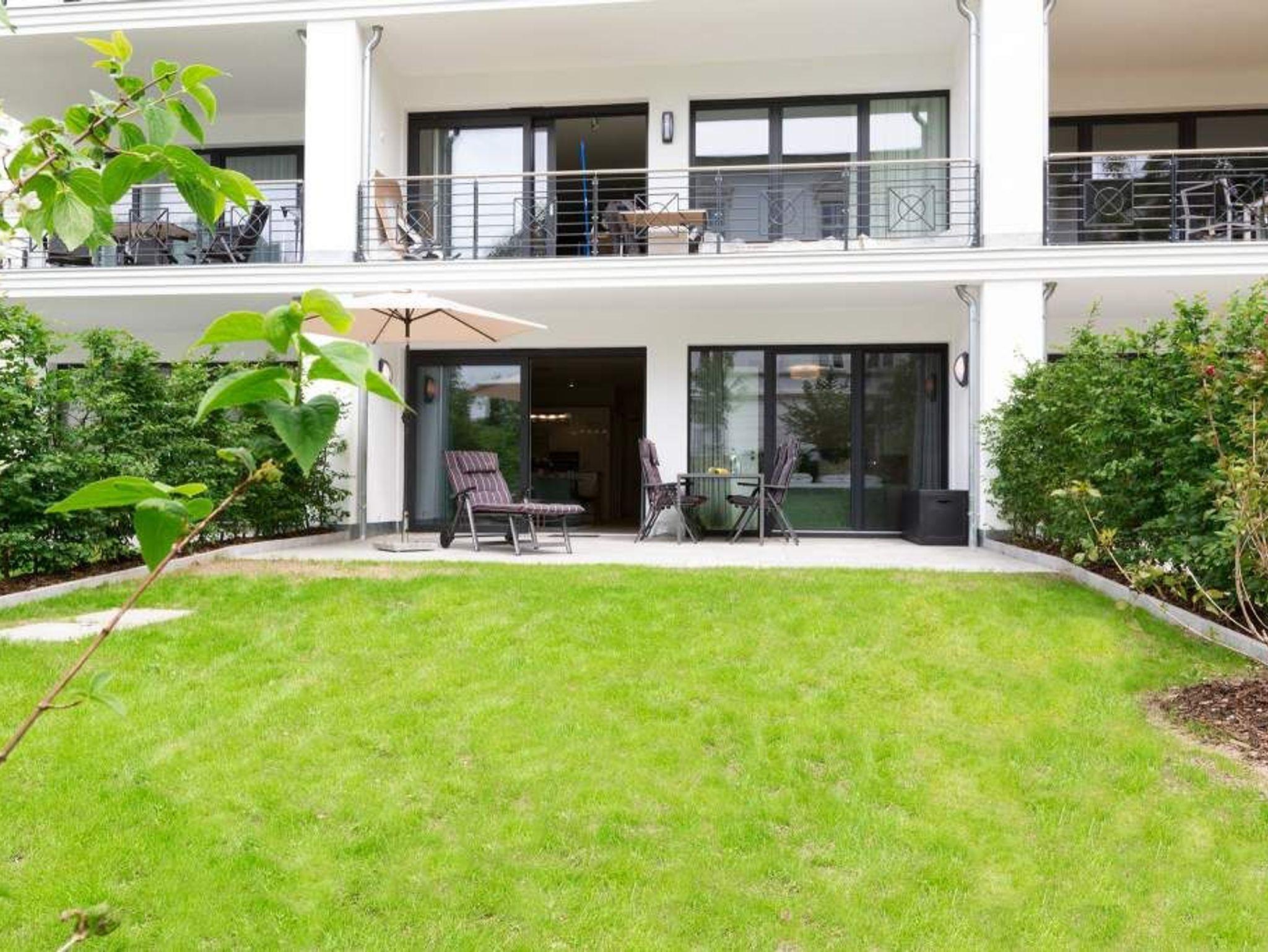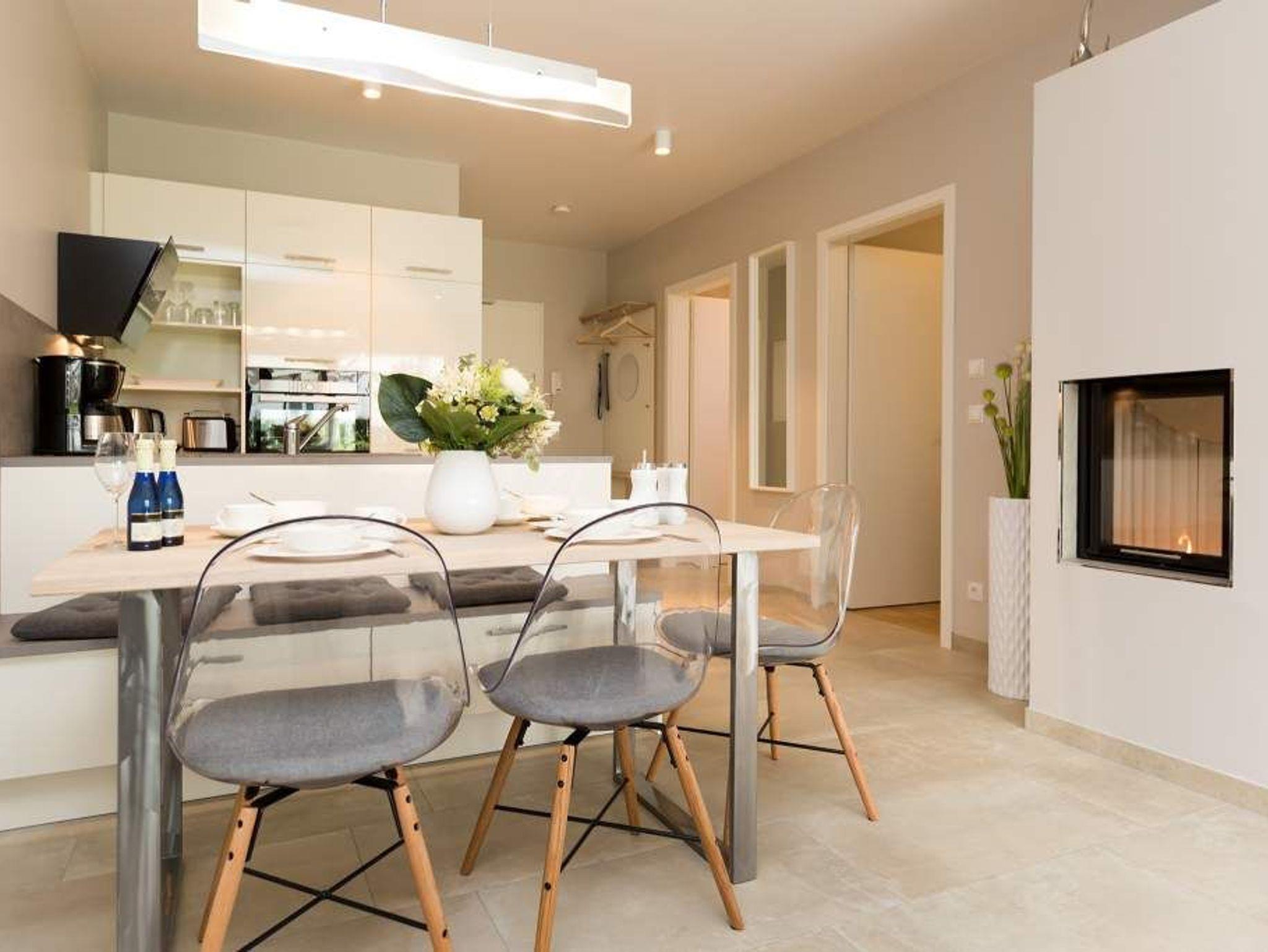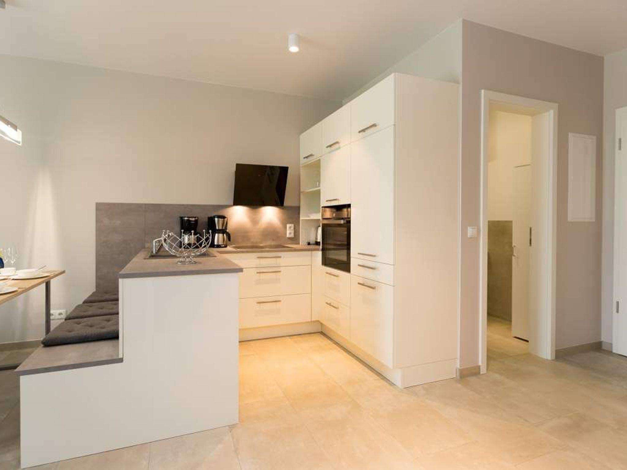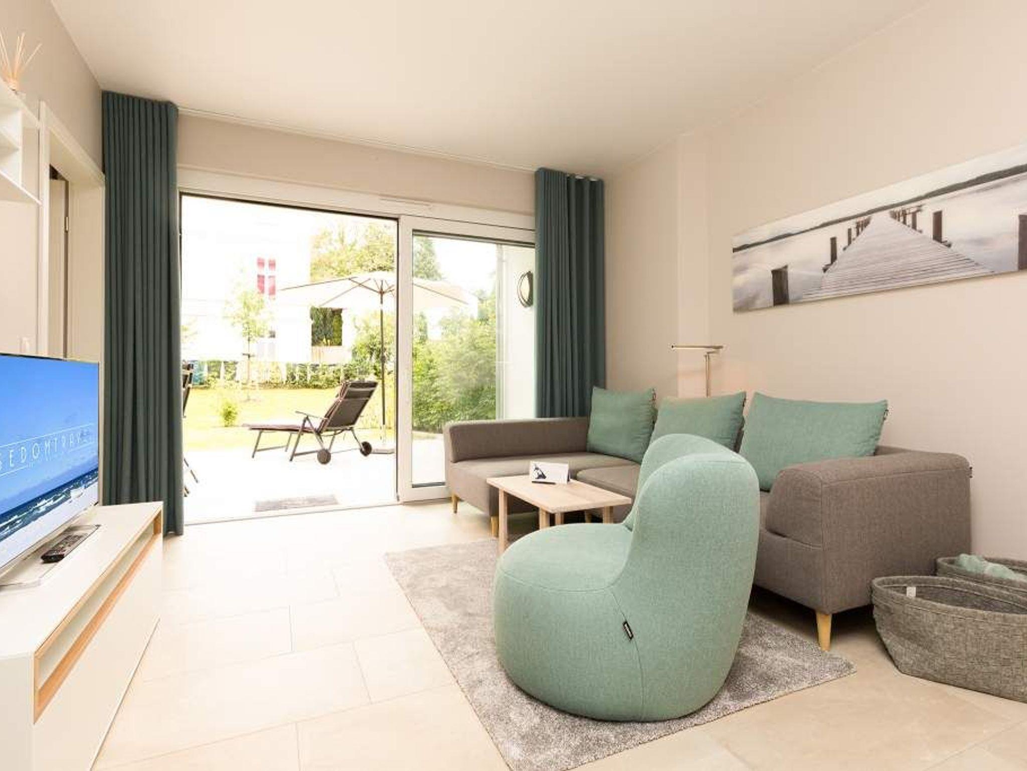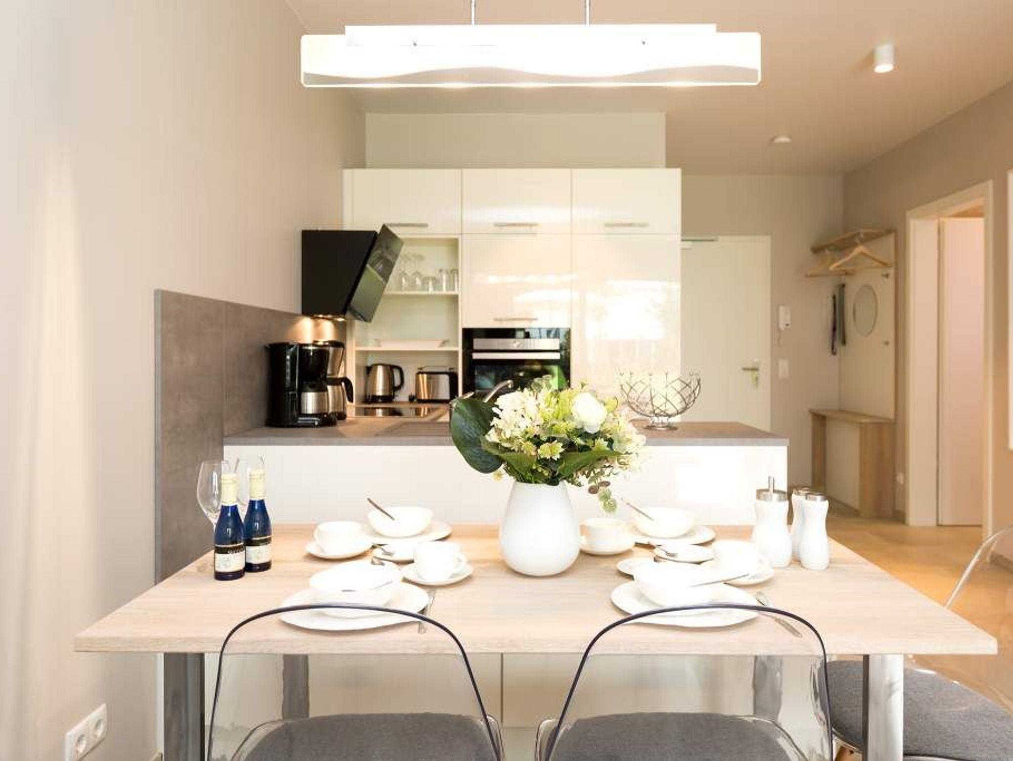 Ein Ferien-Appartement der Extraklasse erwartet sie im Erdgeschoss der Villa Strandgrün. Drei Räume ? außergewöhnlich, stylisch und absolut hochwertig eingerichtet ? machen Ihren Ostseeurlaub zu einem besonderen Erlebnis. Das knapp 68 Quadratmeter große Appartement ist für 4 Personen und 1 Kleinkind (bis zu 3 Jahre) im Kinderreisebett zusätzlich untergebracht werden. Helle und harmonisch aufeinander abgestimmte Farben verleihen der Wohnung in Kombination mit der Betonoptik der Bodenfliesen und den skandinavischen Designmöbeln ein modernes und exklusives Flair. Eine offene Wohnküche sorgt für eine kommunikative Atmosphäre. Der Wohnbereich besticht durch den Echtholztisch mit den Retro-Schalenstühlen aus Acryl. Entspannen Sie auf der chilligen Wohnlandschaft beim Blick auf den Echtholzkamin oder den 40 Zoll Flat-TV. Vom Wohnzimmer aus gelangt man auf die 30 Quadratmeter große Sonnenterrasse mit Süd-West-Ausrichtung. Zwei Schlafzimmer mit Boxspringdoppelbetten (1,80 m x 2,00 m), hochwertigen Einbauschränken und Flat-TV bieten komfortable Rückzugsmöglichkeiten. Die beiden Schlafzimmer sind über ein feststehendes Oberlicht-Fenster miteinander verbunden. Ein Schlafzimmer verfügt zusätzlich über einen direkten Zugang zur Terrasse. Das zweite Schlafzimmer hat kein zu öffnendes Fenster; die Lüftung erfolgt ausschließlich über die Tür zum Wohnbereich. Im geräumigen Wellnessbad befindet sich eine Panorama-Sauna, eine Tropendusche und ein Doppelwaschtisch. Die Ferienwohnung verfügt zusätzlich über ein Gäste-WC. In der Tiefgarage sind für Sie zwei Pkw-Stellplätze reserviert. Für Ihren Komfort sind die Betten bereits bezogen und Handtücher liegen bereit. Von Mai bis Anfang Oktober (je nach Wetterlage) kann der wohnungseigene Strandkorb am Strand genutzt werden.