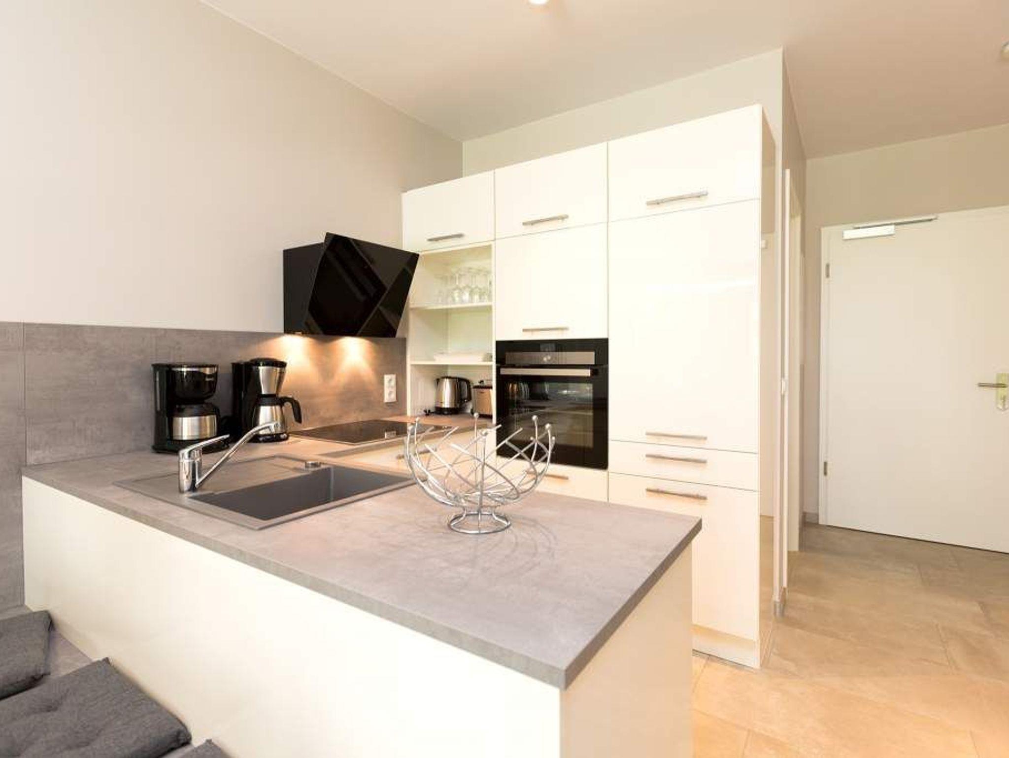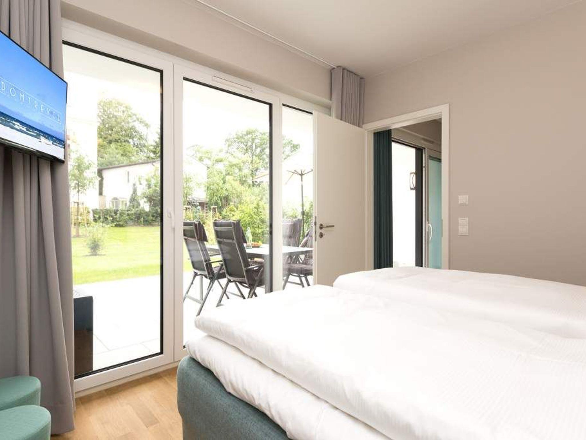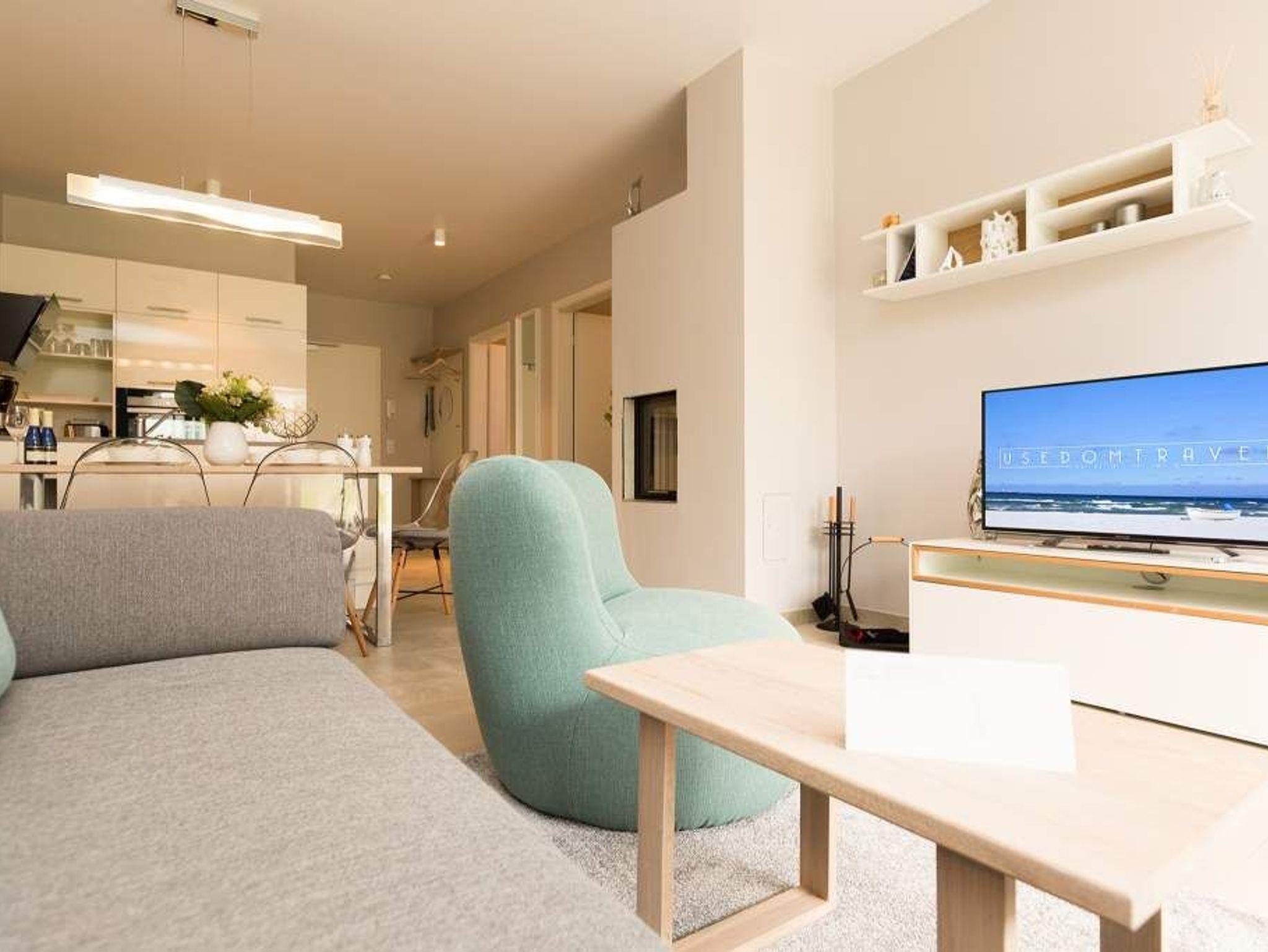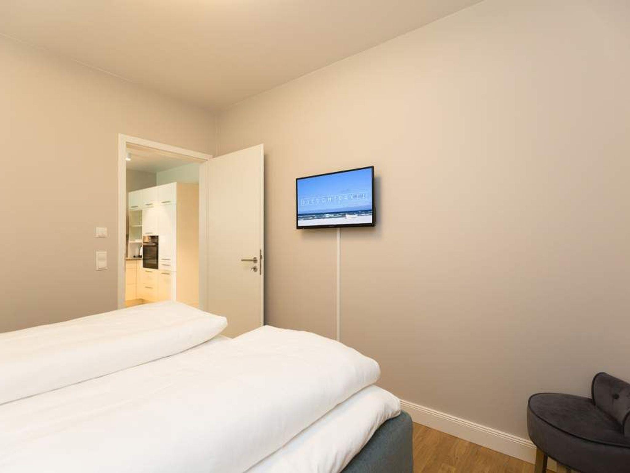 Ein Ferien-Appartement der Extraklasse erwartet sie im Erdgeschoss der Villa Strandgrün. Drei Räume ? außergewöhnlich, stylisch und absolut hochwertig eingerichtet ? machen Ihren Ostseeurlaub zu einem besonderen Erlebnis. Das knapp 68 Quadratmeter große Appartement ist für 4 Personen und 1 Kleinkind (bis zu 3 Jahre) im Kinderreisebett zusätzlich untergebracht werden. Helle und harmonisch aufeinander abgestimmte Farben verleihen der Wohnung in Kombination mit der Betonoptik der Bodenfliesen und den skandinavischen Designmöbeln ein modernes und exklusives Flair. Eine offene Wohnküche sorgt für eine kommunikative Atmosphäre. Der Wohnbereich besticht durch den Echtholztisch mit den Retro-Schalenstühlen aus Acryl. Entspannen Sie auf der chilligen Wohnlandschaft beim Blick auf den Echtholzkamin oder den 40 Zoll Flat-TV. Vom Wohnzimmer aus gelangt man auf die 30 Quadratmeter große Sonnenterrasse mit Süd-West-Ausrichtung. Zwei Schlafzimmer mit Boxspringdoppelbetten (1,80 m x 2,00 m), hochwertigen Einbauschränken und Flat-TV bieten komfortable Rückzugsmöglichkeiten. Die beiden Schlafzimmer sind über ein feststehendes Oberlicht-Fenster miteinander verbunden. Ein Schlafzimmer verfügt zusätzlich über einen direkten Zugang zur Terrasse. Das zweite Schlafzimmer hat kein zu öffnendes Fenster; die Lüftung erfolgt ausschließlich über die Tür zum Wohnbereich. Im geräumigen Wellnessbad befindet sich eine Panorama-Sauna, eine Tropendusche und ein Doppelwaschtisch. Die Ferienwohnung verfügt zusätzlich über ein Gäste-WC. In der Tiefgarage sind für Sie zwei Pkw-Stellplätze reserviert. Für Ihren Komfort sind die Betten bereits bezogen und Handtücher liegen bereit. Von Mai bis Anfang Oktober (je nach Wetterlage) kann der wohnungseigene Strandkorb am Strand genutzt werden.