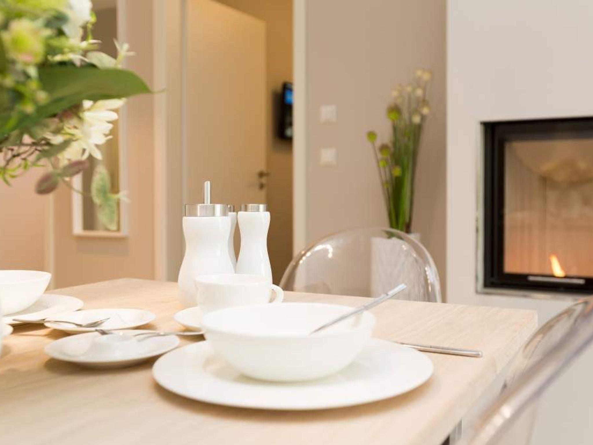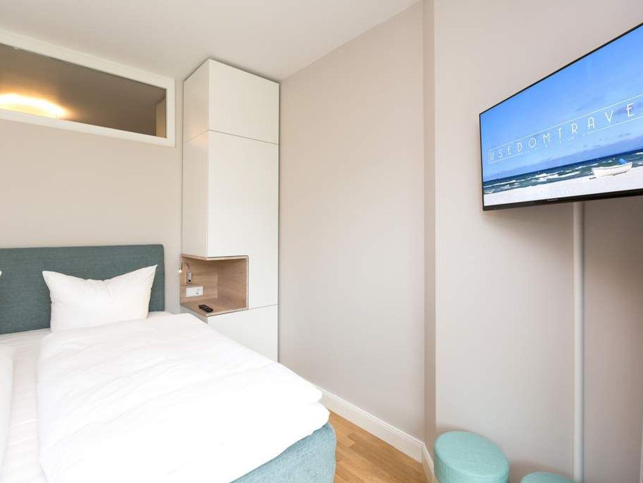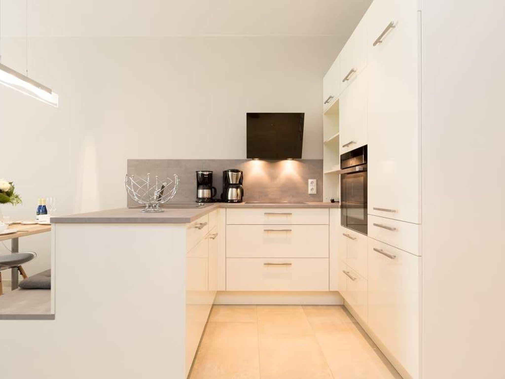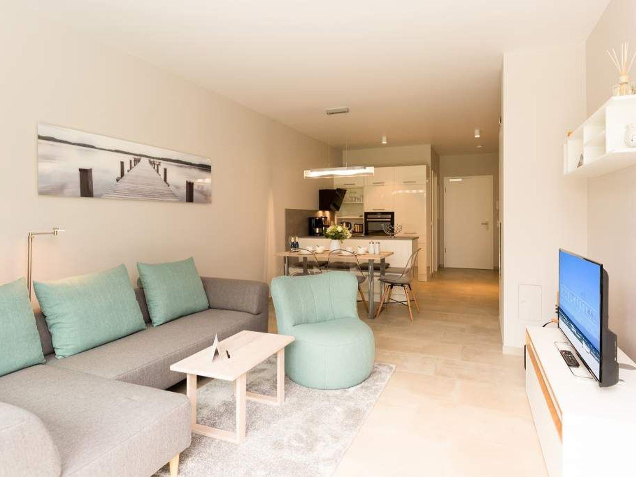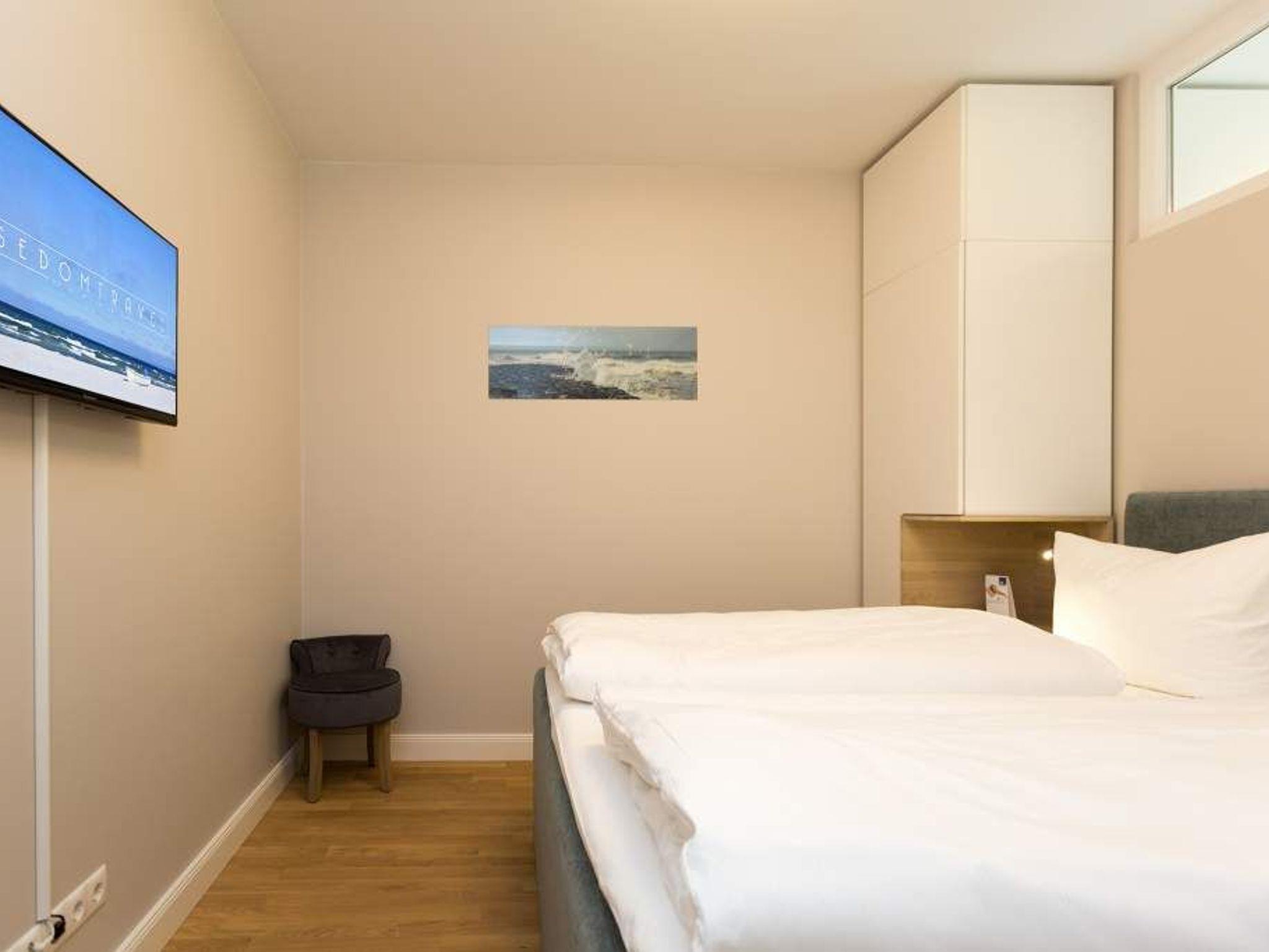 Ein Ferien-Appartement der Extraklasse erwartet sie im Erdgeschoss der Villa Strandgrün. Drei Räume ? außergewöhnlich, stylisch und absolut hochwertig eingerichtet ? machen Ihren Ostseeurlaub zu einem besonderen Erlebnis. Das knapp 68 Quadratmeter große Appartement ist für 4 Personen und 1 Kleinkind (bis zu 3 Jahre) im Kinderreisebett zusätzlich untergebracht werden. Helle und harmonisch aufeinander abgestimmte Farben verleihen der Wohnung in Kombination mit der Betonoptik der Bodenfliesen und den skandinavischen Designmöbeln ein modernes und exklusives Flair. Eine offene Wohnküche sorgt für eine kommunikative Atmosphäre. Der Wohnbereich besticht durch den Echtholztisch mit den Retro-Schalenstühlen aus Acryl. Entspannen Sie auf der chilligen Wohnlandschaft beim Blick auf den Echtholzkamin oder den 40 Zoll Flat-TV. Vom Wohnzimmer aus gelangt man auf die 30 Quadratmeter große Sonnenterrasse mit Süd-West-Ausrichtung. Zwei Schlafzimmer mit Boxspringdoppelbetten (1,80 m x 2,00 m), hochwertigen Einbauschränken und Flat-TV bieten komfortable Rückzugsmöglichkeiten. Die beiden Schlafzimmer sind über ein feststehendes Oberlicht-Fenster miteinander verbunden. Ein Schlafzimmer verfügt zusätzlich über einen direkten Zugang zur Terrasse. Das zweite Schlafzimmer hat kein zu öffnendes Fenster; die Lüftung erfolgt ausschließlich über die Tür zum Wohnbereich. Im geräumigen Wellnessbad befindet sich eine Panorama-Sauna, eine Tropendusche und ein Doppelwaschtisch. Die Ferienwohnung verfügt zusätzlich über ein Gäste-WC. In der Tiefgarage sind für Sie zwei Pkw-Stellplätze reserviert. Für Ihren Komfort sind die Betten bereits bezogen und Handtücher liegen bereit. Von Mai bis Anfang Oktober (je nach Wetterlage) kann der wohnungseigene Strandkorb am Strand genutzt werden.