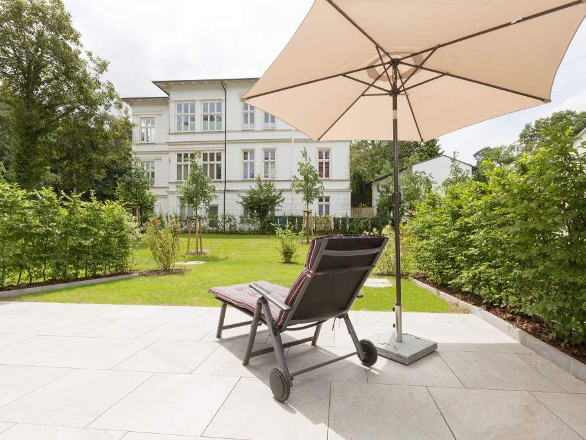 Vogelzwitschern und das sanfte Rauschen der Ostsee: Umgeben von wunderschönen, alten Bäumen atmet die 2017 fertig gestellte Villa Strandgrün das Flair der sie umgebenden Bädervillen. Mit seinen Balkonen und Erkern, die die Fassade untergliedern und auflockern, passt sich das strandnahe (100 Meter) Urlaubsdomizil angenehm in das Bild der aufwendig sanierten Villen um sie herum ein und wirkt selbst wie eine Weiterführung der einst mondänen Architektur des 19. Jahrhunderts. Das stilvolle Äußere setzt sich im exklusiven und eleganten Wohndesign im Inneren fort. Jede Ferienwohnung verfügt über eine Sonnenterrasse oder mehrere Balkone. Besondere Highlights eines jeden Appartements sind der Kamin, eine Sauna und je zwei Bäder bzw. ein zusätzliches Gäste WC. Die großzügigen 3- und 4-Raum-Suiten wurden mit allem Komfort konzipiert und ausgestattet. Vom ASA-Geschirr bis zu den hochwertigen Designmöbeln steht das Wohlfühlen an erster Stelle. In der Tiefgarage gibt es für jedes Appartement einen Stellplatz. Außerdem steht für jede Wohnung ein Briefkasten am Haus zur Verfügung.