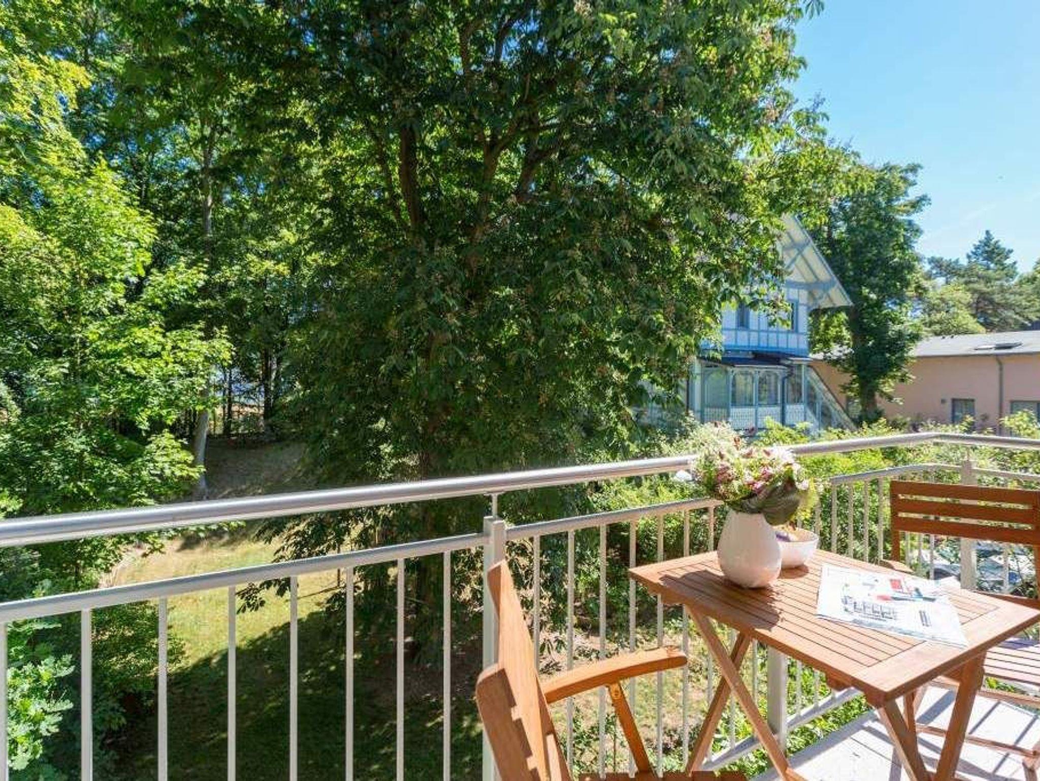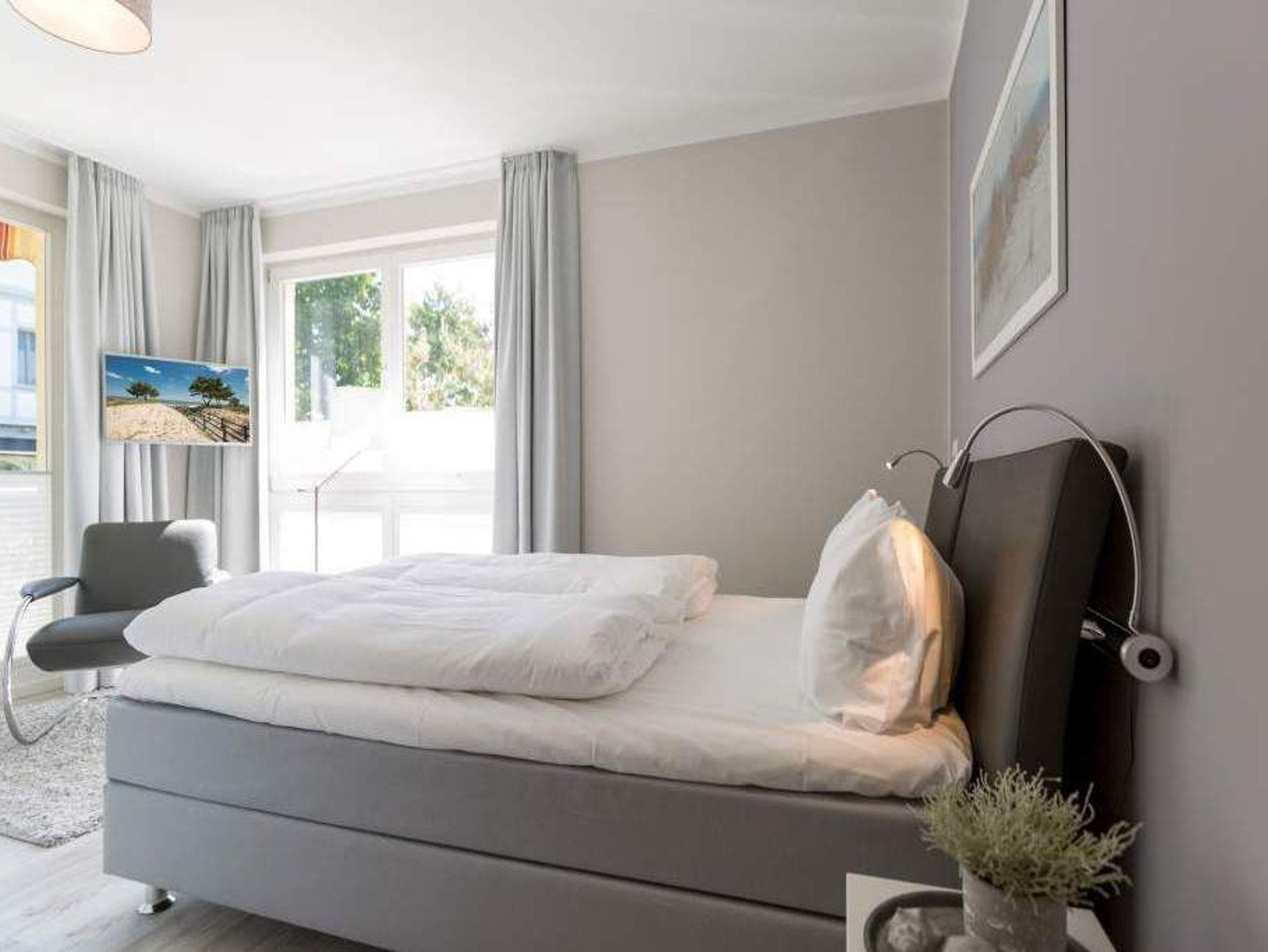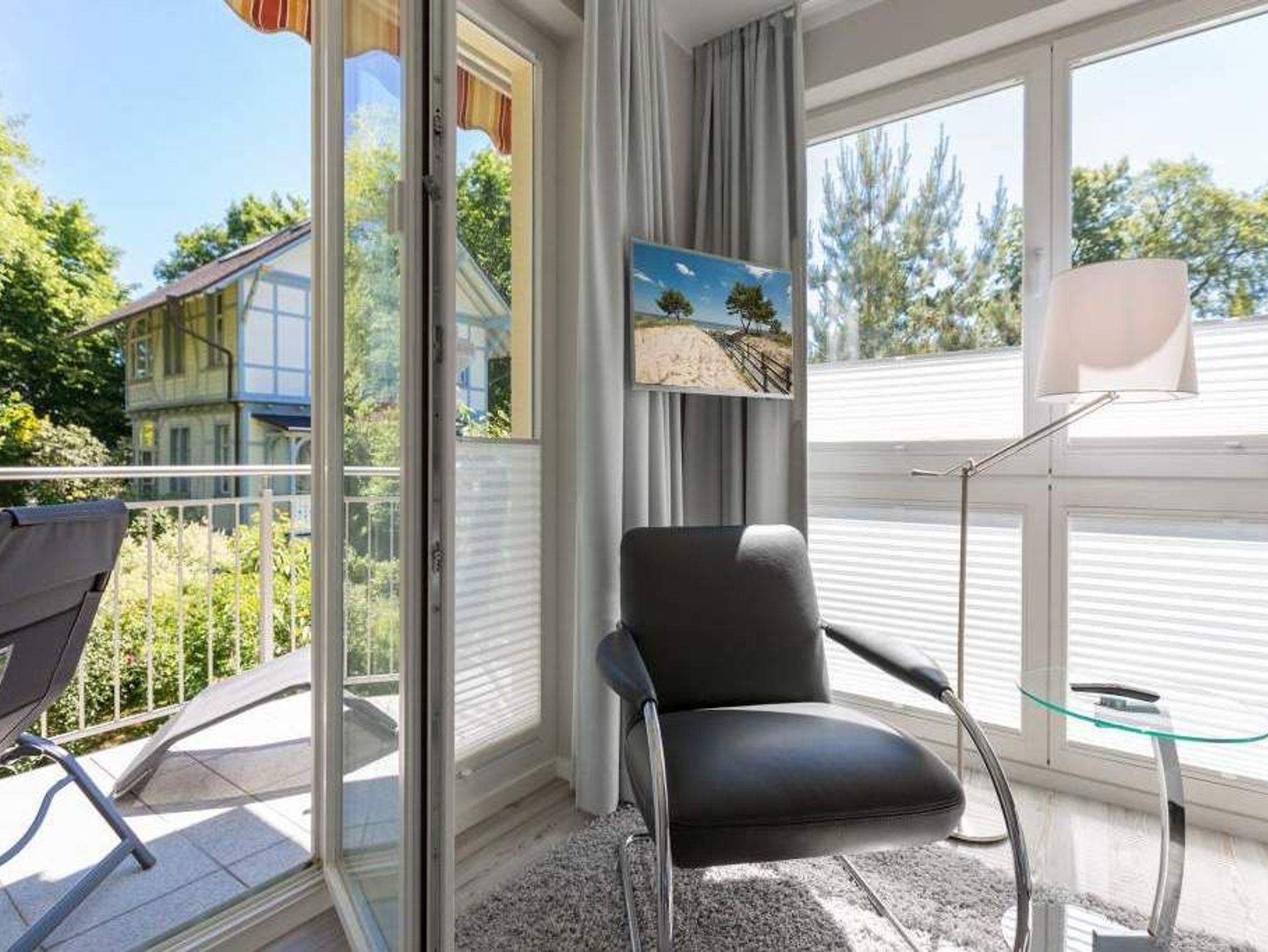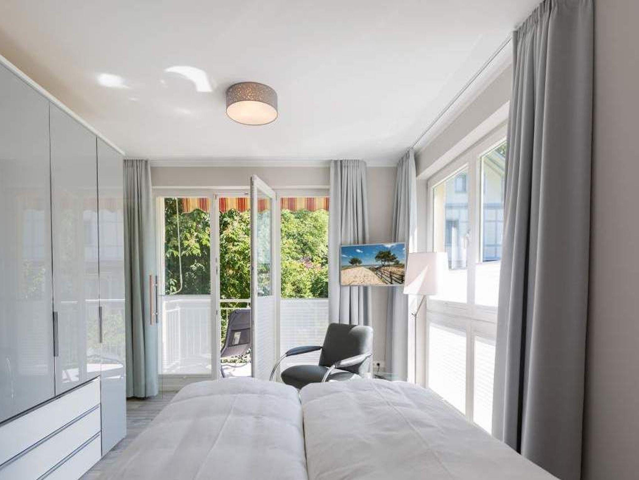 Durch das satte Grün der Bäume schimmert glitzernd blau die Ostsee hindurch. Morgens bei Sonnenschein auf dem Balkon zu sitzen, den Vögeln und dem Meeresrauschen zu lauschen, ist ein perfekter Start in den Urlaubstag. Ob allein oder zweit ? in diesem exklusiven und modernen Ferienappartement wird Ihre Erholung zum entspannten Genuss. Denn viel Platz, Leichtigkeit und Stil prägen die schick eingerichtete, 66 Quadratmeter große Wohnung. Hier gibt es nicht nur ein Highlight, das Ihre Ostseeauszeit zu etwas ganz Besonderem macht. Neben den beiden Balkonen ? vom Wohnzimmer aus und vom Schlafzimmer aus begehbar ? erwartet Sie hier eine kleine Wohlfühloase, die das ganze Jahr über ihre Reize hat. Gerade auch im Winter bietet dieses Urlaubsdomizil die Möglichkeit zur Entspannung. Wenn die Bäume kahl und starr vom kalten Nordost klirren und den Blick auf die schier endlose, in manchen Jahren sogar zugefrorene Ostsee frei geben, können Sie sich diese Landschaft aus dem Wohn- und dem Schlafzimmer, aber auch aus der kuschelig warmen Panorama-Sauna heraus anschauen. Denn auch die mit einem LED-Farblichtsystem versehene Sauna ( für finnischen Saunabetrieb und BIO-Betrieb mit Verdampfer) gehört zu der Wohnung Nummer 7 im 2. Obergeschoss der Villa Barbara dazu. Die unterschiedlichen Lichtstimmungen sorgen zusätzlich für Entspannung pur. Ruhe und Erholung finden Sie zudem in dem geräumigen Wohn-Esszimmer. Eine gemütliche Sofalandschaft lädt zum Relaxen vor dem großen Flat-TV ein. Eine Media-Anlage offeriert Internet Radio und Bluetooth Streaming. Das WLAN ist kostenfrei. Die offene Küche ist mit hochwertigen Geräten und Geschirr voll ausgestattet. Essen können Sie am schönen Echtholztisch. Die große, bodentiefe Fensterfront lässt viel Licht hinein. Echtes Schlafvergnügen gewährleistet im ebenso schönen Schlafzimmer ein komfortables Boxspringdoppelbett (1,60 m x 2,00 m). Viel Ablage bietet der große Kleiderschrank. Auch in diesem Zimmer befindet sich ein Flat-TV. Von hier aus haben Sie Zugang zu einem zweiten Balkon. Genießen Sie hier auf den Sonnenliegen den Sommer. Im Badezimmer steht Ihnen neben dem Zugang zur Sauna eine ebenerdige und sehr geräumige Regendusche, ein Waschtisch und ein WC zur Verfügung. Bei Ihrer Anreise liegen die Handtücher für Sie bereit und das Bett ist bezogen. Ein Pkw-Stellplatz befindet sich am Haus. Für den Tag am Strand steht Ihnen in den Sommermonaten ein Strandkorb (je nach Witterung) zur Verfügung.