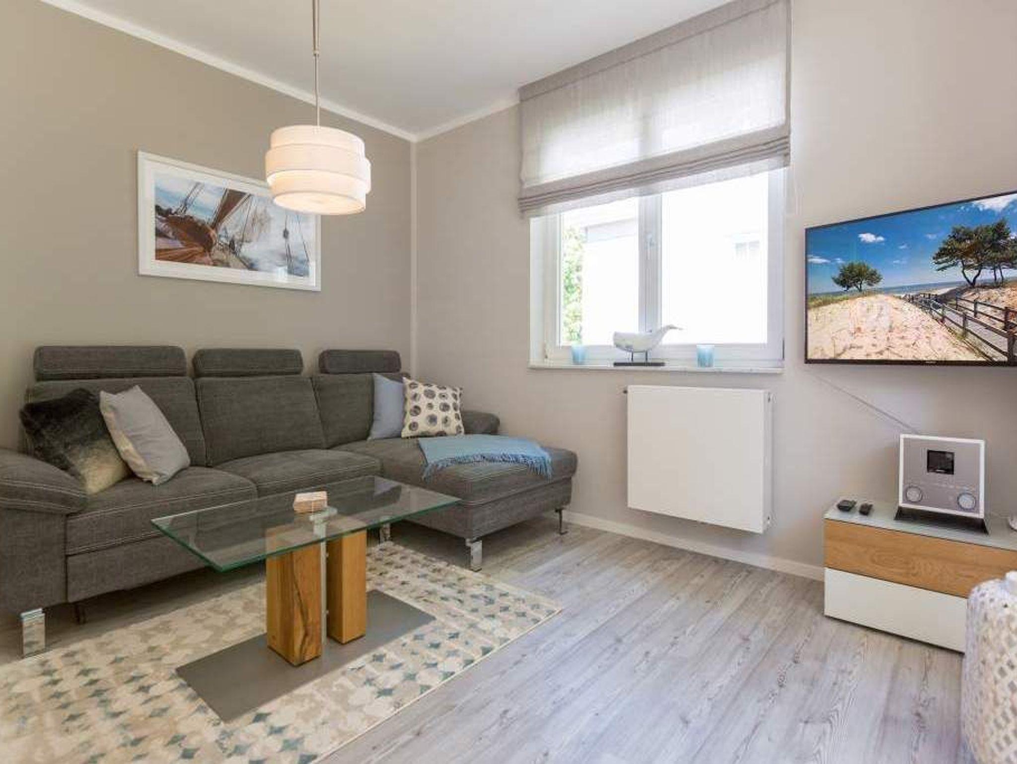 Durch das satte Grün der Bäume schimmert glitzernd blau die Ostsee hindurch. Morgens bei Sonnenschein auf dem Balkon zu sitzen, den Vögeln und dem Meeresrauschen zu lauschen, ist ein perfekter Start in den Urlaubstag. Ob allein oder zweit in diesem exklusiven und modernen Ferienappartement wird Ihre Erholung zum entspannten Genuss. Denn viel Platz, Leichtigkeit und Stil prägen die schick eingerichtete, 66 Quadratmeter große Wohnung. Hier gibt es nicht nur ein Highlight, das Ihre Ostseeauszeit zu etwas ganz Besonderem macht. Neben den beiden Balkonen vom Wohnzimmer aus und vom Schlafzimmer aus begehbar erwartet Sie hier eine kleine Wohlfühloase, die das ganze Jahr über ihre Reize hat. Gerade auch im Winter bietet dieses Urlaubsdomizil die Möglichkeit zur Entspannung. Wenn die Bäume kahl und starr vom kalten Nordost klirren und den Blick auf die schier endlose, in manchen Jahren sogar zugefrorene Ostsee frei geben, können Sie sich diese Landschaft aus dem Wohn- und dem Schlafzimmer, aber auch aus der kuschelig warmen Panorama-Sauna heraus anschauen. Denn auch die mit einem LED-Farblichtsystem versehene Sauna ( für finnischen Saunabetrieb und BIO-Betrieb mit Verdampfer) gehört zu der Wohnung Nummer 7 im 2. Obergeschoss der Villa Barbara dazu. Die unterschiedlichen Lichtstimmungen sorgen zusätzlich für Entspannung pur. Ruhe und Erholung finden Sie zudem in dem geräumigen Wohn-Esszimmer. Eine gemütliche Sofalandschaft lädt zum Relaxen vor dem großen Flat-TV ein. Eine Media-Anlage offeriert Internet Radio und Bluetooth Streaming. Das WLAN ist kostenfrei. Die offene Küche ist mit hochwertigen Geräten und Geschirr voll ausgestattet. Essen können Sie am schönen Echtholztisch. Die große, bodentiefe Fensterfront lässt viel Licht hinein. Echtes Schlafvergnügen gewährleistet im ebenso schönen Schlafzimmer ein komfortables Boxspringdoppelbett (1,60 m x 2,00 m). Viel Ablage bietet der große Kleiderschrank. Auch in diesem Zimmer befindet sich ein Flat-TV. Von hier aus haben Sie Zugang zu einem zweiten Balkon. Genießen Sie hier auf den Sonnenliegen den Sommer. Im Badezimmer steht Ihnen neben dem Zugang zur Sauna eine ebenerdige und sehr geräumige Regendusche, ein Waschtisch und ein WC zur Verfügung. Bei Ihrer Anreise liegen die Handtücher für Sie bereit und das Bett ist bezogen. Ein Pkw-Stellplatz befindet sich am Haus. Für den Tag am Strand steht Ihnen in den Sommermonaten ein Strandkorb (je nach Witterung) zur Verfügung.