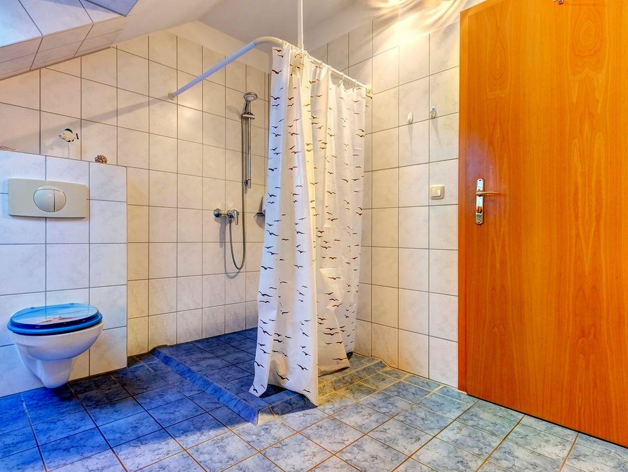 Im Badezimmer befinden sich neben der Toilette eine große, ebenerdige Dusche sowie ein Waschtisch mit Spiegel.