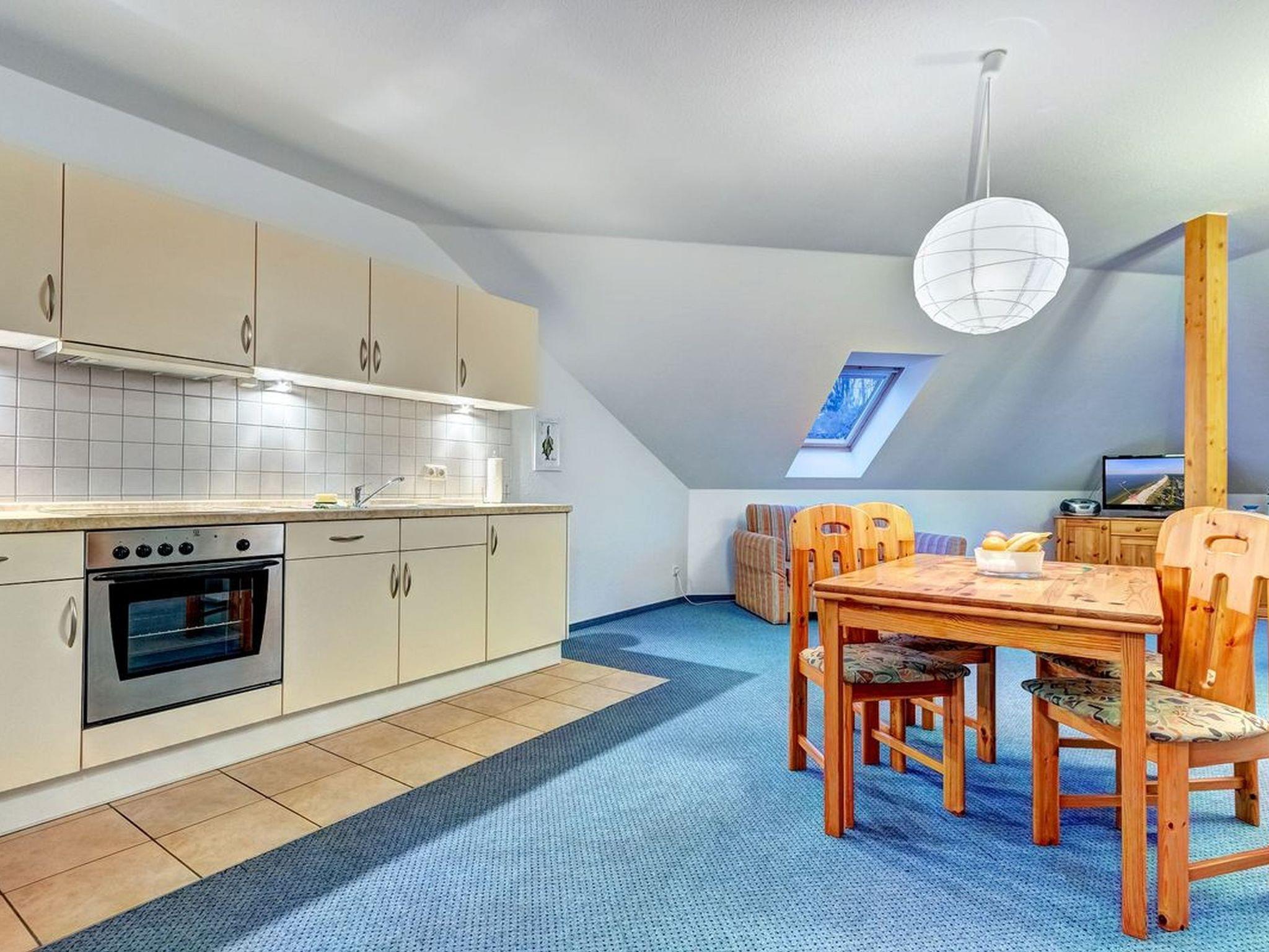 Über eine Treppe erreichen Sie die separate Eingangstür zu Ihrer Ferienwohnung Möwe. Der Wohn- und Essbereich bietet viel Platz zum Kochen, Entspannen und gemütlichem Beisammensein.