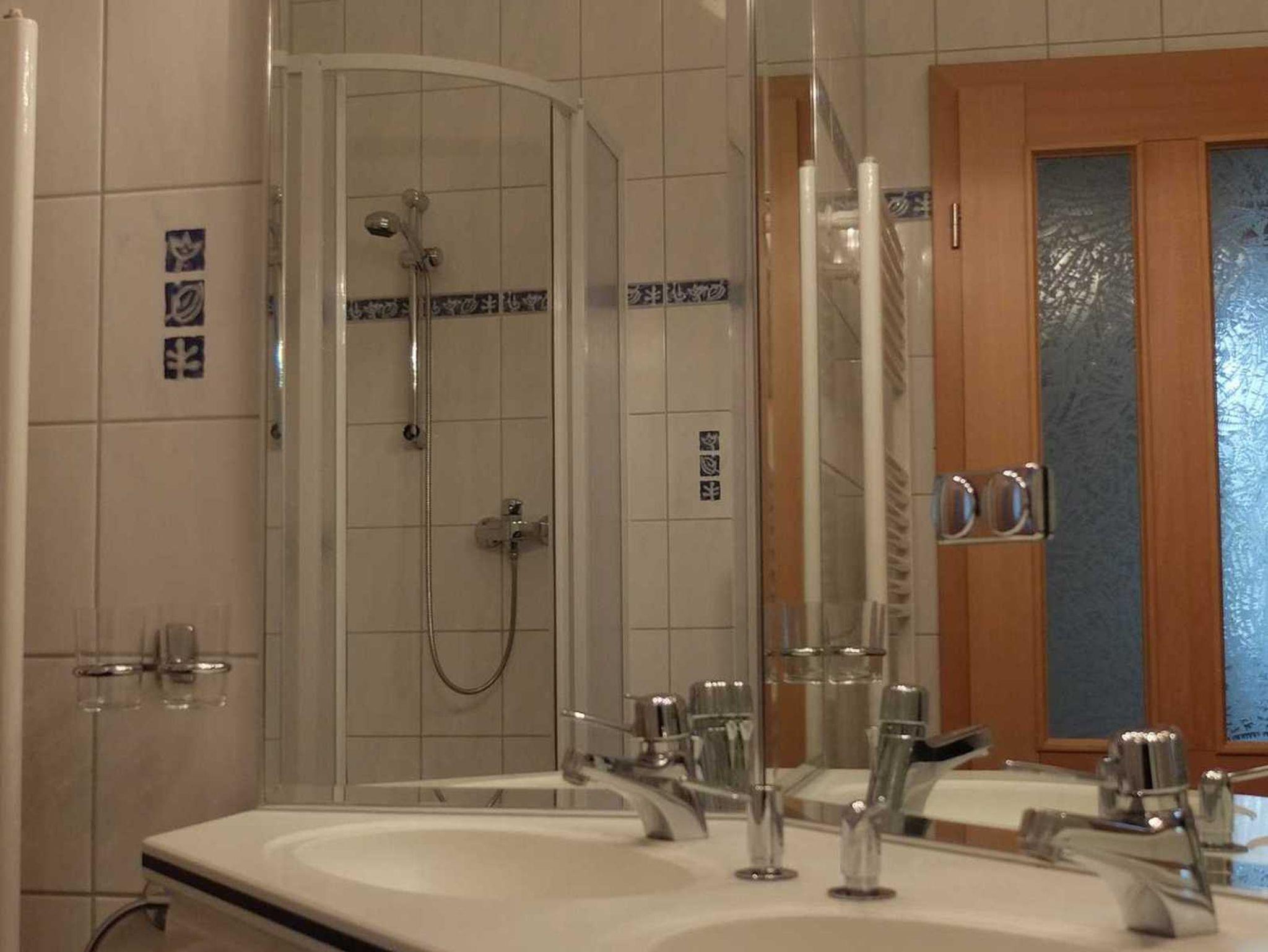 Die moderne großzügige 3 Raum Ferienwohnung befindet sich im 1. OG. (85 m²). Sie verfügt über zwei separate Schlafzimmer. Das 1. Schlafzimmer ist mit einem Doppelbett ausgestattet. Im 2. Schlafzimmer befinden sich zwei Einzelbetten. Im Wohnzimmer befindet sich eine Schlafcouch. Eine Aufbettung ist auf Anfrage möglich. Zur weiteren Ausstattung gehört eine komplette Küchenzeile (mit Geschirrspüler, Cerankochfeldherd, Backofen und Mikrowelle), Sat-TV und Radio. Das Bad ist mit einer Dusche und WC ausgestattet. Erstausstattung Bettwäsche und Handtücher sind inklusive.