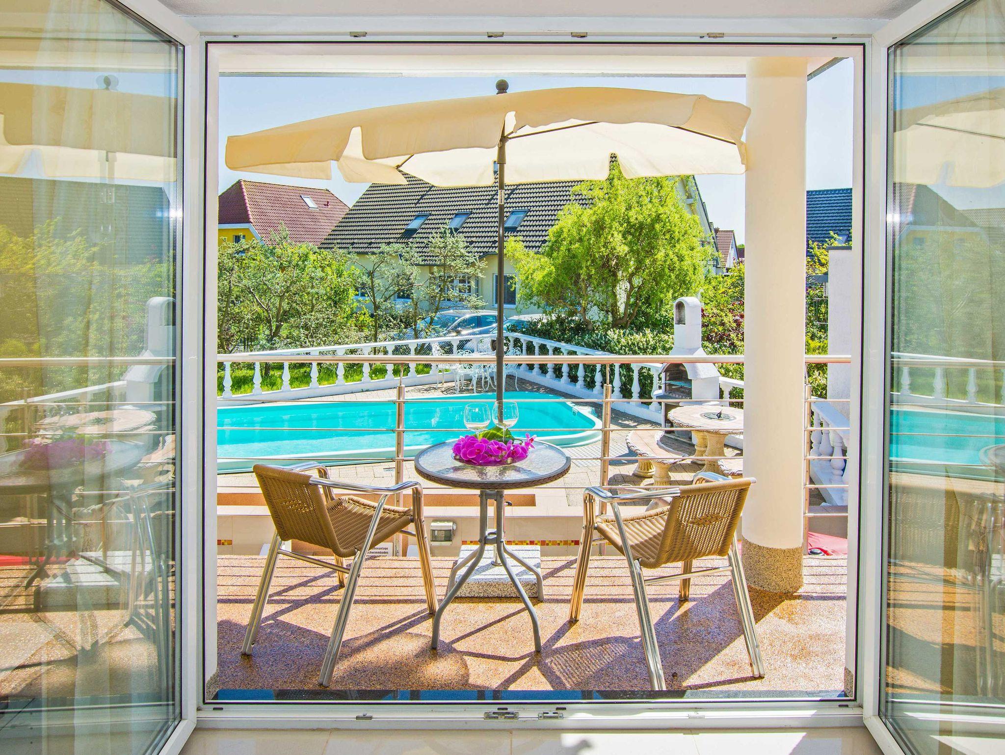 An der Seite der Villa Europa vorbei über die Terrasse gelangen Sie direkt zum sonnenbeheizten gemeinschaftlichen Außenpool, zum Grillplatz, zu den Sonnenliegen sowie zu dem XXL-Strandkorb.