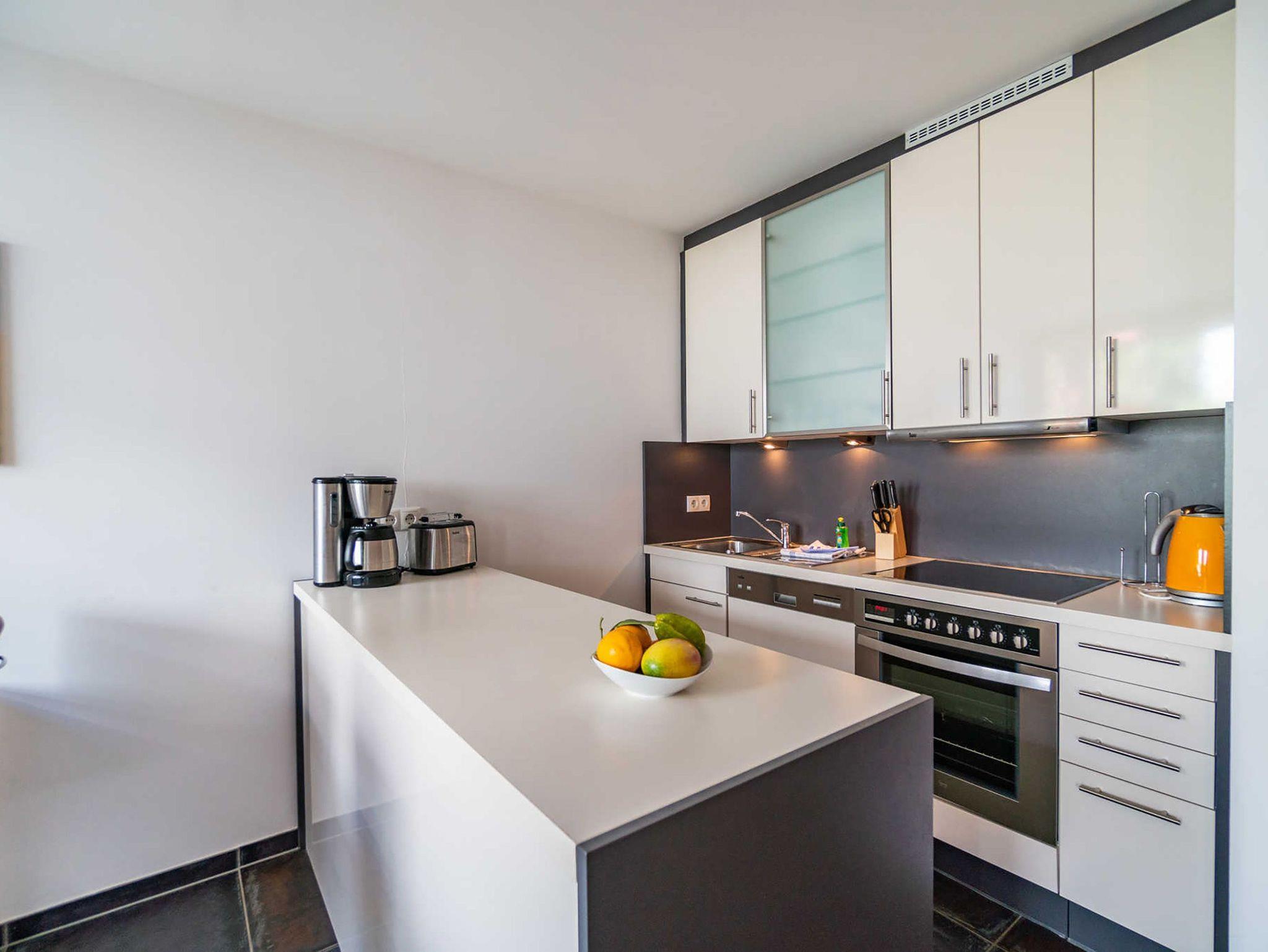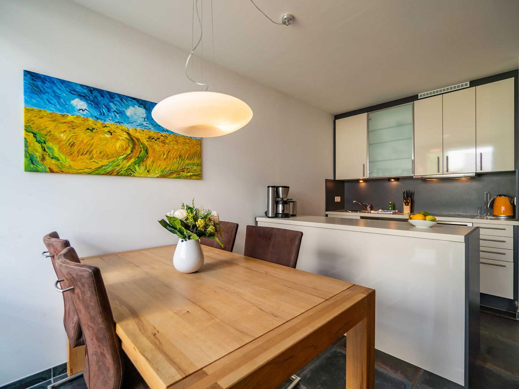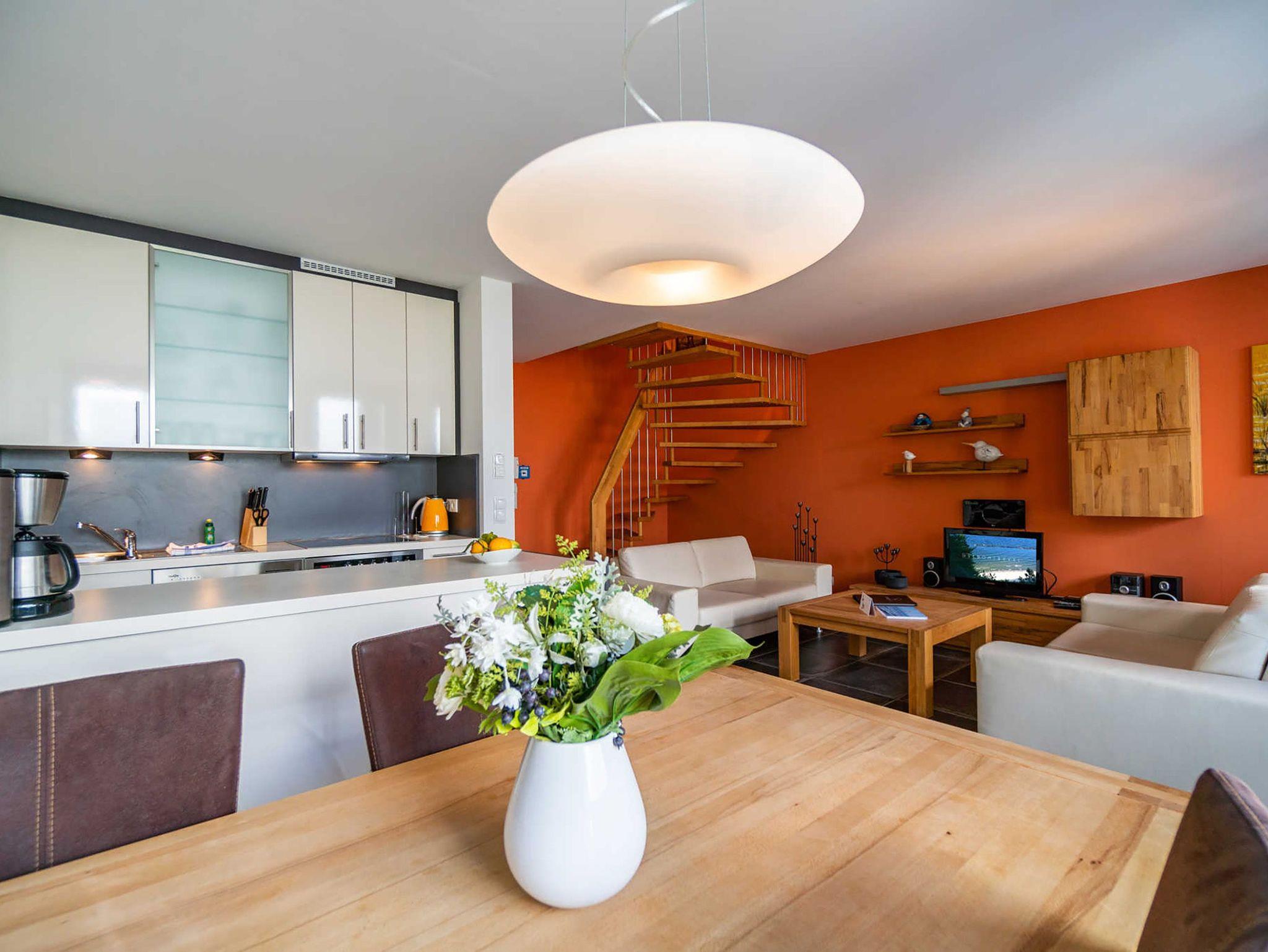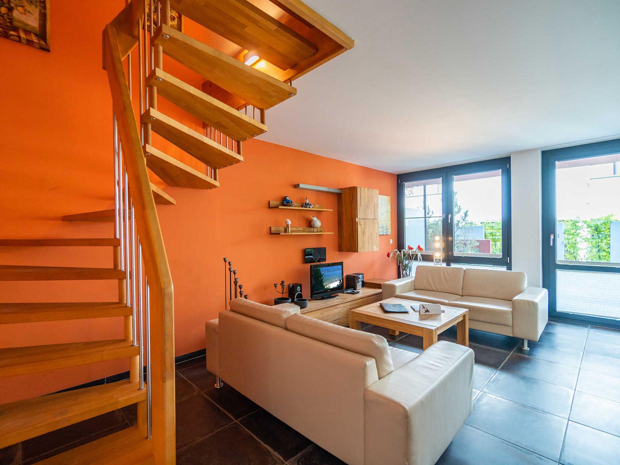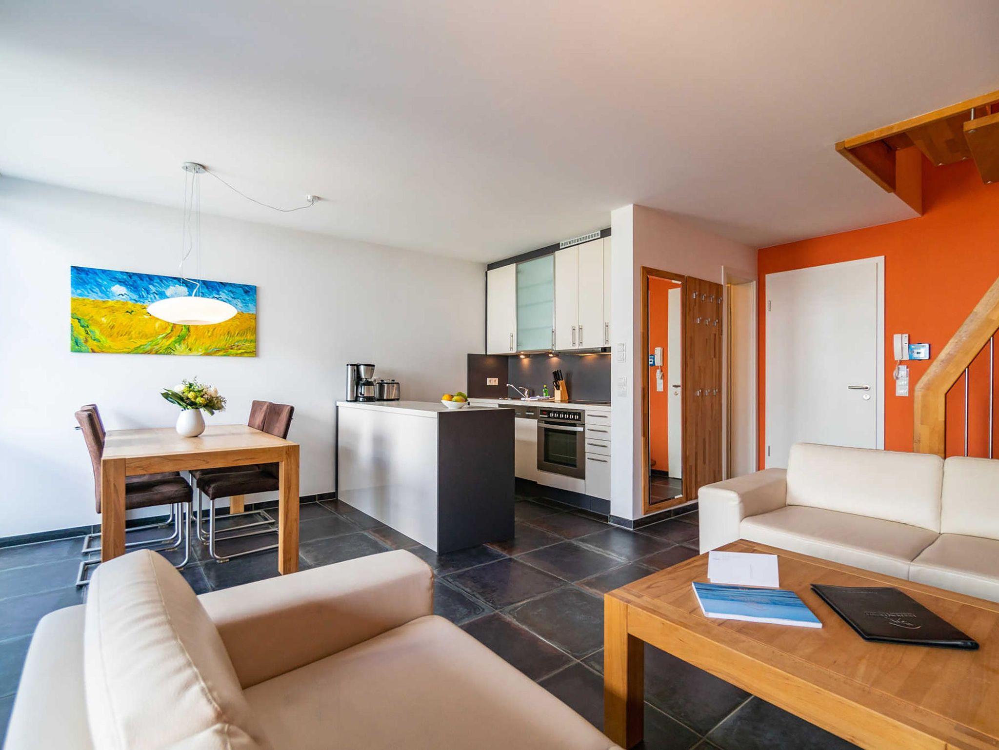 Willkommen in Ihrem Wohlfühldomizil über zwei Etagen! Diese geschmackvolle 3-Raum-Maisonette-Ferienwohnung überzeugt nicht nur durch ihre hochwertige, moderne Einrichtung. Sie bietet 4 Personen Platz. Im Erdgeschoss finden Sie den Wohnbereich mit Sitzgruppe und einer komplett ausgestatteten Küchenzeile. Die wohnungseigene Sauna im Bad mit WC und Dusche bereitet besonders in der kalten Jahreszeit eine angenehme Abwechslung. Eine schöne Terrasse mit Gartenmöbeln lädt zum Entspannen und Verweilen ein. Über eine Treppe erreichen Sie im Obergeschoss zwei Schlafzimmer mit Doppelbetten und ein Bad mit Badewanne, WC und Waschmaschine. Für Ihren Komfort steht die Erstausstattung Wäsche (Bettwäsche [&] Handtücher) für Sie bereit. Auf Wunsch stellen wir für unsere kleinen Gäste ein Kinderreisebett (ohne zusätzliche Matratze [&] Bettzeug) und einen Kinderhochstuhl ( gegen einen Aufpreis) zur Verfügung.