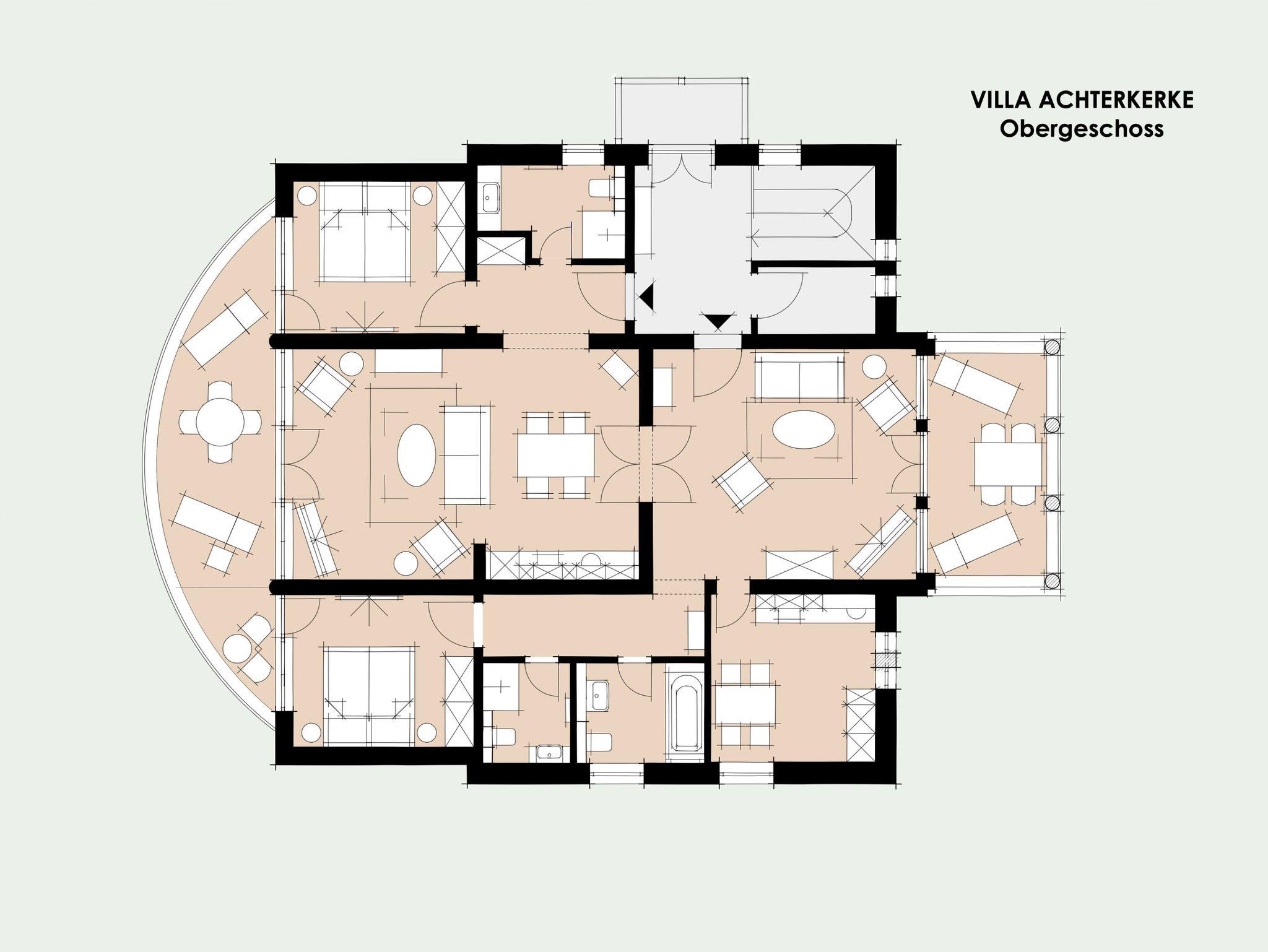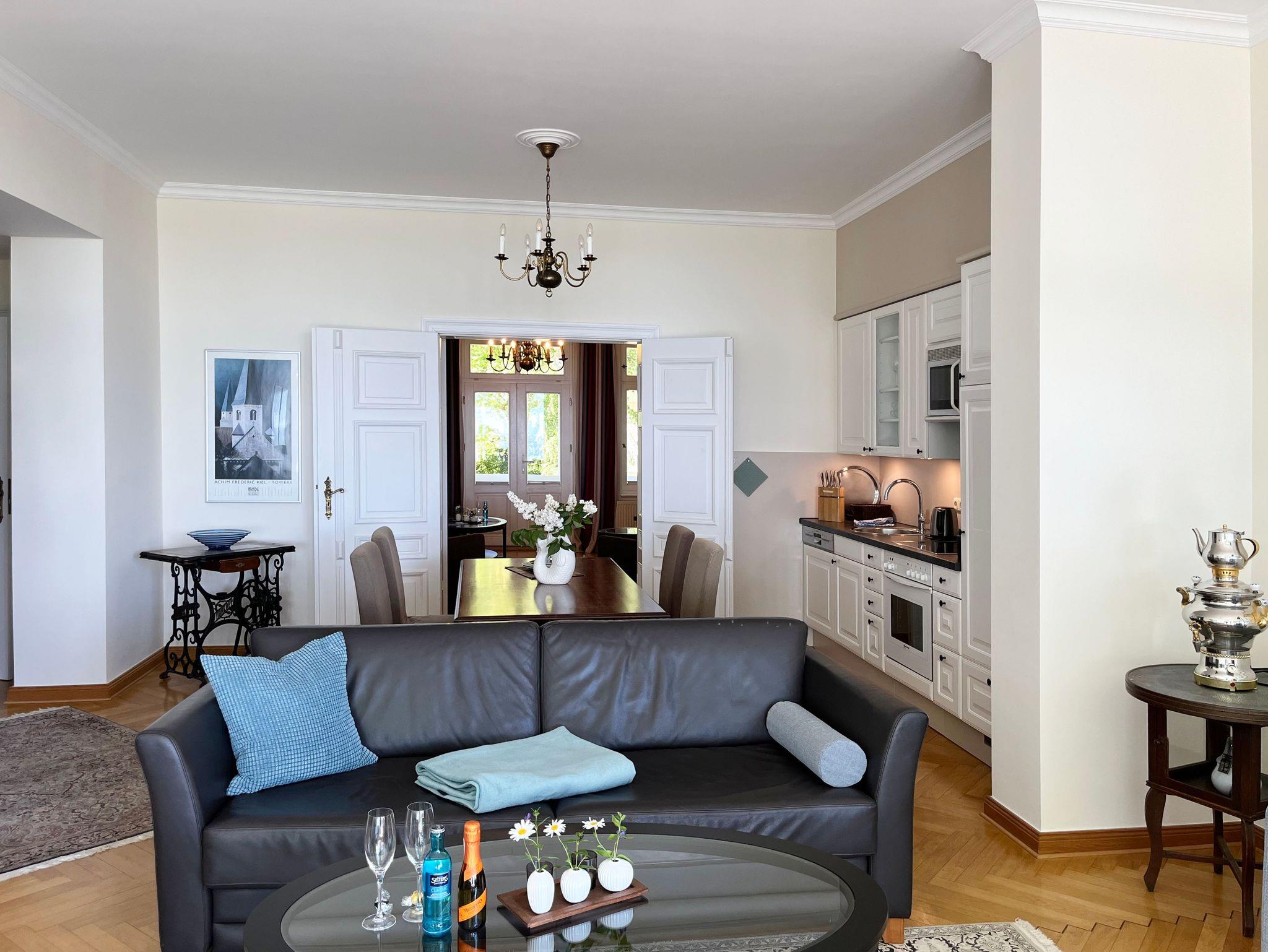 Sie bewohnen großzügig eine komplette Etage der Villa mit zwei Schlafzimmern und Bädern. Dabei genießen Sie die vorteilhafte Ausrichtung des Hauses mit dem herrlichen Meerblick auf der Nord-Ost-Seite und dem historischen Verandenvorbau auf der Süd-West-Seite, mit Sonnenschein bis in die Abendstunden. Da eine Etage aus zwei miteinander verbundenen Wohnungen besteht, kann durch Schließen der zweiflügeligen Verbindungstüren eine Trennung der Wohnbereiche vorgenommen werden. Ausgesuchte Möbelstücke und Bilder, Echtholz-Parkett - teils mit hochwertigen Teppichen belegt ? prägen den Stil des Hauses. Die Meerblick-Schlafzimmer sind mit manufakturgefertigten Edelstahlbetten, Einbauschränken incl. Safe, Flachbild-TV sowie Verdunklung und Insektenschutz ausgestattet. Komfortable Leder(Schlaf)couches in den Wohnzimmern können als zusätzliche Schlafgelegenheiten genutzt werden. Zum Inventar gehören weiterhin Smart-TV`s mit Soundbar - zur einfachen Verbindung mit dem Smartphone, iPad oder einem anderen bluetoothfähigen Gerät - sowie DVD-Player. Es steht eine komplett ausgestattete, in sich abgeschlossene Küche (Kühlschrank mit Gefrierfach, Backofen, Cerankochfeld, Dunstabzug, Mikrowelle, Toaster, Wasserkocher, Filter-Kaffeemaschine u. Nespresso-Kapselmaschine, Rührgerät etc.) zur Verfügung. In den meerseitigen Wohnbereich ist eine weitere komplett ausgestattete Küchenzeile integriert. Bei den Bädern handelt es sich um Tageslicht-Badezimmer, wobei ein Bad zusätzlich mit einer Badewanne ausgestattet ist.