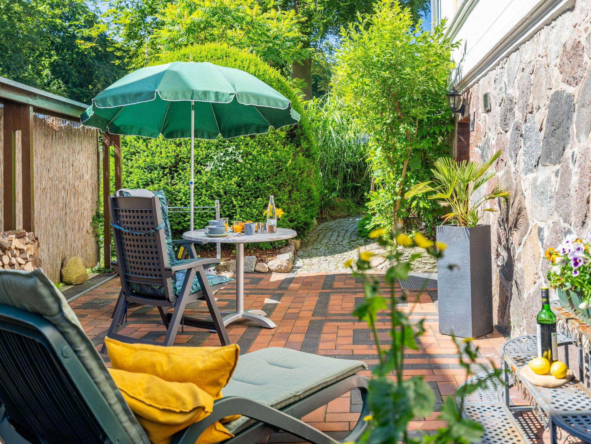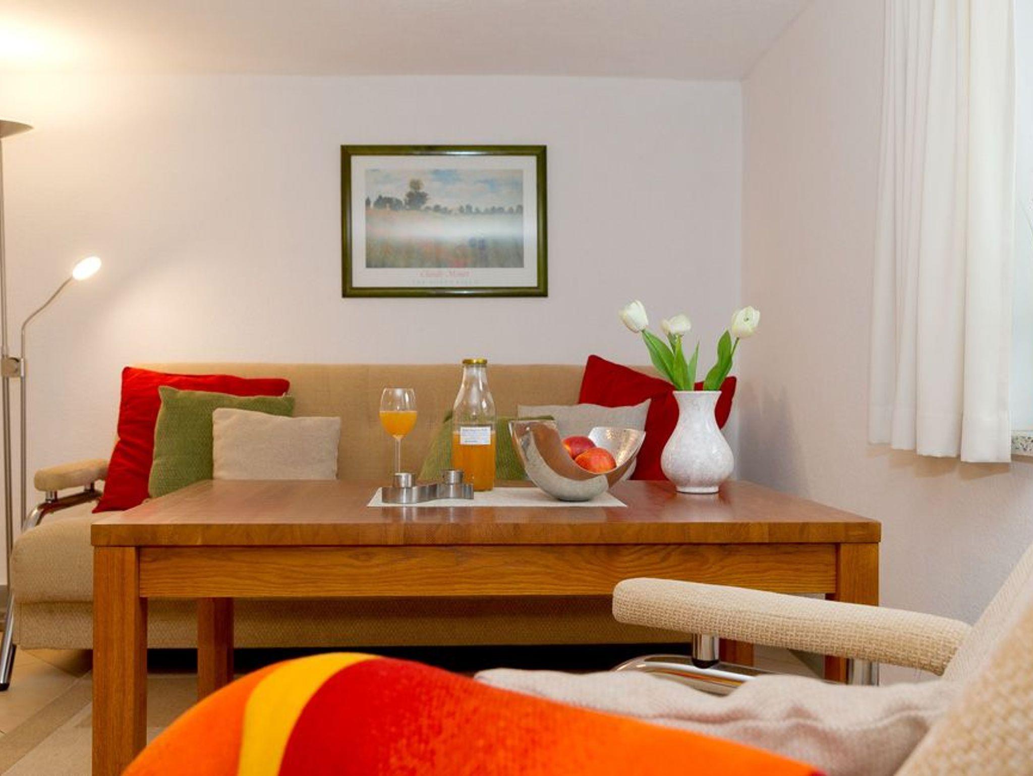 Das Zwei-Zimmer-Appartement befindet sich im Souterrain des vorderen Hauses und bietet mit seiner 35 Quadratmeter großen Wohnfläche ausreichend Platz für einen erholsamen Urlaub zu zweit. Warme mediterrane Farben schaffen in Wohn- und Schlafzimmer eine angenehme und gemütliche Atmosphäre. Der Wohnraum ist mit bequemen Polstermöbeln ausgestattet, die nach einem anstrengenden Tag zum Entspannen einladen. Ein moderner Flat-TV macht es möglich, dass Sie auch im Urlaub auf keine Ihrer Lieblingsserien verzichten müssen. Das gemütliche Doppelbett (180 x 200cm / zwei getrennte Matratzen) lockt für die Nachtruhe, aber auch für ein Schlummerstündchen am Nachmittag.