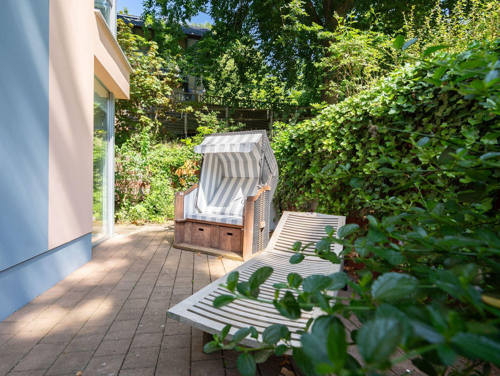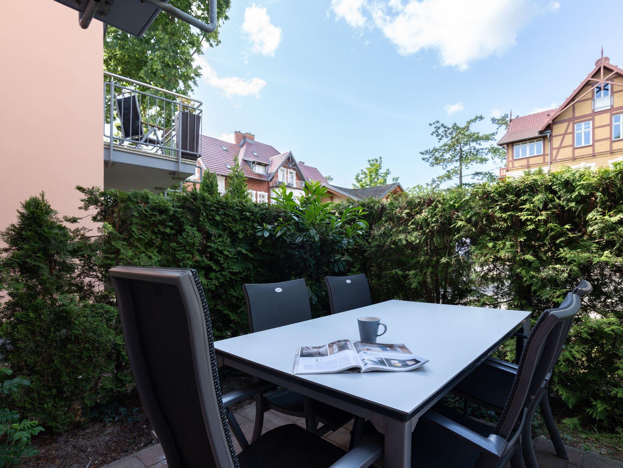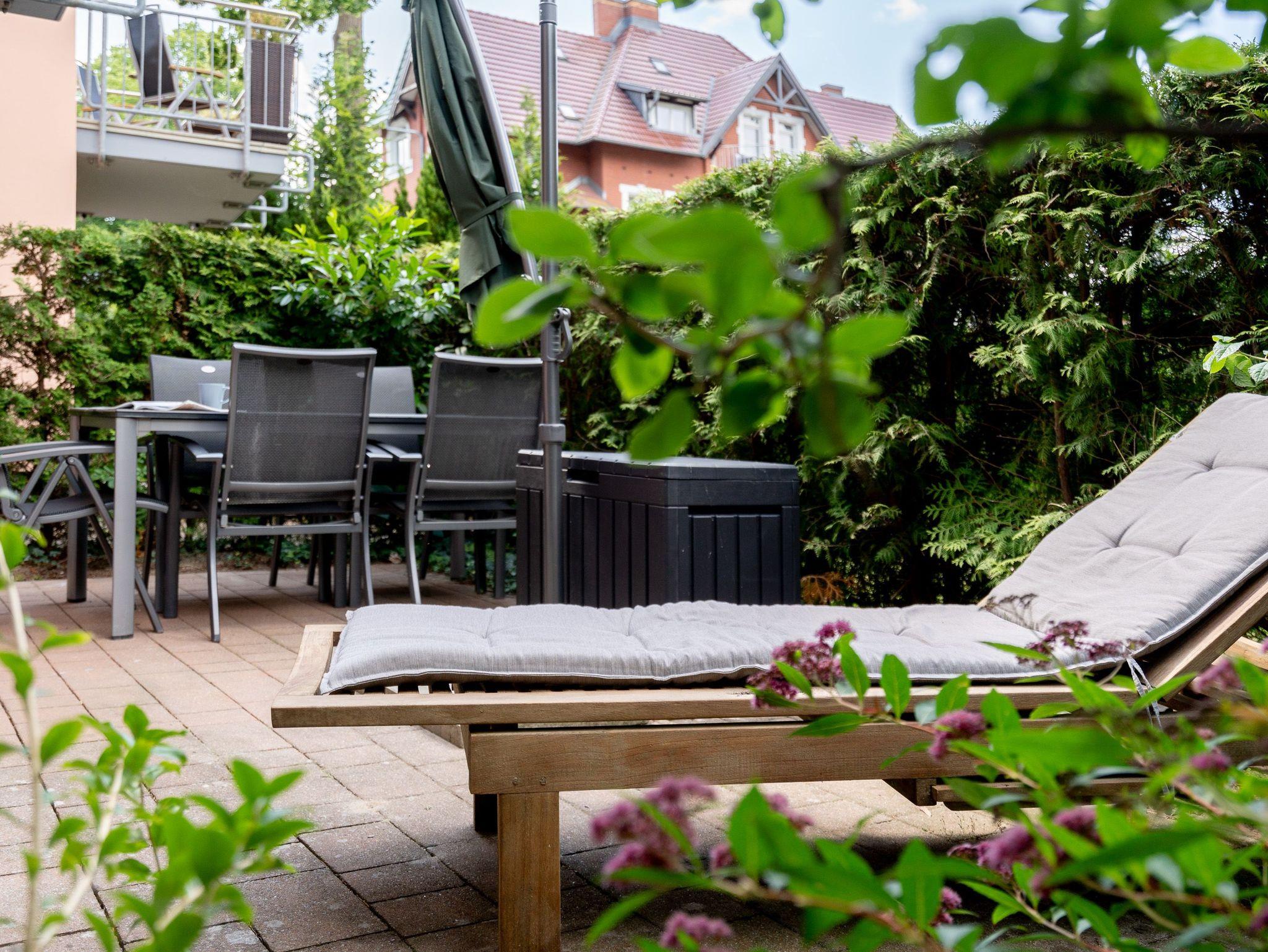 Wellness, Entspannung und die unmittelbare Nähe zum Meer machen die Erdgeschoss-Ferienwohnung 10 zu einem ganz besonderen Urlaubserlebnis. Die helle und modern eingerichtete Wohnung bietet drei stilvolle Zimmer, eine perfekt ausgestattete Küchenzeile mit großem Esstisch und gemütlichen Sitzbänken sowie einen Designer-Elektrokamin, der für eine behagliche Atmosphäre sorgt. Das luxuriöse Badezimmer verwöhnt mit hochwertigen Markenmöbeln, einem Doppelwaschtisch und einem Duschpaneel mit Fitness- und Massagefunktion. Ein besonderes Highlight ist die integrierte Tylö Infrarotsauna mit Farblicht, Touch-Bedienfeld, Bluetooth und Carbonstrahlern, die nach ausgedehnten Spaziergängen am Wasser oder an warmen Sommertagen wie auch in der kalten Jahreszeit für pure Entspannung sorgt. Das erste Schlafzimmer lädt mit einem komfortablen 1,80 m x 2,00 m Boxspringbett aus Leder, einem Smart-TV, einem geräumigen Schrank sowie einem angenehmen Blick in den angrenzenden Gartenbereich zum Träumen ein. Das zweite Schlafzimmer präsentiert sich in modernem Industrial-Design und bietet ein 1,40 m x 2,00 m Doppelbett sowie einen weiteren Smart-TV. Besonderen Komfort bieten die beiden großzügigen Terrassen: Während die hintere Terrasse zum sonnigen Frühstück einlädt, bietet die vordere den perfekten Platz für entspannte Nachmittage und gemütliche Abendstunden. Zwei Liegen, komfortables Außenmobiliar und ein Strandkorb sorgen für zusätzlichen Genuss. Alle Räume sind mit Insektenschutz ausgestattet, sodass ungestörte Erholung garantiert ist. Für Familien mit kleinen Kindern stehen auf Wunsch ein Kinderreisebett (ohne zusätzliche Matratze [&] Bettzeug) sowie ein Hochstuhl zur Verfügung. Damit der Urlaub von Anfang an entspannt beginnt, sind die Betten bei Anreise bereits bezogen und frische Handtücher liegen bereit. Genießen Sie einen erholsamen Urlaub in erster Reihe zum Strand ankommen, abschalten und wohlfühlen.