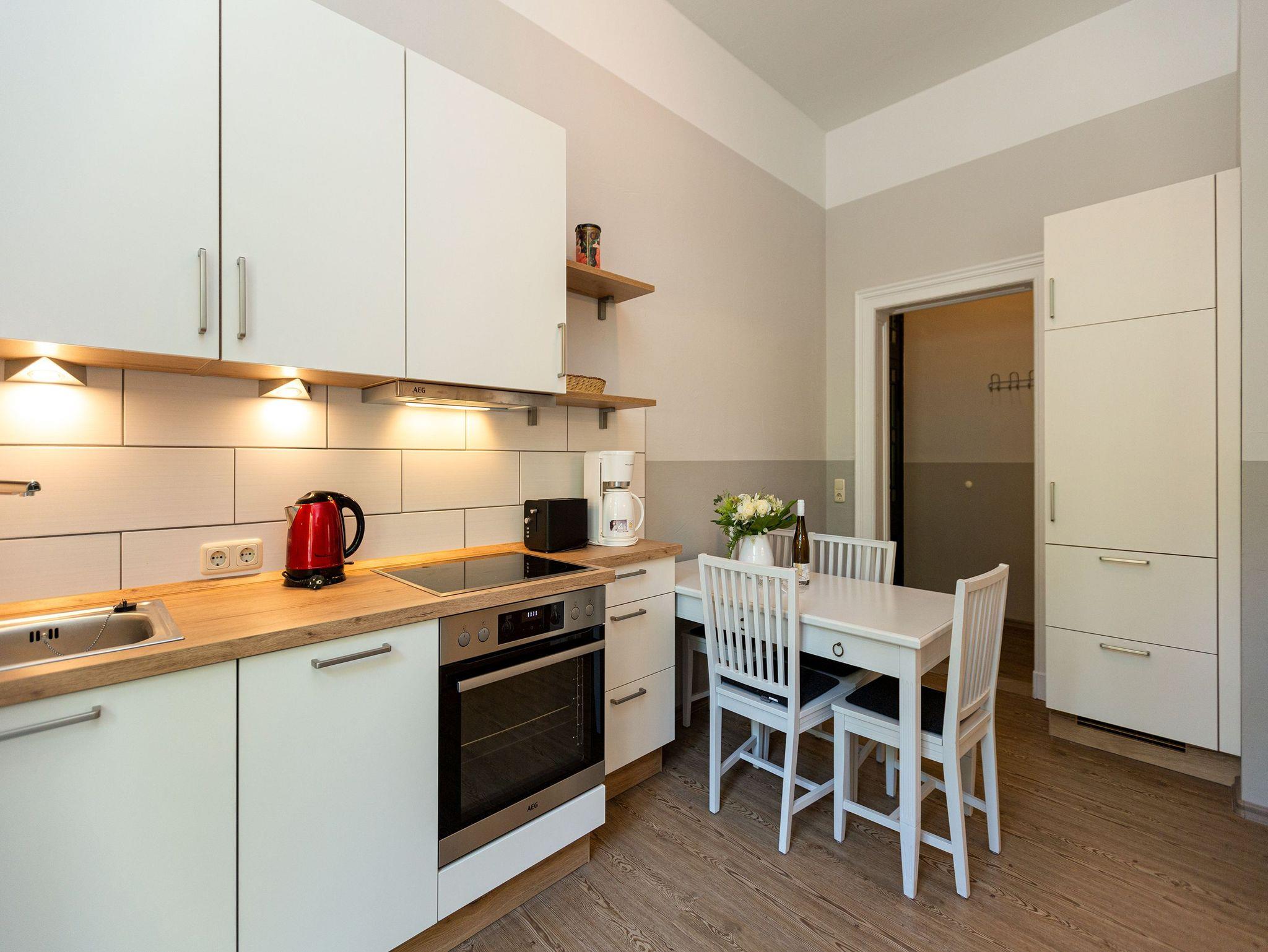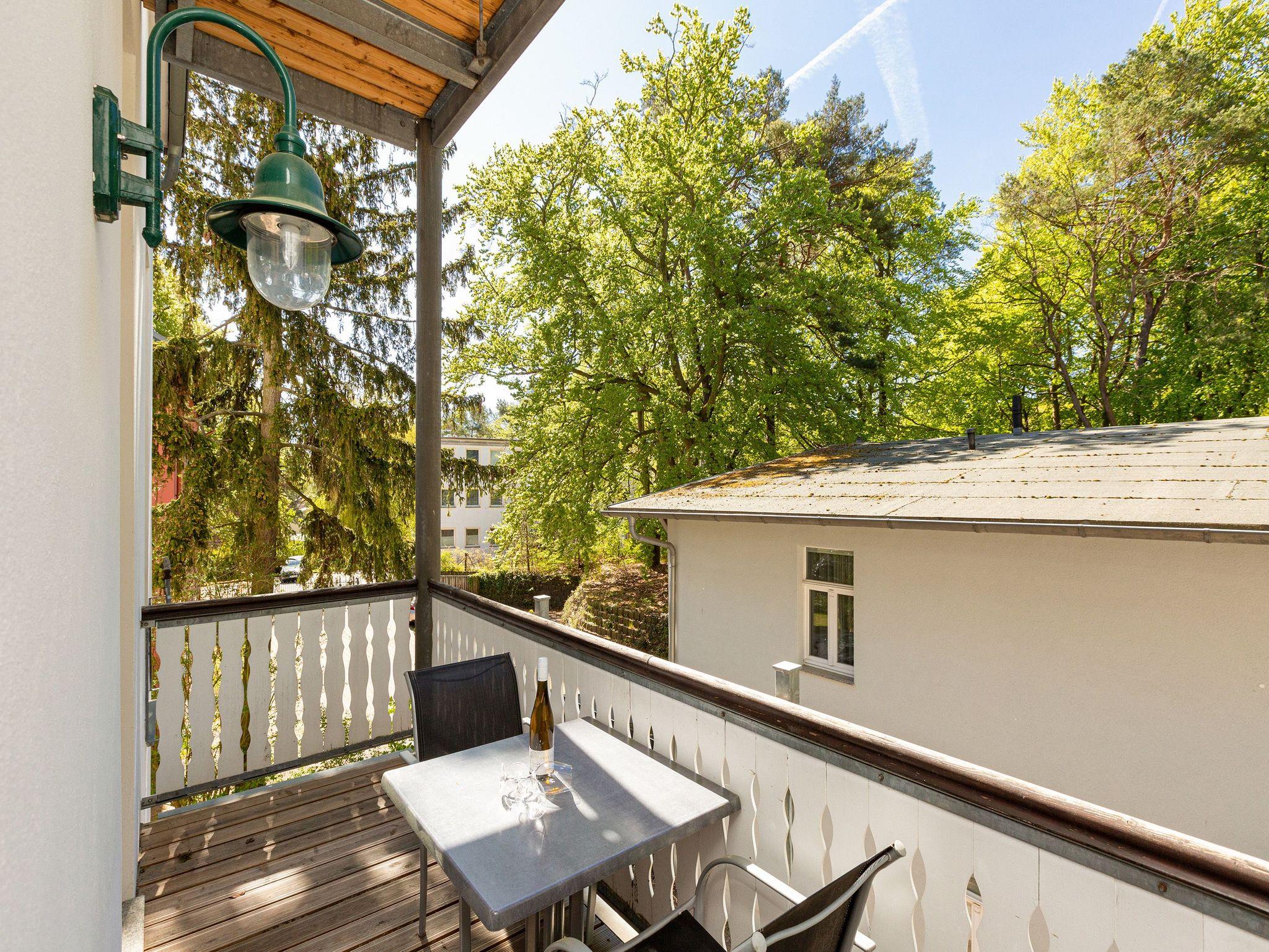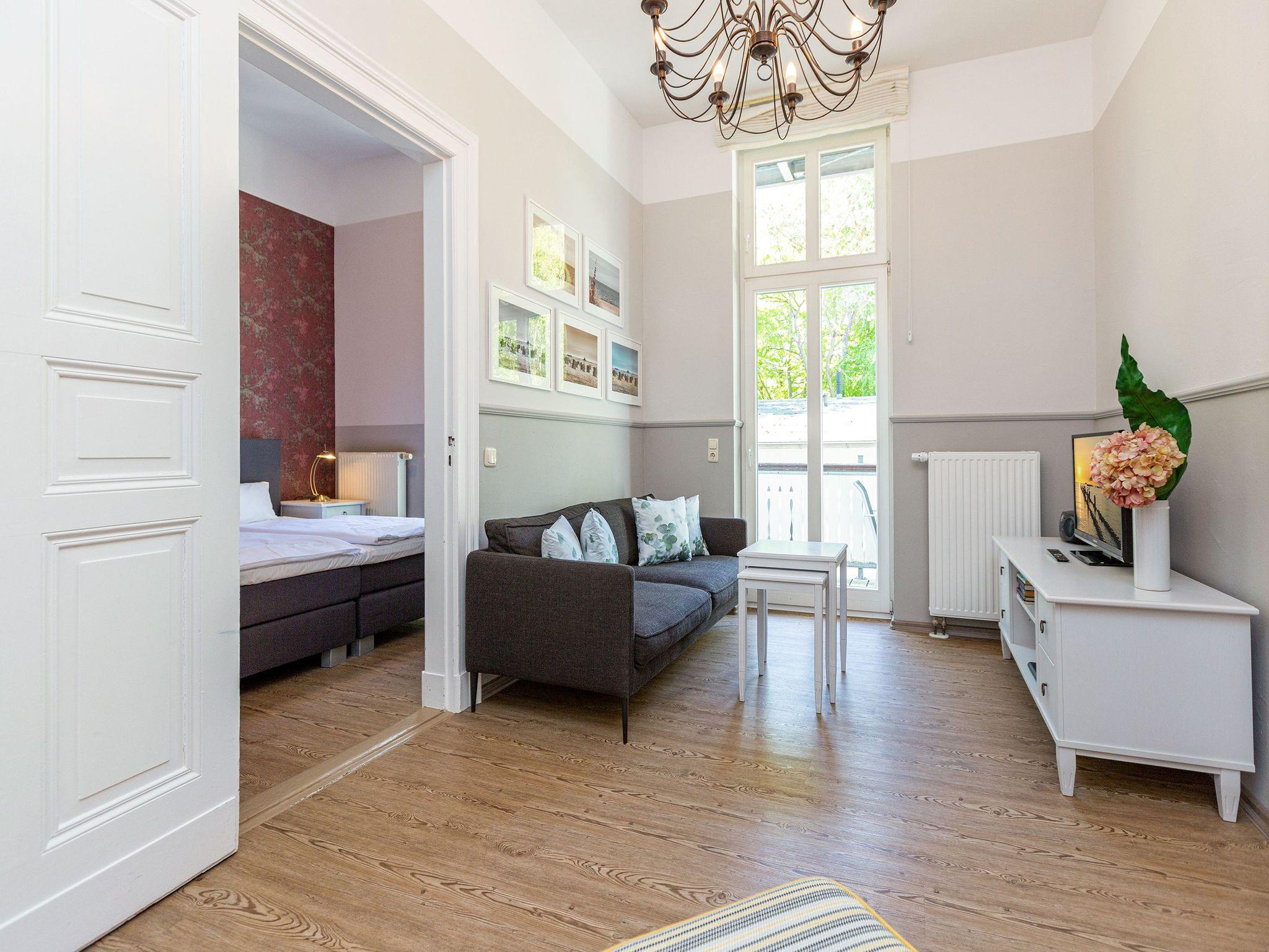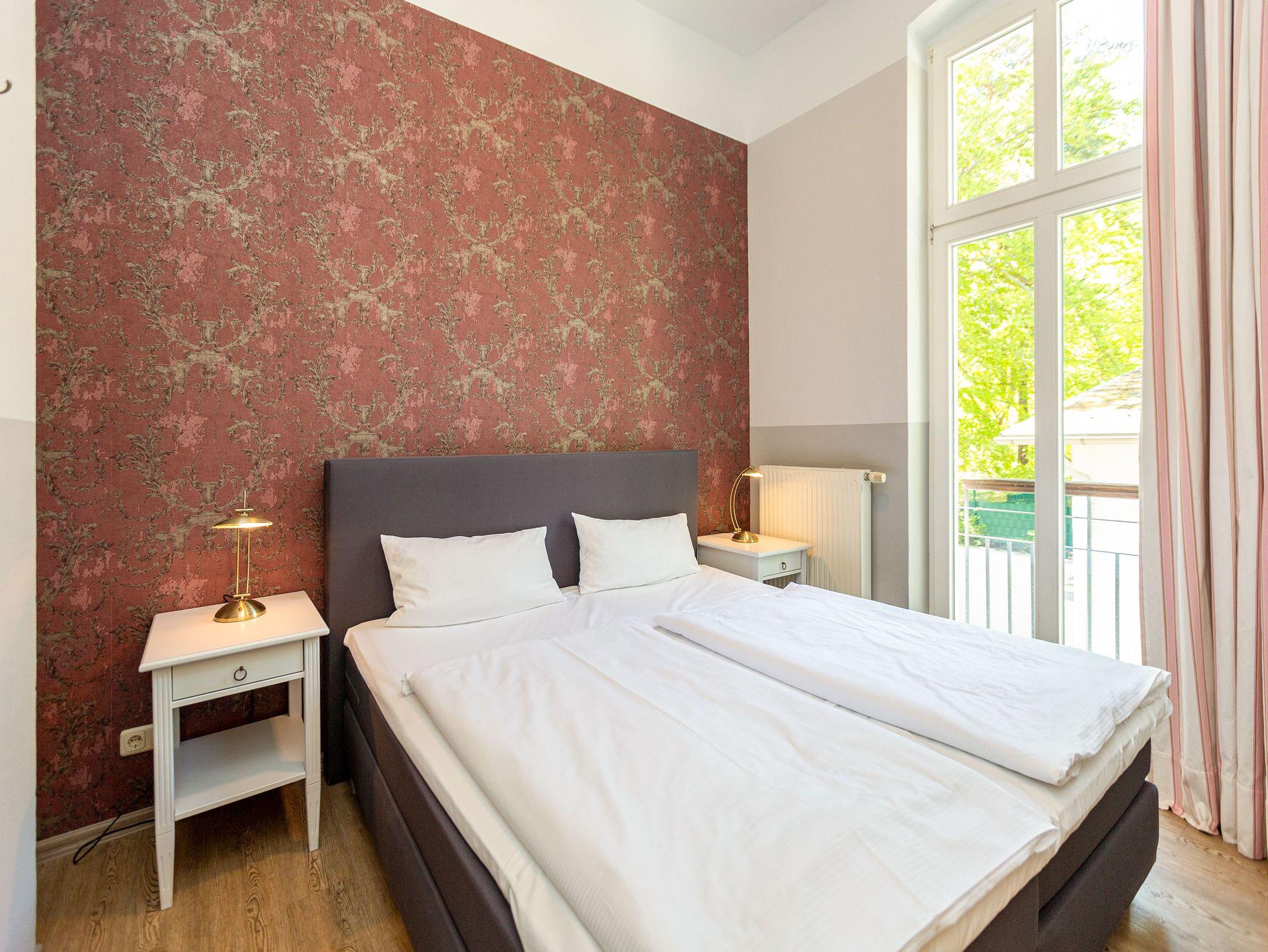 Morgens bei lichter Sonne erwachen in einem komfortablen und kuscheligen Boxspringdoppelbett. Das einzige, was zu hören ist, sind die Vögel in den Bäumen und von ganz ferne das leise Rauschen der Ostsee. So kann ein Urlaubstag beginnen. Und so beginnt er in dem schönen Drei-Zimmer-Appartement Nr. 8 im 1. Stock der Villa Amelia garantiert. Hohe und helle Räume lassen das Gefühl von Leichtigkeit und Unbeschwertheit aufkommen. Mit edlen Vintage-Möbeln eingerichtet, verströmt das Urlaubsdomizil auf seinen 50 Quadratmetern das Laissez-faire einer mondänen und längst vergangenen Zeit. Ohne den Komfort und die Technik von Heute vermissen zu lassen. So sorgt ein großer Flat-TV für Unterhaltung. Die Küche - separat, doch offen - ist mit allen Geräten und feinem Geschirr ausgestattet. In den zwei Schlafzimmern können bis zu 3 Erwachsene [&] 1 Kind bis 15 Jahre Ruhe finden. Ein Schlafzimmer verfügt über ein Boxspringdoppelbett, das andere über zwei einzeln stehende Boxspringbetten. Das Marmor-geflieste Bad hat ebenfalls Charme und ist mit Dusche, WC und Waschtisch ausgestattet. Vom Wohnzimmer und von der Küche aus geht?s auf einen kleinen Balkon. Hier können Sie gemütlich essen, trinken und einfach das viele Grün um Sie herum genießen. Und für einen rundum sorglosen Urlaubsgenuss ist ebenfalls gesorgt. Denn Ihre Betten sind bei Anreise bereits bezogen und Handtücher liegen für Sie bereit. Das WLAN Netz im Haus kann kostenfrei genutzt werden. Für Ihr Auto steht Ihnen am Haus ein Stellplatz zur Verfügung.