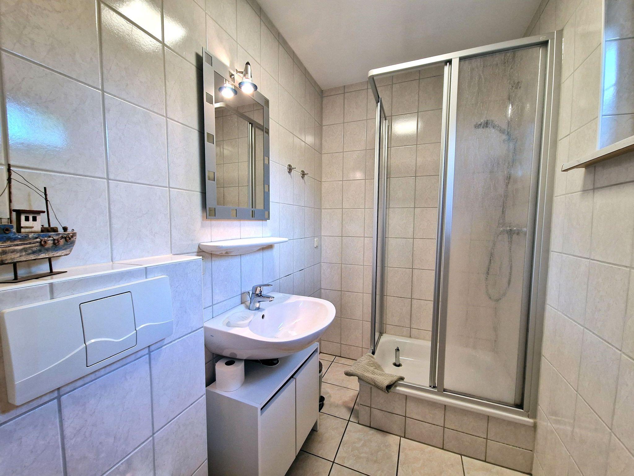 Im unteren Bereich erwartet Sie ein modernes Bad mit Dusche und WC sowie eine offene Küchenzeile, die alles bereithält, was Sie für einen sorgenfreien Ostseeurlaub benötigen. Hier finden Sie auch eine gemütliche Sitzecke, in der Sie nach einem schönen Tag entspannen können. Eine Mikrowelle steht Ihnen gegen Kaution zur Verfügung.