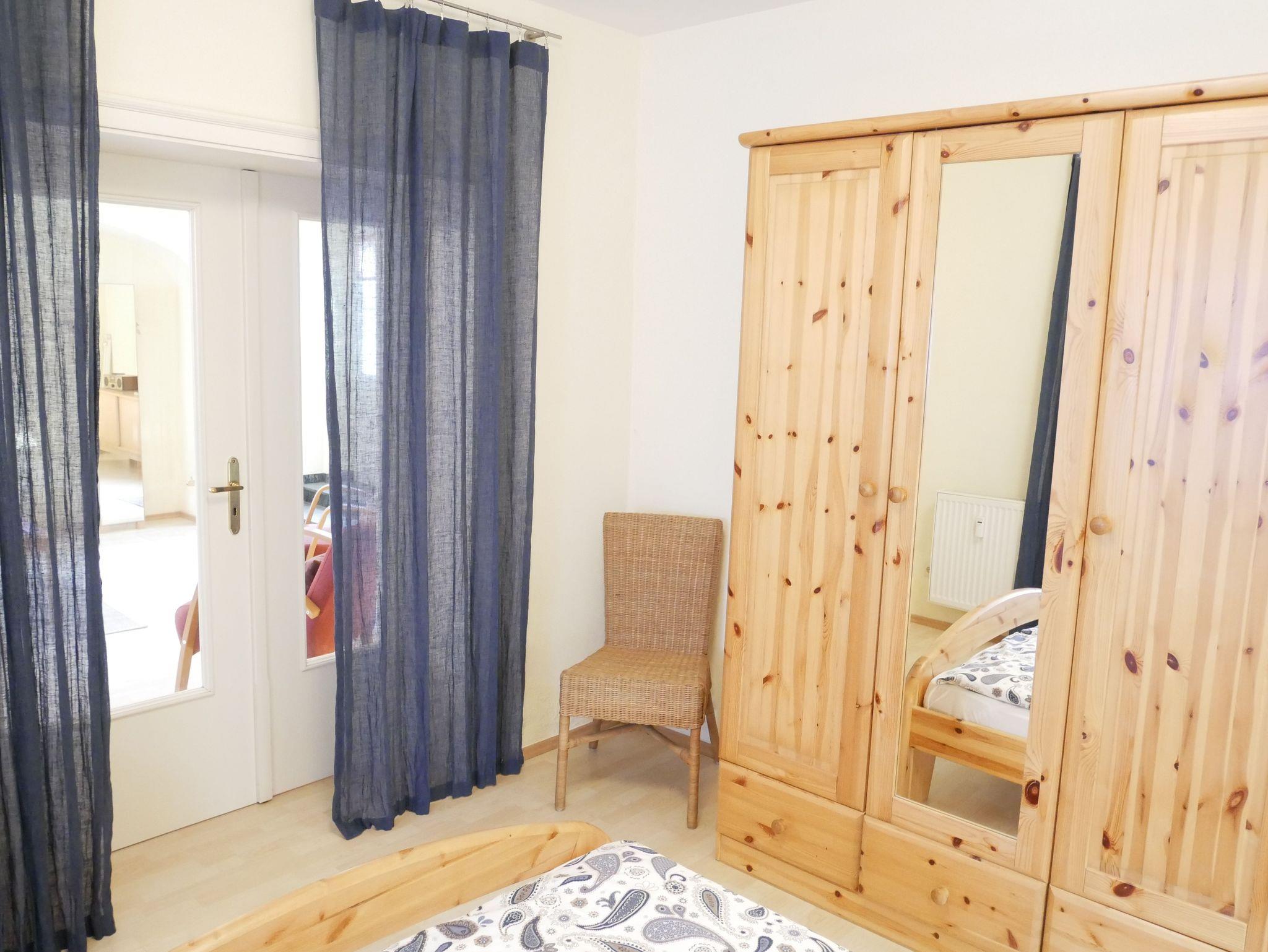 Das Schlafzimmer verfügt über ein Doppelbett 1,40m x 2,00m, einen Kleiderschrank (Raum ohne Fenster, aber zur einen Seite mit einer verglasten Tür und zur anderen Seite mit einem Vorhang).