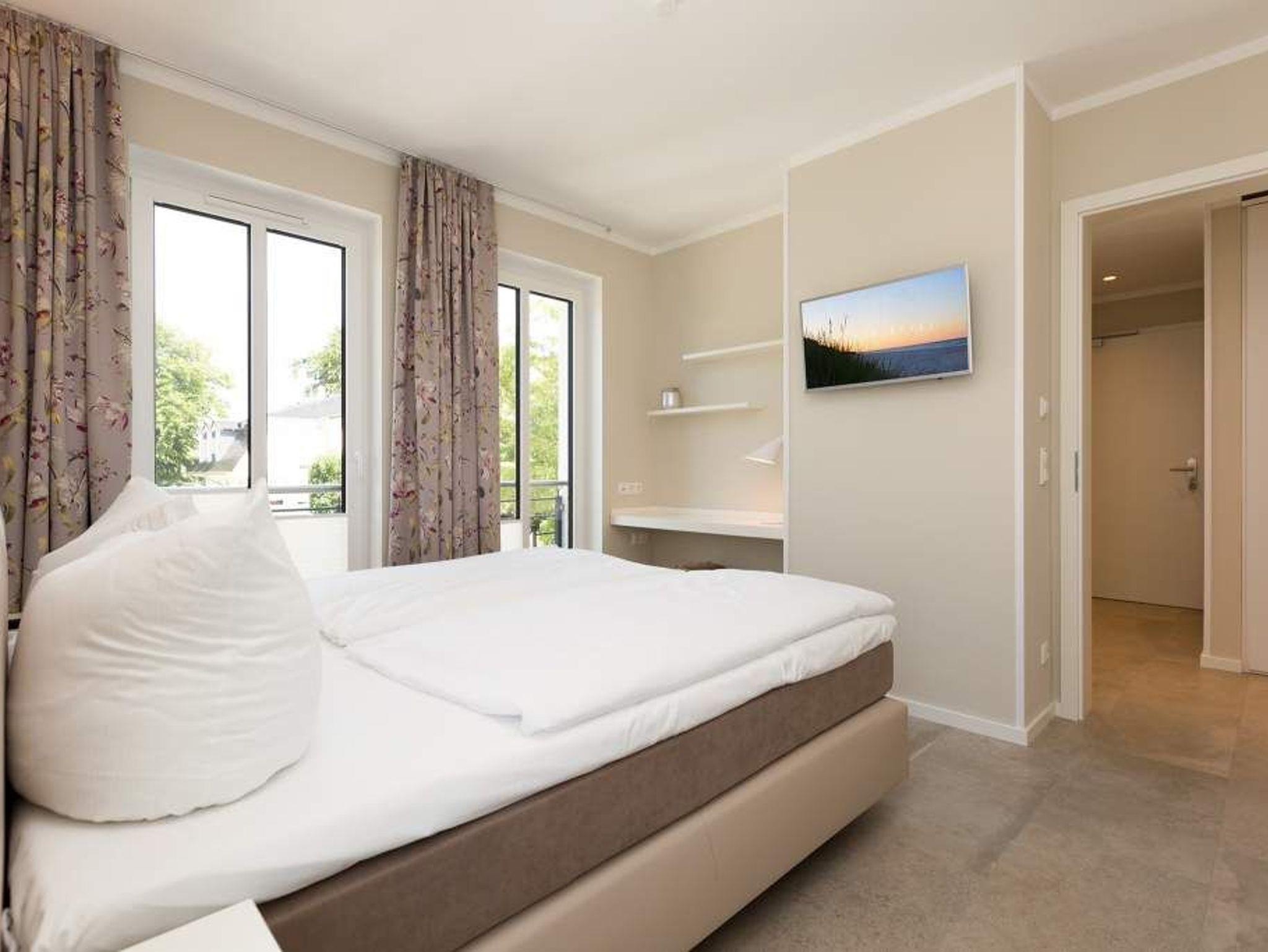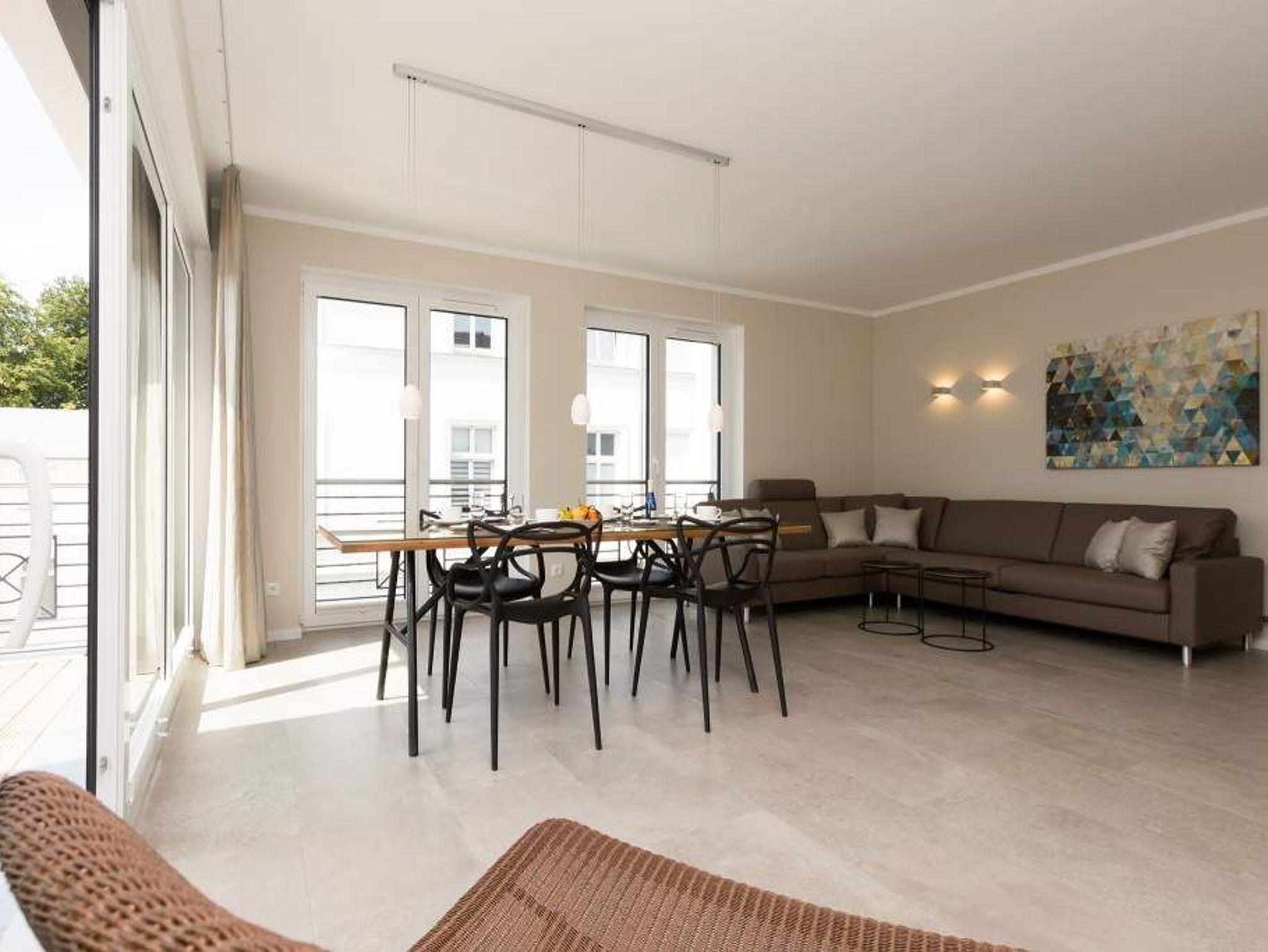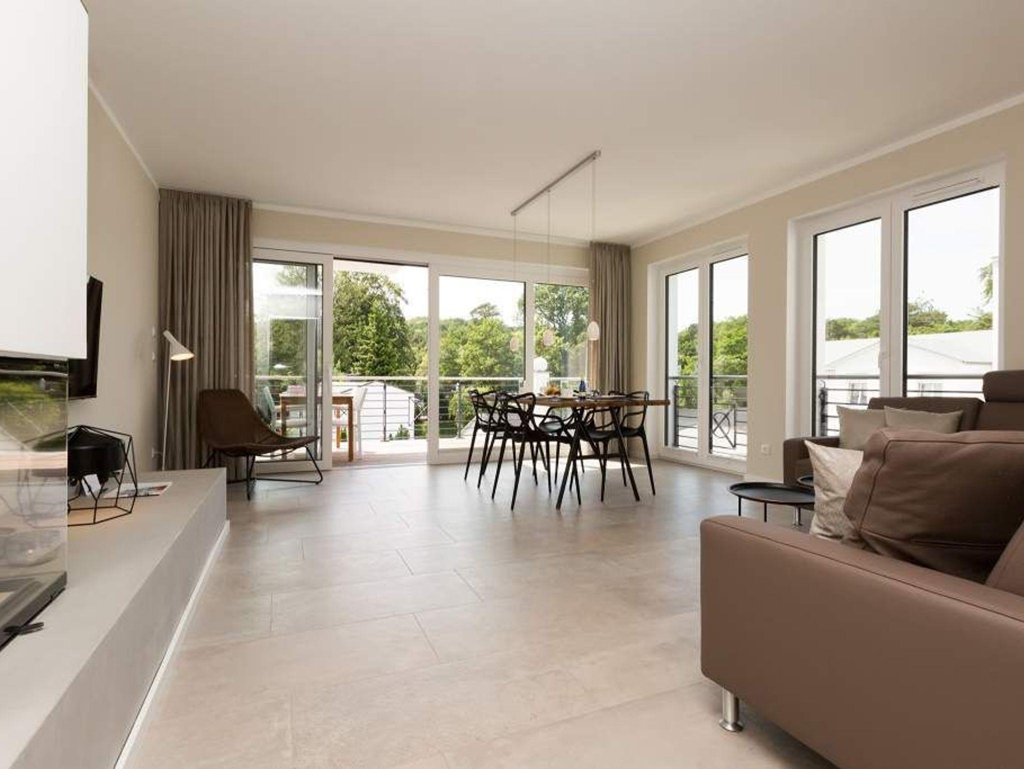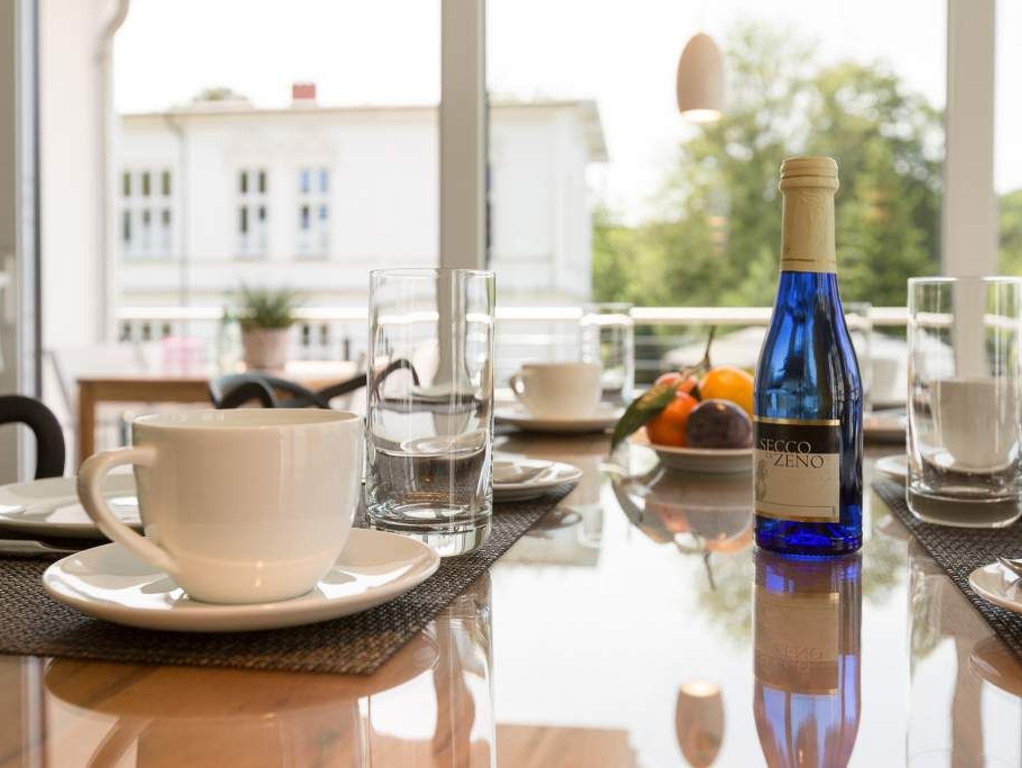 Vogelzwitschern und das sanfte Rauschen der Ostsee: Umgeben von wunderschönen, alten Bäumen atmet die 2017 fertig gestellte Villa Strandgrün das Flair der sie umgebenden Bädervillen. Mit seinen Balkonen und Erkern, die die Fassade untergliedern und auflockern, passt sich das strandnahe (100 Meter) Urlaubsdomizil angenehm in das Bild der aufwendig sanierten Villen um sie herum ein und wirkt selbst wie eine Weiterführung der einst mondänen Architektur des 19. Jahrhunderts. Das stilvolle Äußere setzt sich im exklusiven und eleganten Wohndesign im Inneren fort. Jede Ferienwohnung verfügt über eine Sonnenterrasse oder mehrere Balkone. Besondere Highlights eines jeden Appartements sind der Kamin, eine Sauna und je zwei Bäder bzw. ein zusätzliches Gäste WC. Die großzügigen 3- und 4-Raum-Suiten wurden mit allem Komfort konzipiert und ausgestattet. Vom ASA-Geschirr bis zu den hochwertigen Designmöbeln steht das Wohlfühlen an erster Stelle. In der Tiefgarage gibt es für jedes Appartement einen Stellplatz. Außerdem steht für jede Wohnung ein Briefkasten am Haus zur Verfügung.
