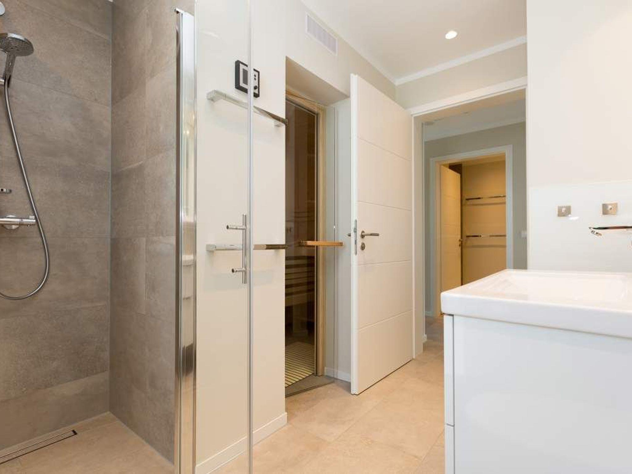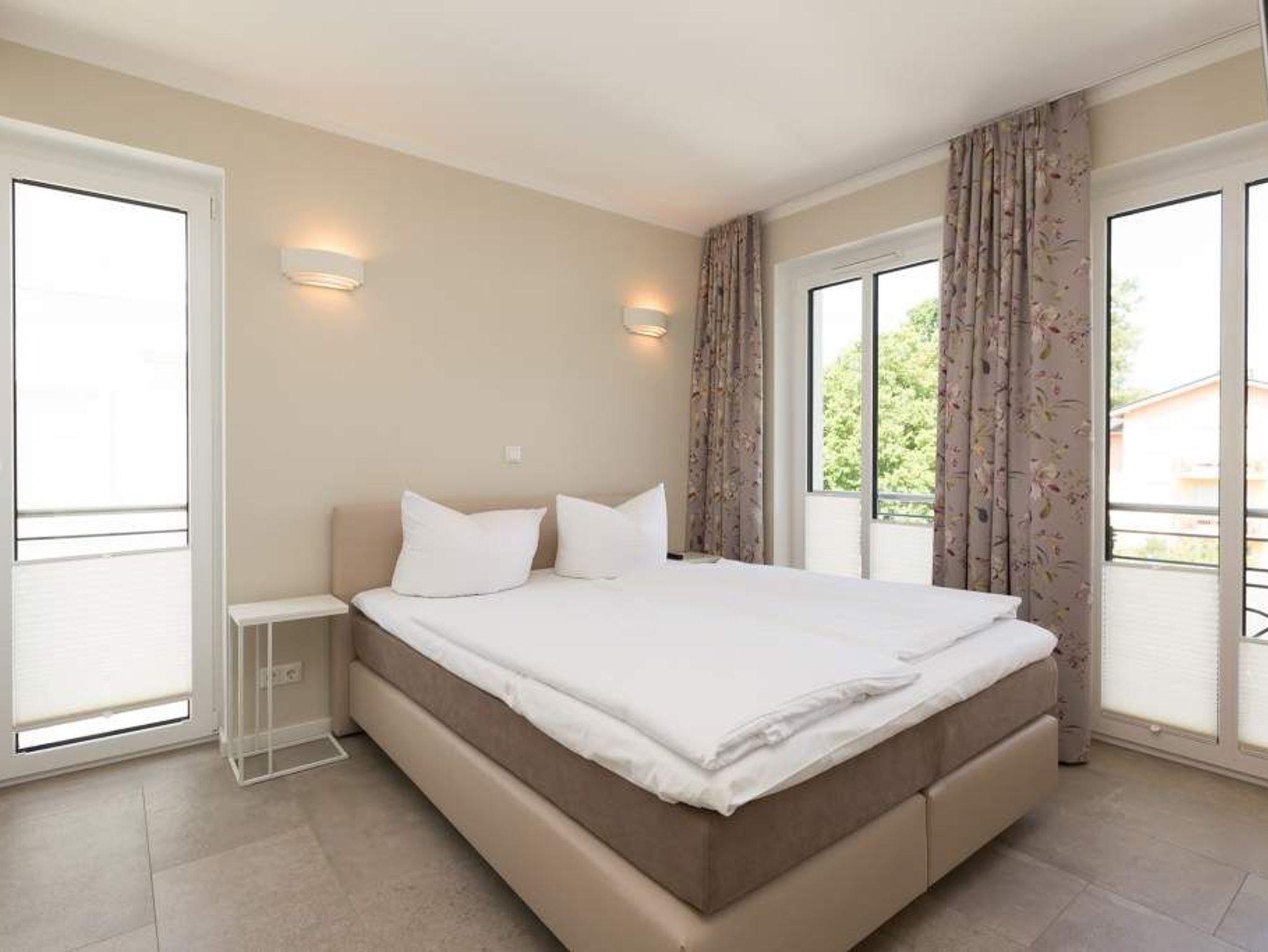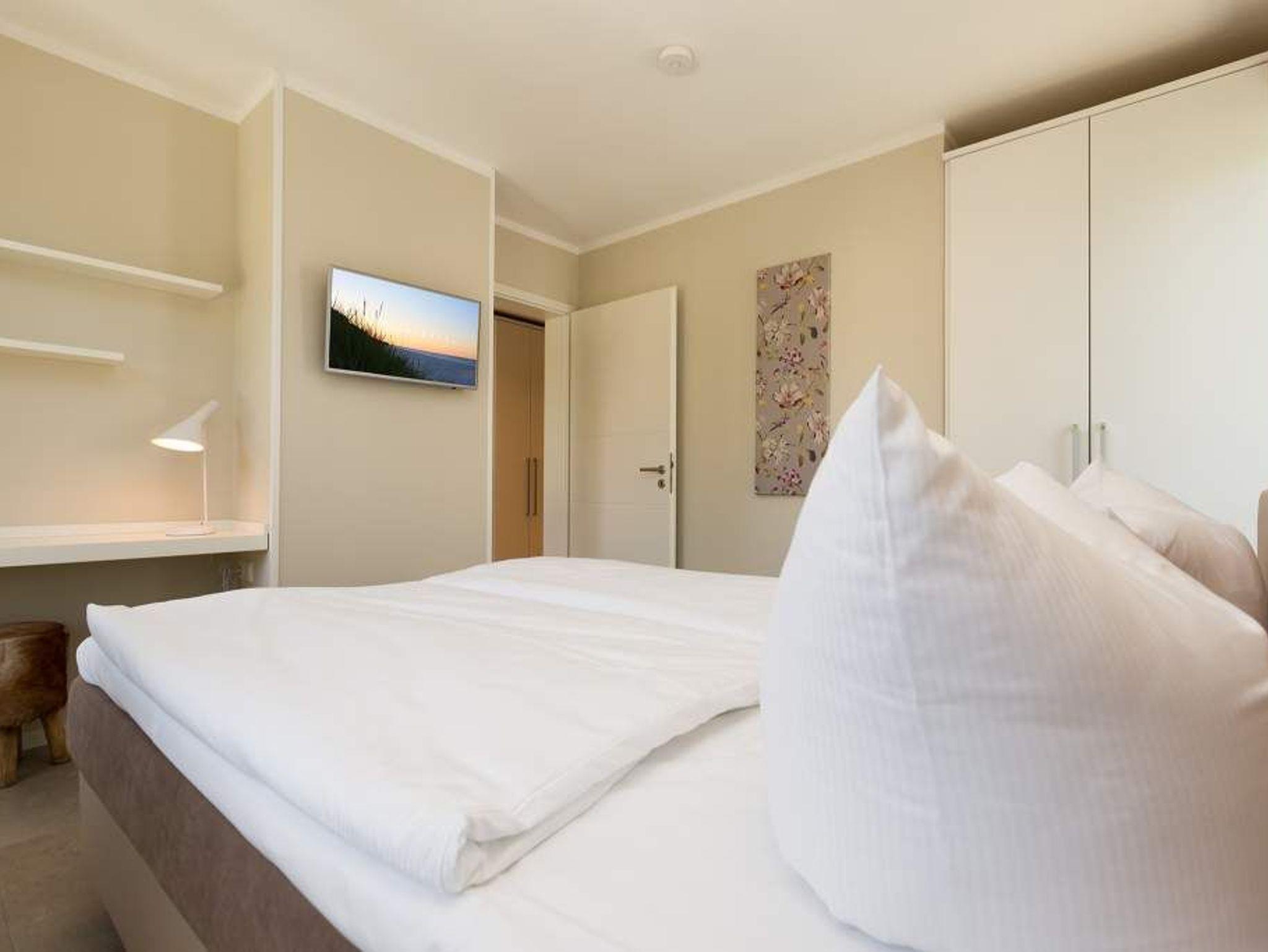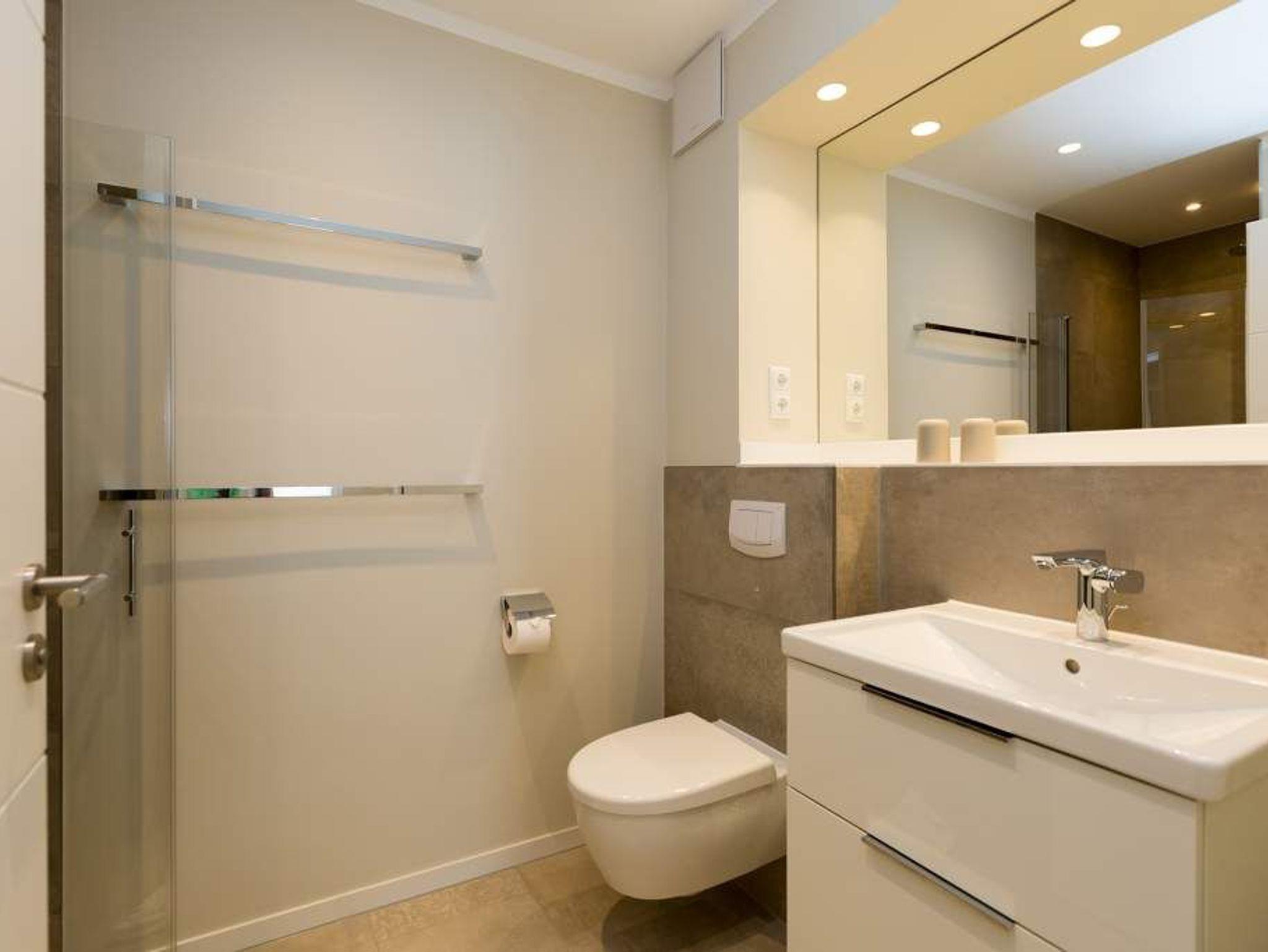 Die Sonne taucht den großen Balkon mit dem Bangkirai-Holzboden in warmes Wohlfühllicht, durchflutet das weiträumige Wohnzimmer und sorgt in den drei Räumen für eine luftig leichte Urlaubsatmosphäre. Viel Raum für vier Personen und ein Kleinkind (bis 2 Jahre im Kinderreisebett) bieten die 87 Quadratmeter der Wohnung Nummer 7 im zweiten Obergeschoss der Villa Strandgrün. Helle Sandfarben lassen den feinen Strand schon erahnen. Gerade einmal 100 Meter entfernt wirft die Ostsee ihre Wellen auf den feinen Sand. Auf der gemütlichen Sofalandschaft lässt es sich herrlich entspannen ? egal ob beim Blick auf den großen Flat-TV oder die urigen Flammen im Kamin. Stilvolle Designmöbel geben der Inneneinrichtung eine stylische Note. Ein schöner großer Echtholztisch wird komplettiert durch vier moderne Stühle. Vom Wohnzimmer gelangt man durch eine Schiebetür zum großen und sonnigen Südwestbalkon. Dieser ist mit einem Teakholztisch und vier Designerstühlen sowie einer Sonnenliege ausgestattet und bietet einen schönen Ausblick. Auf dem zweitem Balkon zum Nordosten kann man das Meeresrauschen vernehmen. Die hochwertige und moderne Küche ist voll ausgestattet. Zwei Schlafzimmer mit Doppelboxspringbetten (1 x 2,00/1,80m und 1 x 2,00/1,60) und jeweils mit eigenem Flat-TV sorgen für ruhige Nächte und angenehme Träume. Zum E-Mails checken oder zum entspannten Lesen empfiehlt sich die Schreibtischnische in einem der Schlafzimmer. Auch der Traum von der Rundumwohlfühlauszeit wird hier wahr. Denn eines der beiden Bäder besitzt eine finnische Sauna. Ansonsten verfügen sie über je eine Dusche mit Rainshower Duschsystem, Waschtisch mit Unterschrank, WC und genügend Ablagen mit großen Spiegeln. Außerdem steht Ihnen ein Waschtrockner (Kombigerät) zur Verfügung. Für das Appartement sind in der Tiefgarage zwei Stellplätze vorgesehen. In einem zur Wohnung gehörenden separaten Abstellraum können Sie Fahrräder unterstellen. Für den Tag am Meer steht Ihnen von Mai bis Ende September (je nach Witterung) ein Strandkorb kostenlos zur Verfügung. Urlauben in der Villa Strandgrün beinhaltet auch die Ausstattung mit Handtüchern und den Bezug der Betten. Das WLAN kann kostenfrei genutzt werden.
