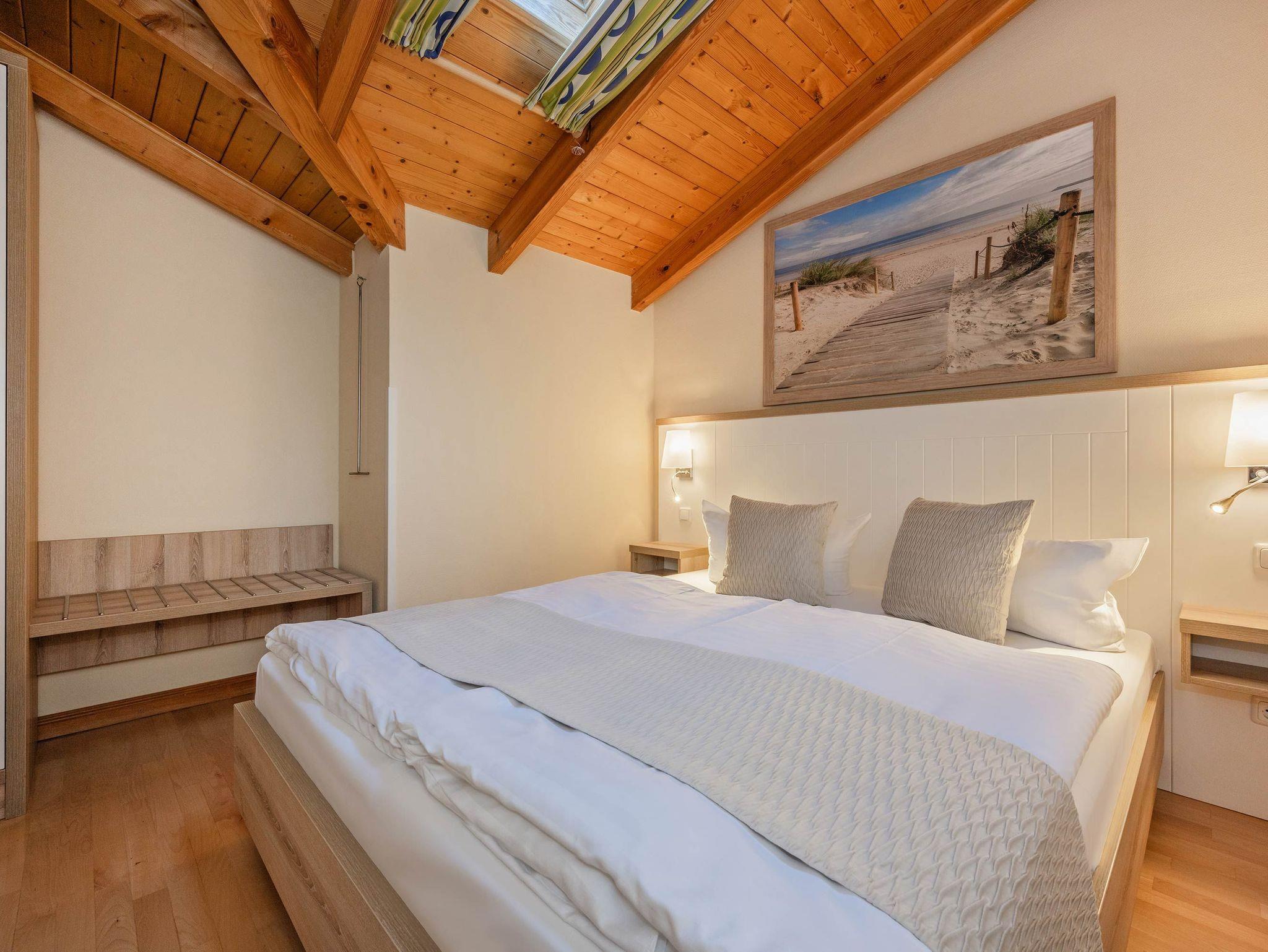Der helle Wohnbereich bietet eine gemütliche Sitzecke mit Schlafcouch (160 × 200 cm), Elektrokamin und Flachbild-TV. Das separate Schlafzimmer ist mit einem Doppelbett (160 × 200 cm) und ausreichend Stauraum ausgestattet. Die sichtbare Holzbalkenkonstruktion und die geöffnete Dachdecke verleihen den Räumen eine offene, besondere Atmosphäre. Vom Wohnzimmer aus haben Sie Zugang zur blick- und windgeschützte Dachterrasse, die bis in den Herbst hinein zu entspannten Stunden im Freien einlädt.