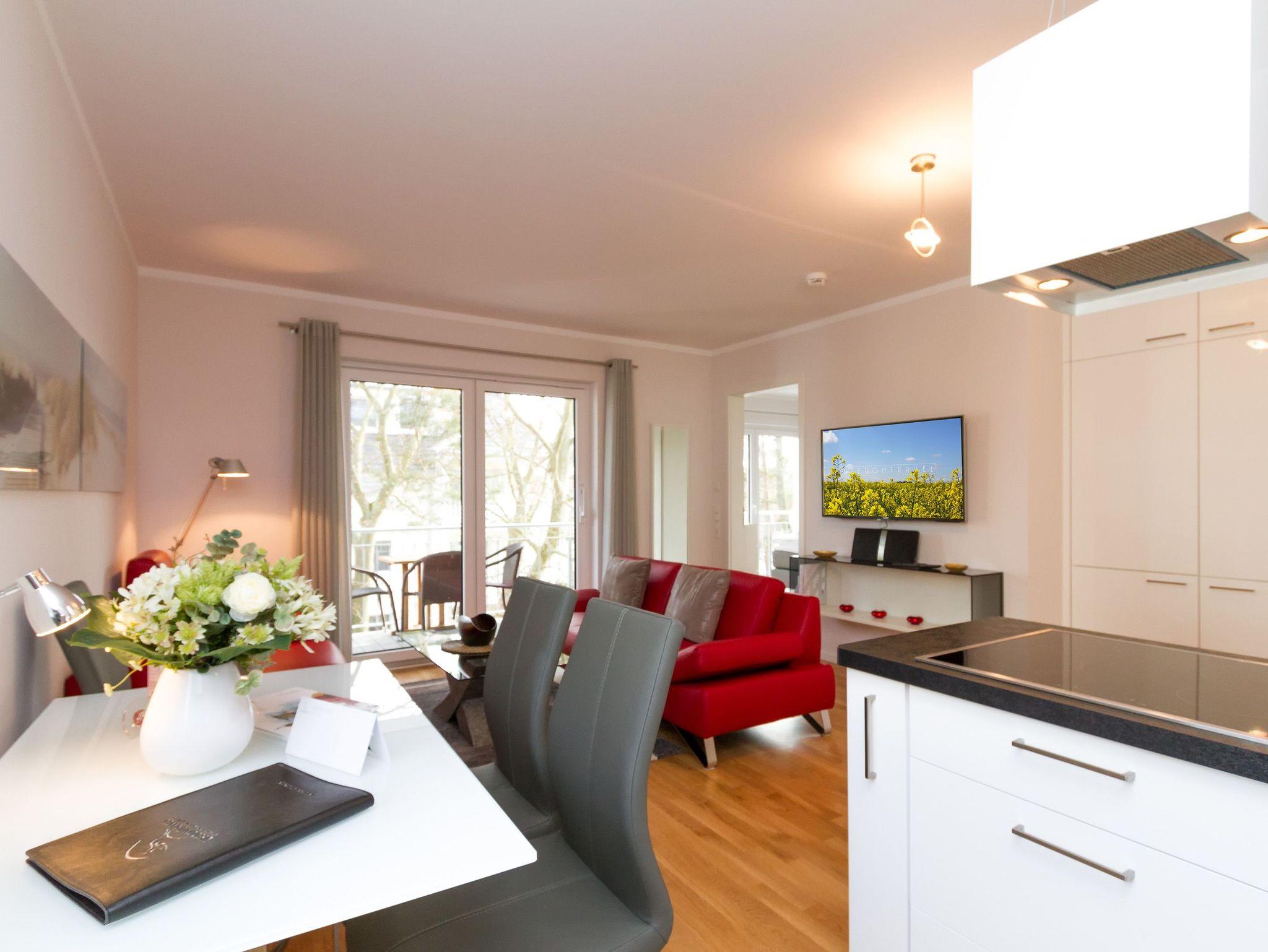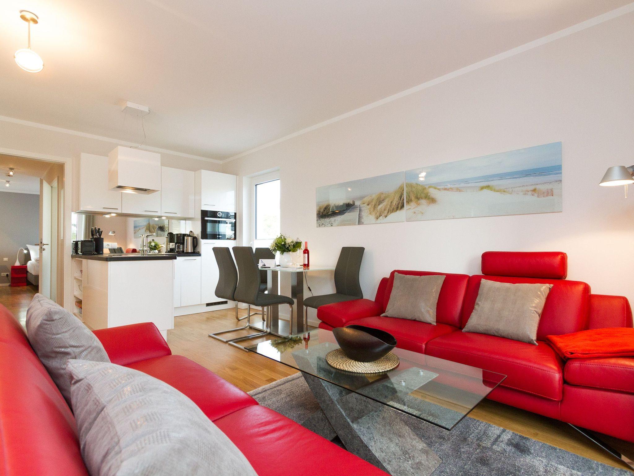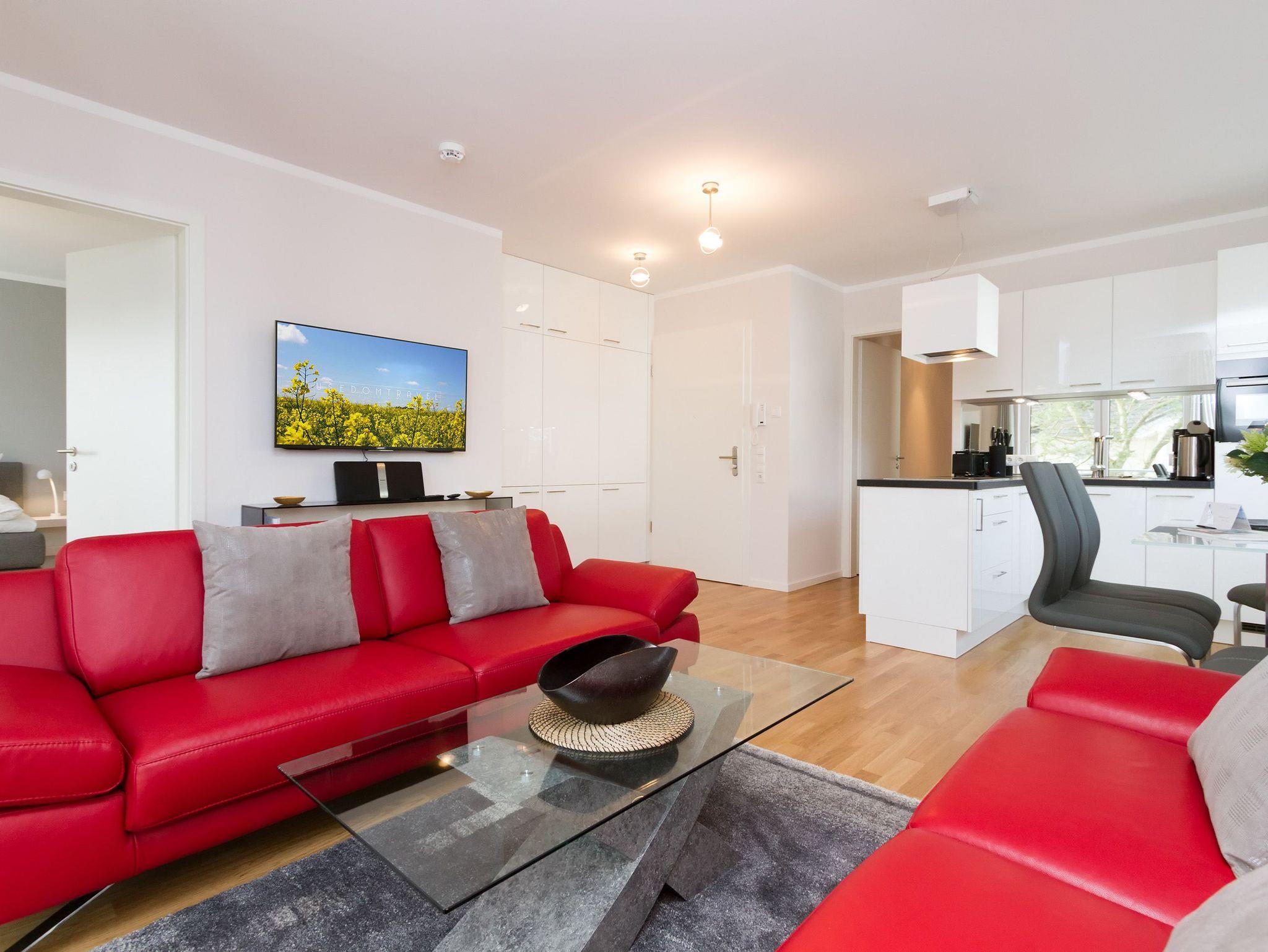 Klare Linie und kräftige Farben, ausgesuchte Materialien und ein modernes Design überzeugen im Appartement 18. Eintreten und Wohlfühlen ist hier die Devise, denn der Wohlfühlfaktor kommt hier nicht zu kurz! Die 3-Raum-Ferienwohnung (62 qm) für 4 Personen inklusive Kleinkind befindet sich im 2. Obergeschoss der Dünenresidenz. Schon beim Eintreten offeriert sich der helle Wohnbereich, ausgestattet mit zwei modernen Ledersofas und Flat-TV. Die angrenzende, offene Küche mit Essplatz fügt sich harmonisch ein und ist natürlich komplett ausgestattet. Zwei Schlafzimmer mit jeweils eigenem Bad bieten einen idealen Rückzugsort. Das erste Schlafzimmer verfügt über ein komfortables Doppelboxspringbett (1,80m x 2,00m), ein kleines Duschbad und Zugang zum Balkon. Das zweite Schlafzimmer wartet mit einem bequemen Doppelboxspringbett (1,60m x 2,00m) und Flat-TV auf, hier ist eine eigene Sauna im Duschbad integriert. Die Usedomer Sonne genießen Sie schon beim Frühstück auf dem Ostbalkon, ausgestattet mit Gartenmöbeln. Hier kann man bei ein bisschen Meerblick wunderbar Relaxen. Für Ihren Komfort sind die Betten bei der Anreise bezogen und Handtücher liegen bereit. Ein Pkw-Stellplatz steht in der Tiefgarage zur Verfügung (max. Einfahrtshöhe 1,85 m). Das Wlan-Netz kann kostenlos genutzt werden.