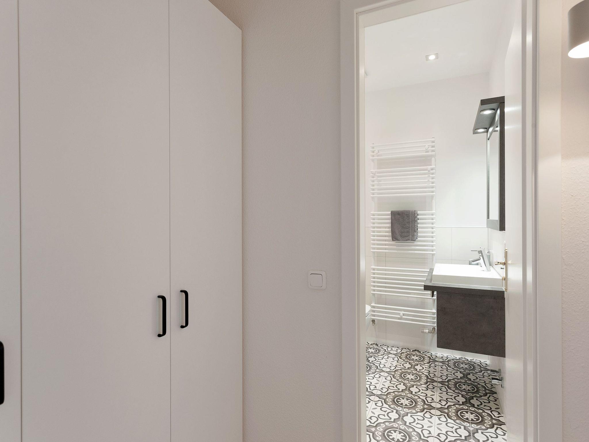 Unser Appartement 12 im 2. Obergeschoss wurde im Winter 2024 - 25 renoviert und erstrahlt nun in neuem Glanz. Mit ca. 38 qm bietet das Appartement alles, was es für einen erholsamen Aufenthalt mit bis zu 2 Personen benötigt. Die neue, moderne Single-Küchenzeile ist vollausgestattet mit einem Cerankochfeld, Kühlschrank mit Gefrierfach, Backofen mit integrierter Mikrowelle, Spülmaschine sowie Kaffeemaschine, Wasserkocher und Toaster.