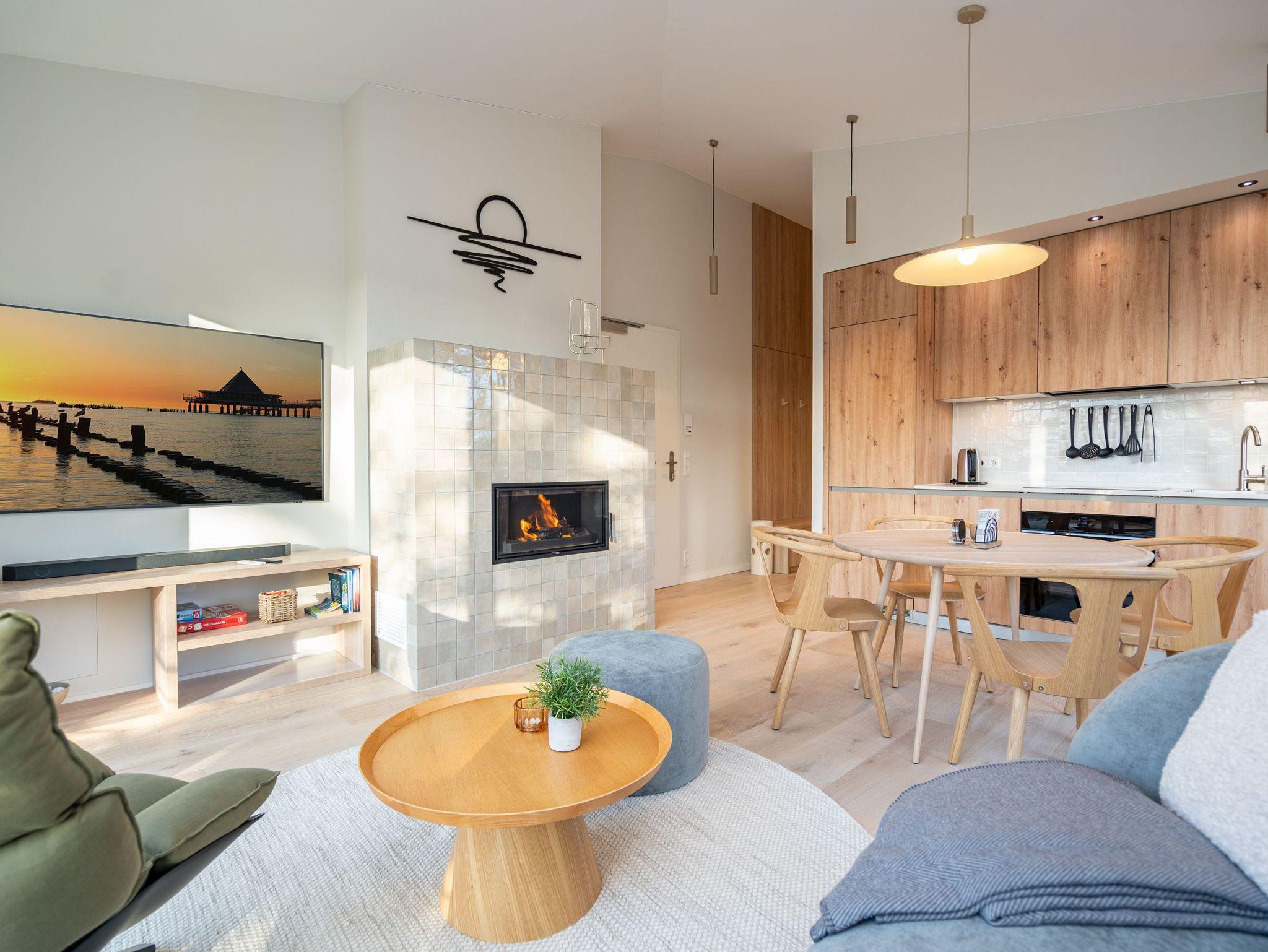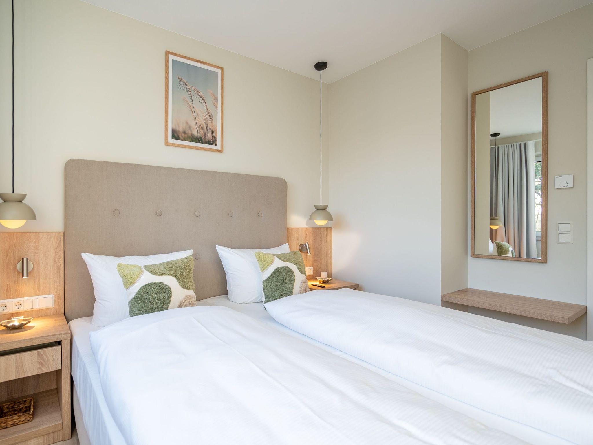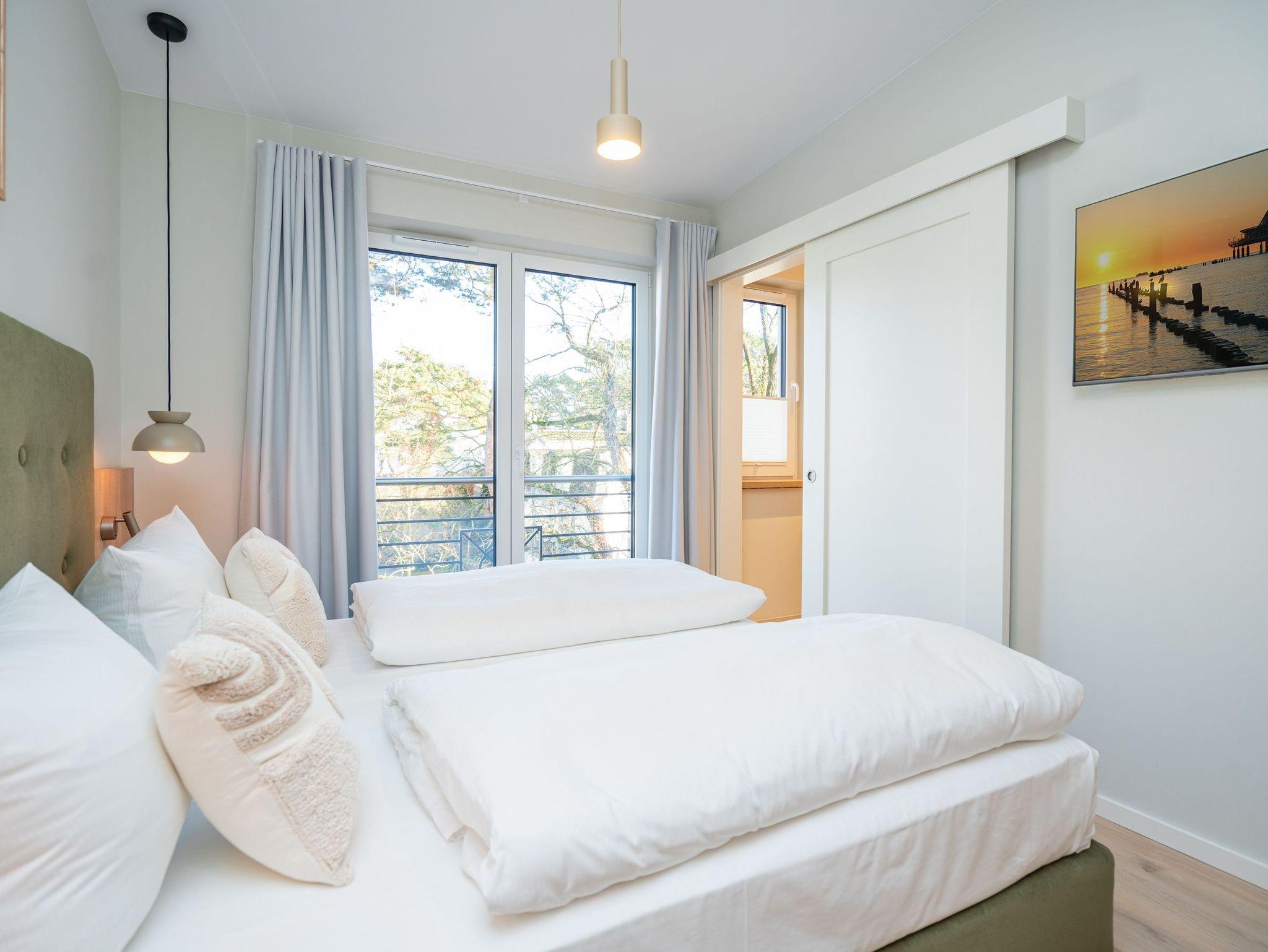 Willkommen im Quartier Maxim ? App. 9, einem stilvollen 3-Raum-Appartement in der 2. Etage, das auf 68 qm Platz für bis zu 4 Personen bietet. Hier erwartet Sie eine perfekte Kombination aus Komfort, Eleganz und durchdachter Ausstattung für unvergessliche Urlaubstage. Der lichtdurchflutete Wohnbereich lädt mit einer gemütlichen Sitzgruppe, einem Kaminofen und einem beeindruckenden 65-Zoll-Flat-TV zu entspannten Stunden ein. Genießen Sie die frische Luft und den Ausblick auf dem Süd-West-Balkon (ca. 7 qm), der mit komfortablen Gartenmöbeln ausgestattet ist ? der perfekte Ort für ein Frühstück oder ein Glas Wein zum Sonnenuntergang. Die offene Küchenzeile lässt keine Wünsche offen. Sie ist mit einem 4-Platten-Cerankochfeld, einem Backofen mit Mikrowellenfunktion, einem geräumigen Kühlschrank sowie einem Gefrierschrank mit drei Fächern ausgestattet. Ideal, um auch im Urlaub kulinarische Highlights zu zaubern! Erholsame Nächte versprechen die beiden stilvollen Schlafzimmer, die jeweils mit luxuriösen Boxspring-Doppelbetten (1,80 m x 2,00 m), Kleiderschränken und Flat-TVs ausgestattet sind. Ein besonderes Highlight: Eines der Schlafzimmer verfügt über direkten Zugang zum Tageslicht-Masterbad, das mit Dusche, Waschtisch und WC besticht. Ein zweites, innenliegendes Bad bietet zusätzlichen Komfort und punktet mit einer Sauna, Dusche und WC ? ein wahres Wellness-Erlebnis. Kostenfreies WLAN sorgt dafür, dass Sie auch im Urlaub jederzeit vernetzt bleiben können. In den Sommermonaten genießen Sie zusätzlich die kostenfreie Nutzung eines Strandkorbs direkt am Strand ? perfekte Voraussetzungen für entspannte Tage an der Küste. Ein PKW-Stellplatz in der Tiefgarage steht ebenfalls zur Verfügung, mit einer kostenpflichtigen Lademöglichkeit für E-Autos. Freuen Sie sich auf ein Urlaubserlebnis, das Komfort, Entspannung und moderne Ausstattung harmonisch vereint ? Quartier Maxim ? App. 9 erwartet Sie!