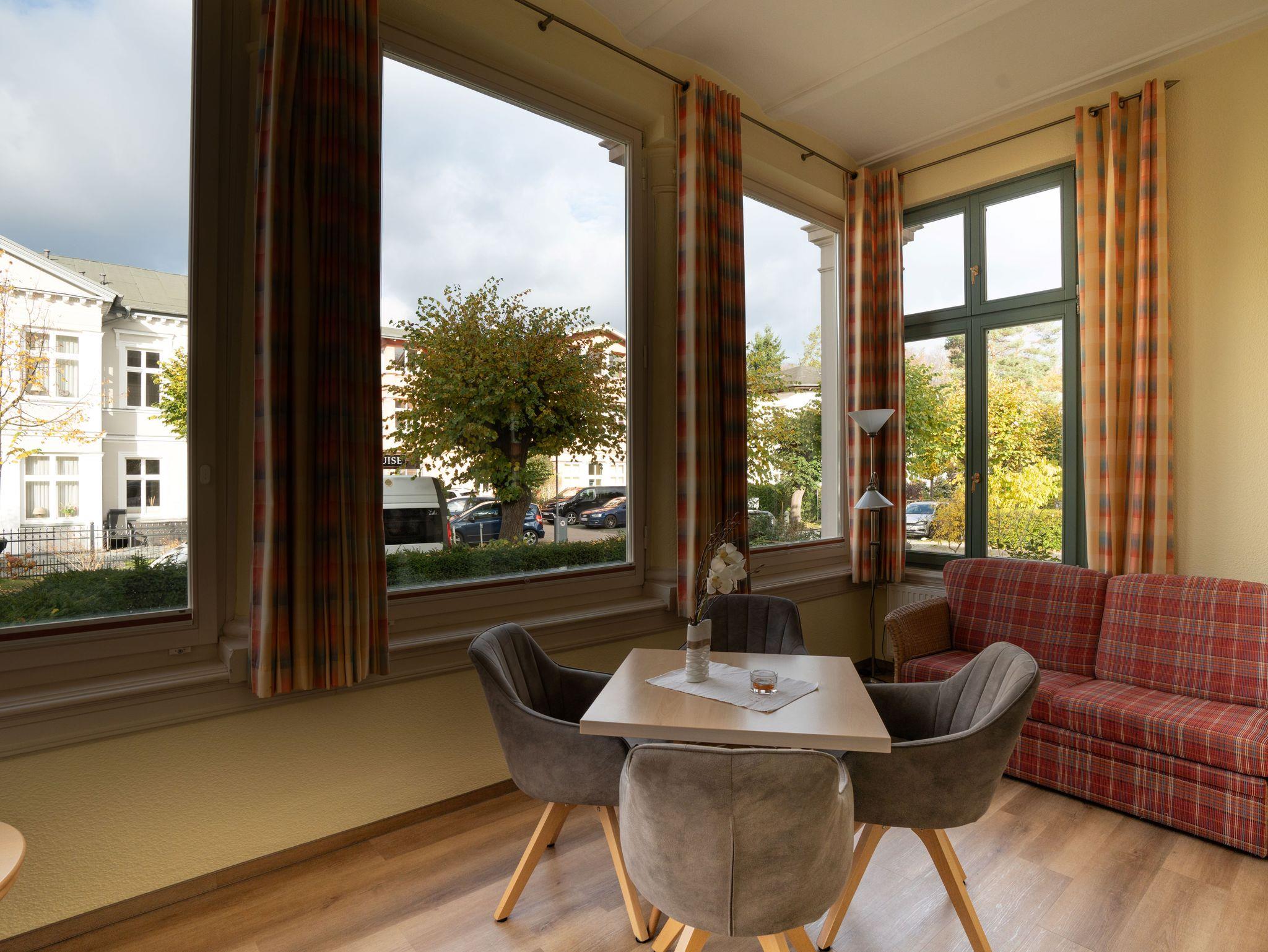 Auf der Terrasse vor dem Haus (Gemeinschaftsnutzung) haben Sie einen herrlichen Blick auf die alten Villen im Stil der Bäderarchitektur.