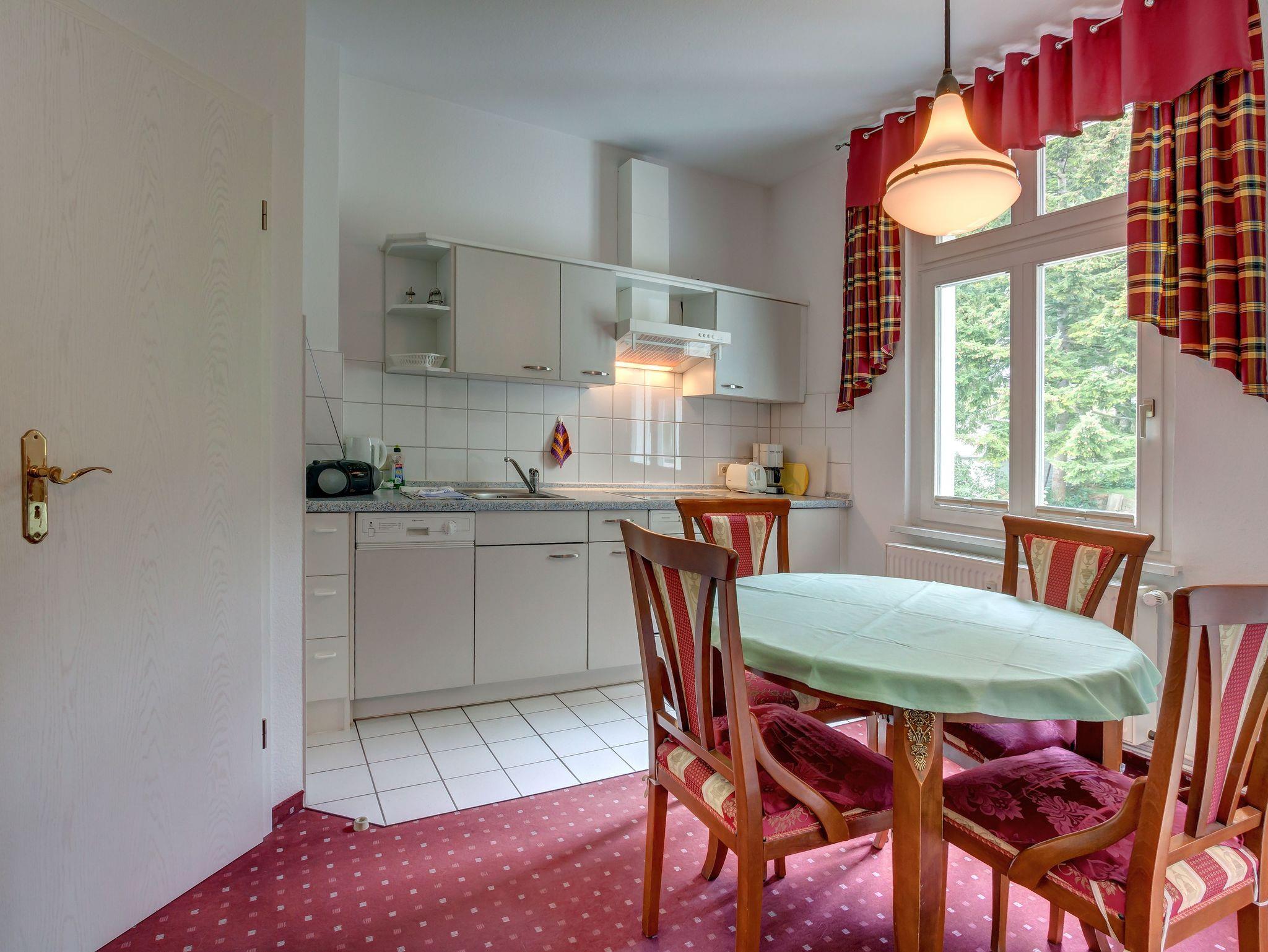 Sie ist mit einer komplett eingerichteten Küchenzeile ausgestattet. Sie finden hier u.a. Herd, Kühlschrank und Kaffeemaschine sowie Wasserkocher.