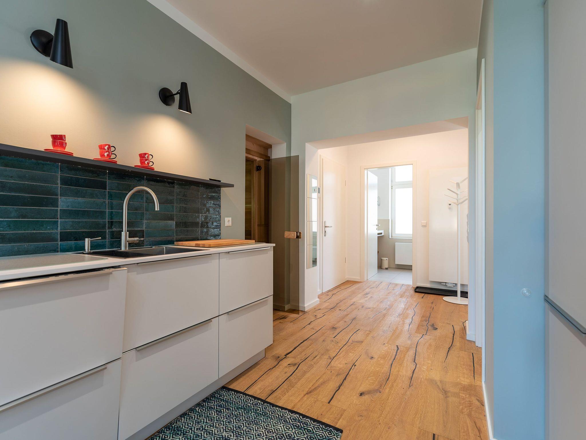 Die Wohnung zeichnet sich durch ihr helles, offenes Design und maritime Blautöne aus, die sofort ein Urlaubsgefühl wecken. Mit zwei Schlafzimmern, die jeweils mit einem Doppel-Boxspringbett ausgestattet sind, bietet sie Platz für bis zu vier Erwachsene. Das Wohnzimmer mit einer voll ausgestatteten Küchenzeile, inklusive Nesspressomaschine und meeresblauen Fliesen, erinnert an die unmittelbare Nähe zur Ostsee. Genießen Sie auf der Terrasse die frische Ostseebrise bei einer Tasse Kaffee.