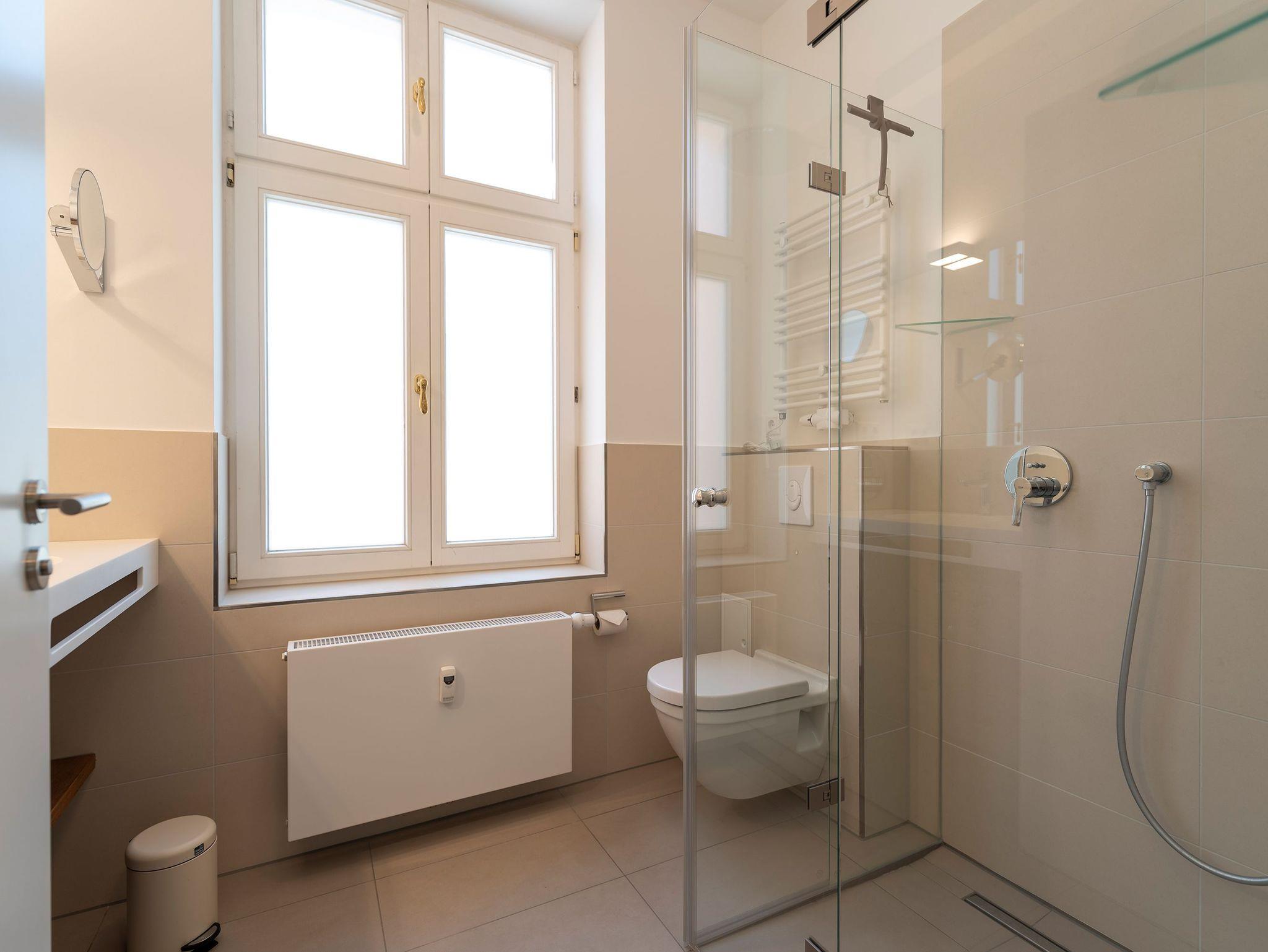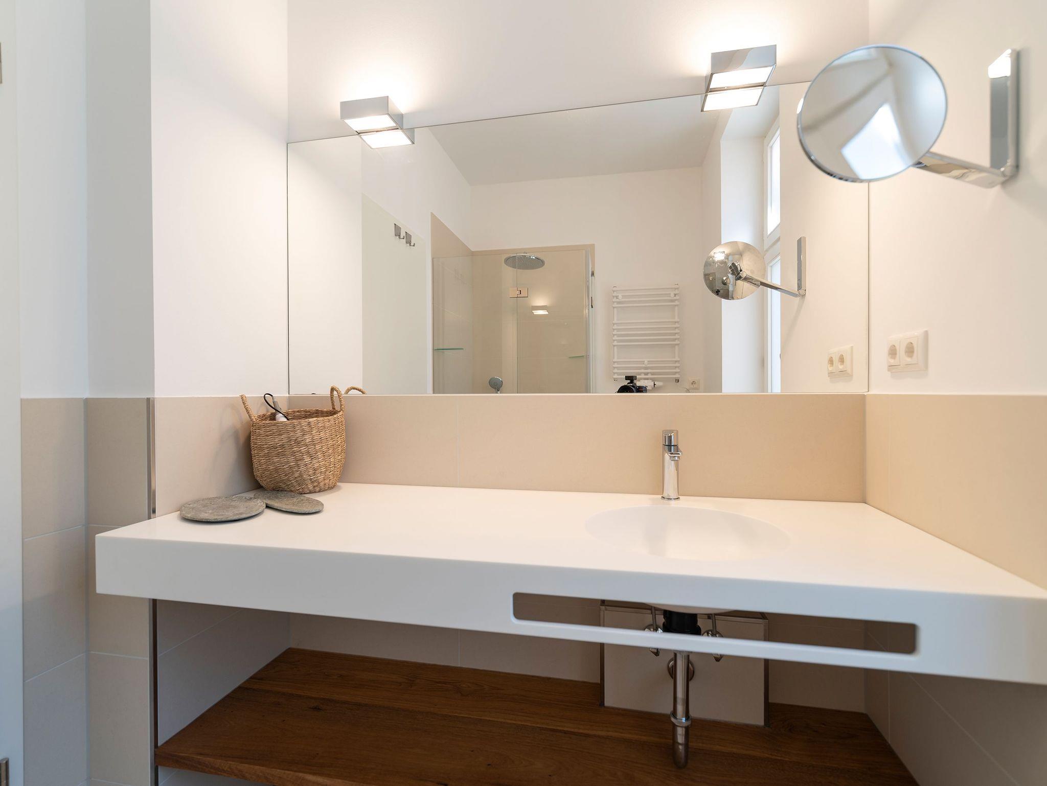 Ein Badezimmer in sanften Sandtönen mit einer geräumigen Regen-Dusche und einer Infrarotkabine für entspannende Momente sorgt für zusätzlichen Komfort. Moderne Annehmlichkeiten wie Bluetooth-Boxen, WLAN und ein privater Parkplatz auf dem Grundstück runden das Angebot ab.
