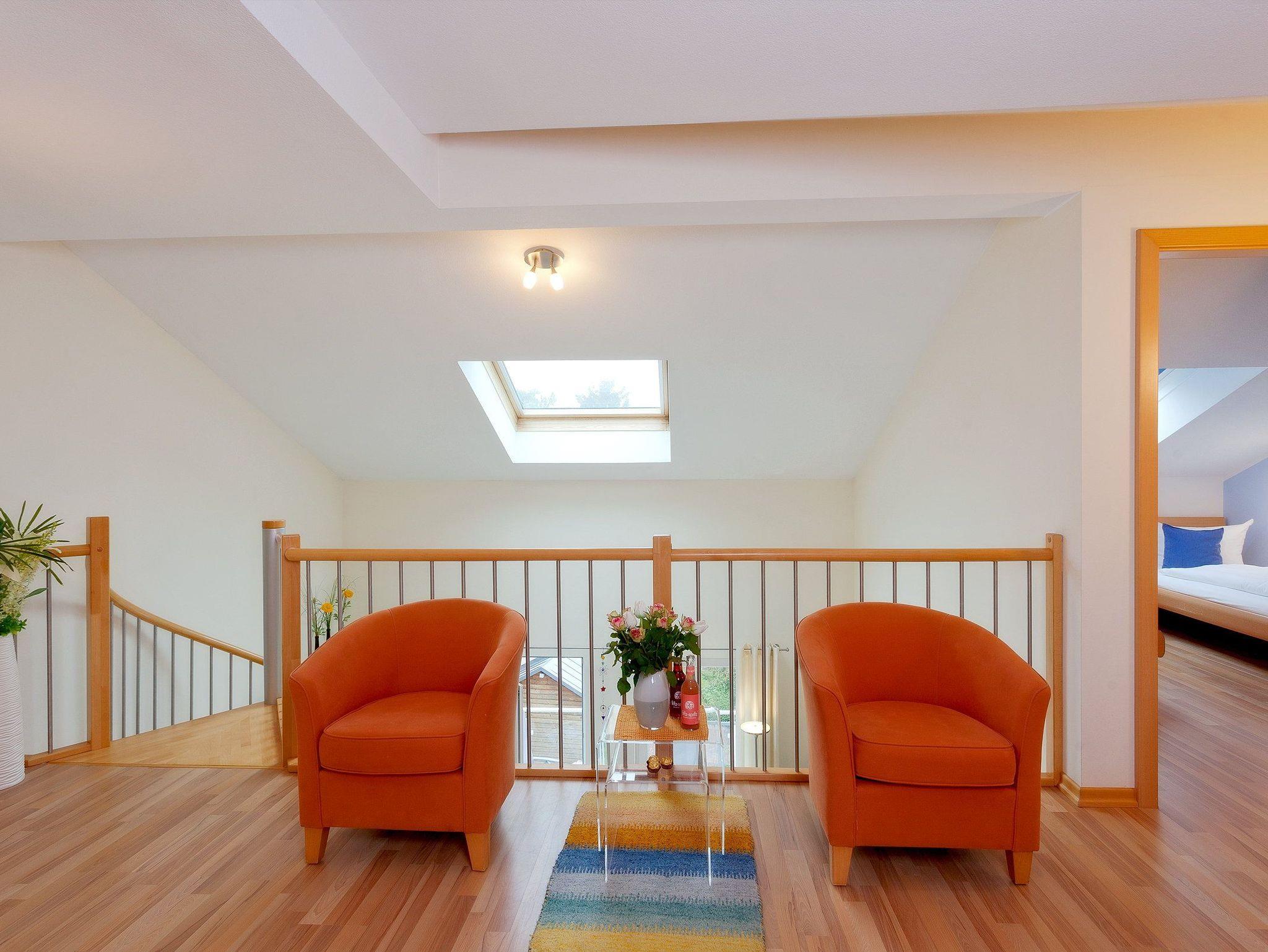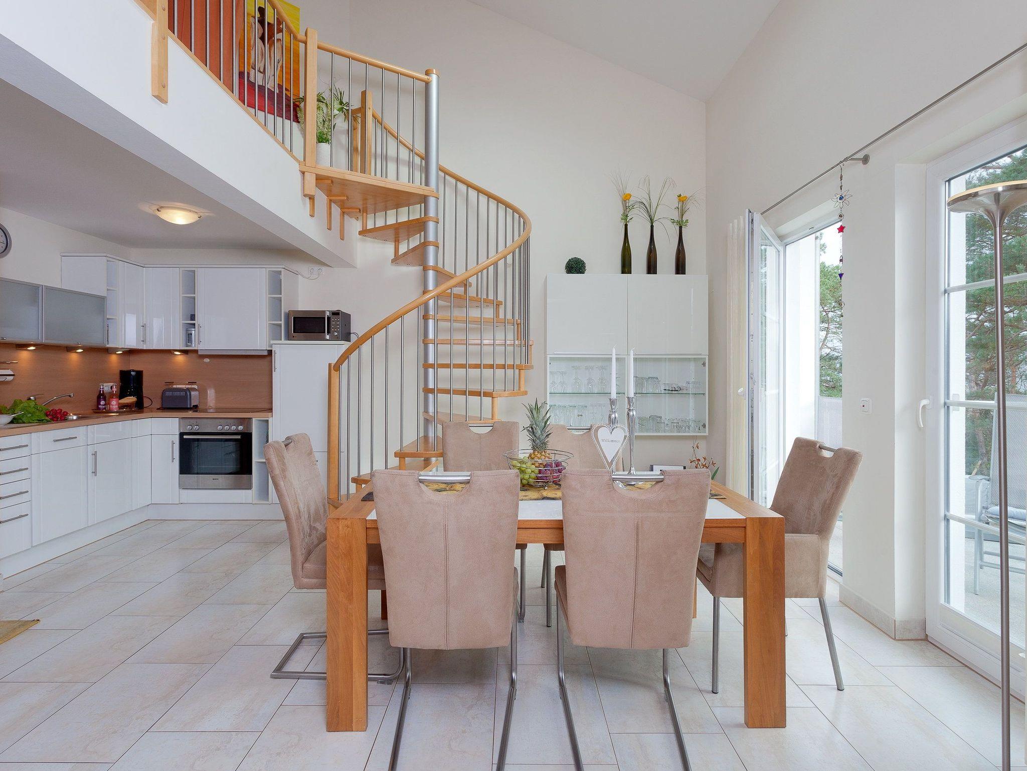 Die Fußböden des Appartements sind aus Naturstein und versprühen Dank Fußbodenheizung ein wohliges Gefühl. Vom Wohnbereich können Sie auf den Südostbalkon heraustreten und einen Hauch von Ostseeblick genießen.[nbsp] Über eine Wendeltreppe gelangen Sie in die obere Etage der Wohnung: von der Galerie haben Sie Zugang zu den beiden weiteren Schlafzimmern und dem zweiten Badezimmer. In dem zweiten Schlafzimmer des Appartements erwartet Sie ein komfortables Doppelbett (160x200 cm/ zwei getrennte Matratzen), ein Kinderbettchen (140x75 cm) und ein Flat TV, während in dem dritten Schlafzimmer zwei Einzelbetten (je 90x200 cm) und ein Flat TV zur erholsamen Nachtruhe einladen. Für die 5. und 6. Person berechnen wir einen Aufbettungszuschlag pro Tag - abhängig von der jeweiligen Saisonzeit.