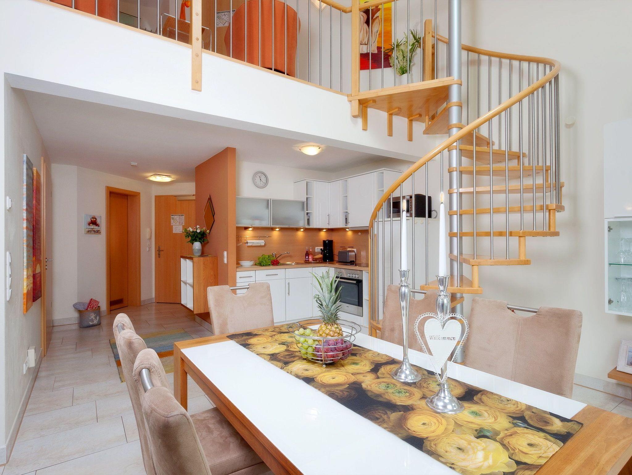 Im 3. Obergeschoss erwartet Sie auf zwei Etagen erstklassiger Urlaubskomfort für bis zu sechs Personen. Im unteren Geschoss der Wohnung befindet sich der kombinierte Wohn- und Essbereich mit einer vollausgestatteten Einbauküche inkl. Ceranfeld, Backofen, Kühlschrank mit Gefrierfach, Geschirrspüler, Mikrowelle, Wasserkocher, Toaster und Kaffeemaschine. An dem einladenden Esstisch können Sie in geselliger Runde die zubereiteten Mahlzeiten genießen. Damit auch unsere kleineren Gäste im wahrsten Sinne des Wortes auf ihren Genuss kommen, gibt es einen Kindertisch mit zwei Stühlen. Zusätzlich befindet sich auf dieser Etage ein Schlafzimmer mit Doppelbett (180x200 cm/zwei getrennte Matratzen) sowie ein Badezimmer mit Dusche, WC und einem Haartrockner.