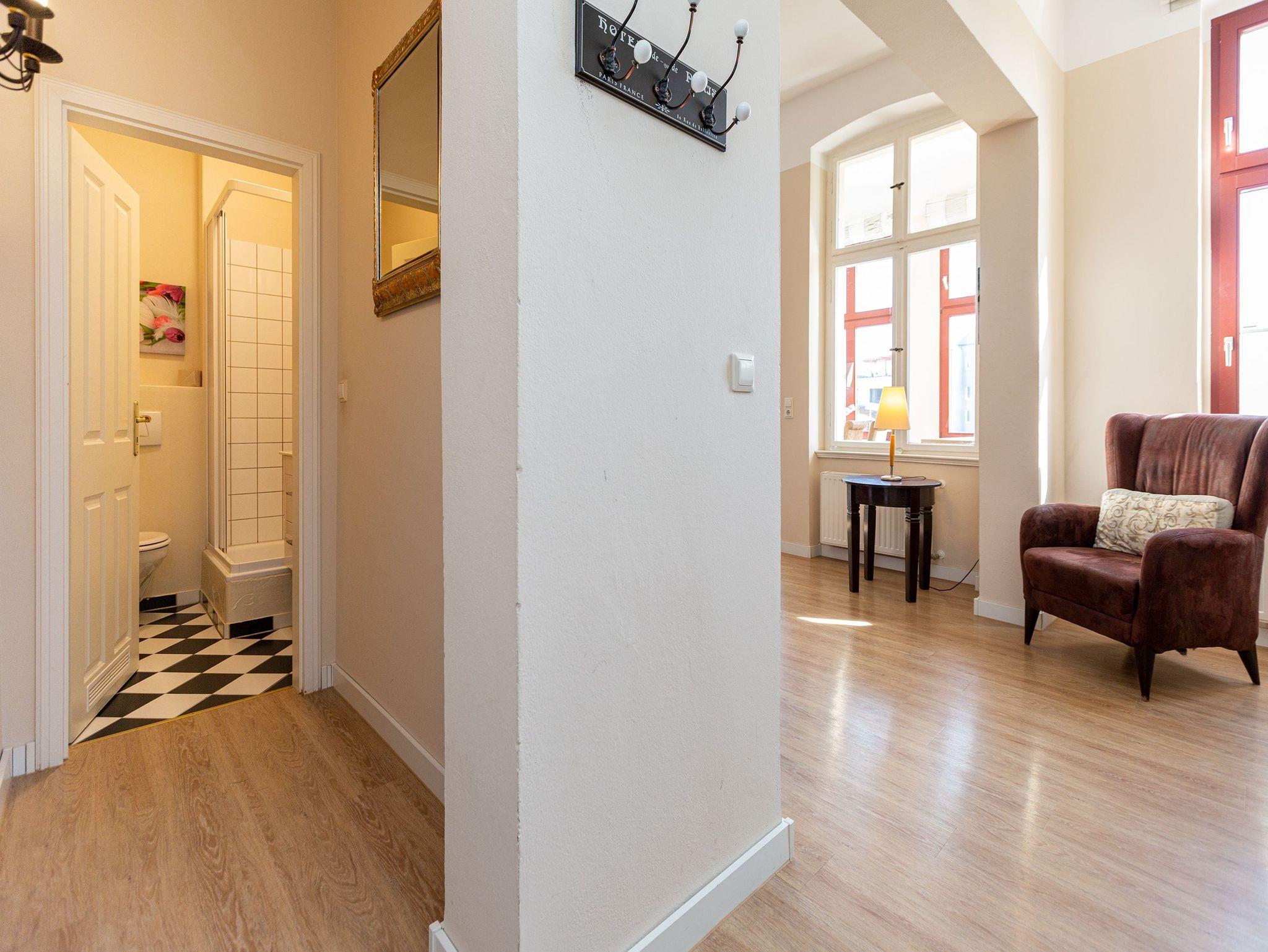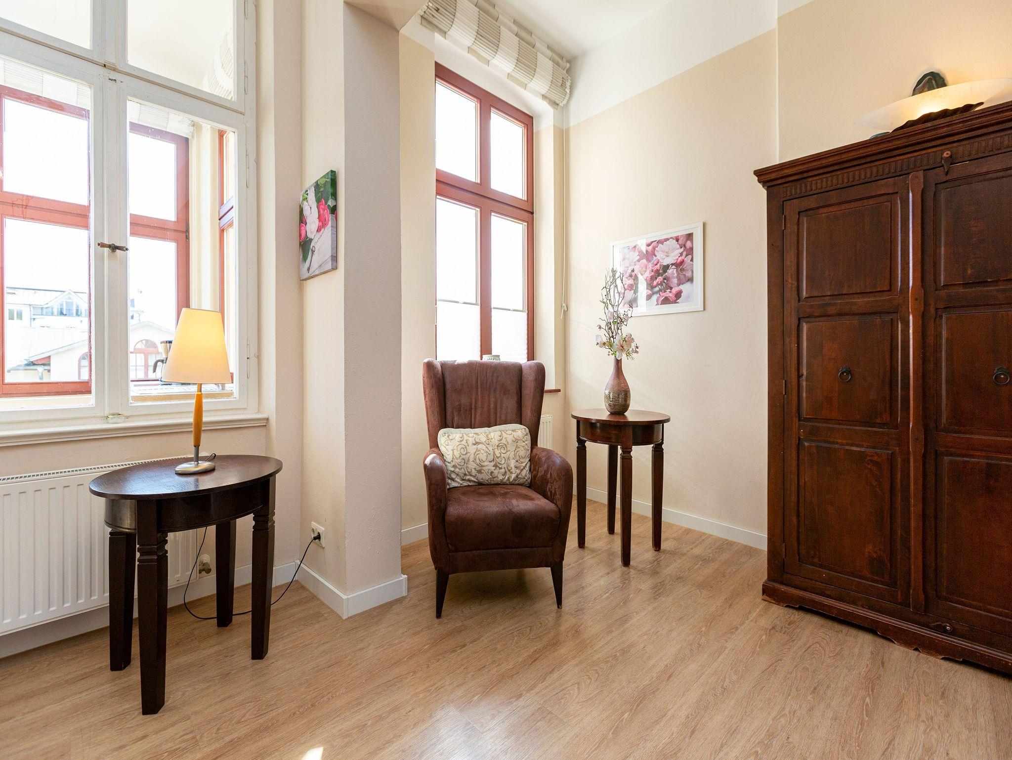 Die 3-Raum-Ferienwohnung im 1. Obergeschoss bietet auf 65 qm Platz für bis zu 4 Personen. Das Wohnzimmer ist mit einer gemütlichen Sitzgruppe und einem Fernseher ausgestattet. Angrenzend befindet sich ein Wintergarten mit Essplatz und integrierter Küchenzeile. Die Wohnung verfügt über zwei Schlafzimmer. Schlafen Sie im Doppelbett (sehr eng) oder in einem der Einzelbetten im zweiten Schlafraum. Das Badezimmer ist mit Dusche, Waschtisch und WC ausgestattet. Für Ihren Komfort sind die Betten bei Ihrer Anreise bereits bezogen und Handtücher liegen als Erstausstattung für Sie bereit. WLAN-Netz ist kostenfrei nutzbar. Ein PKW-Stellplatz steht Ihnen direkt am Haus zur Verfügung.