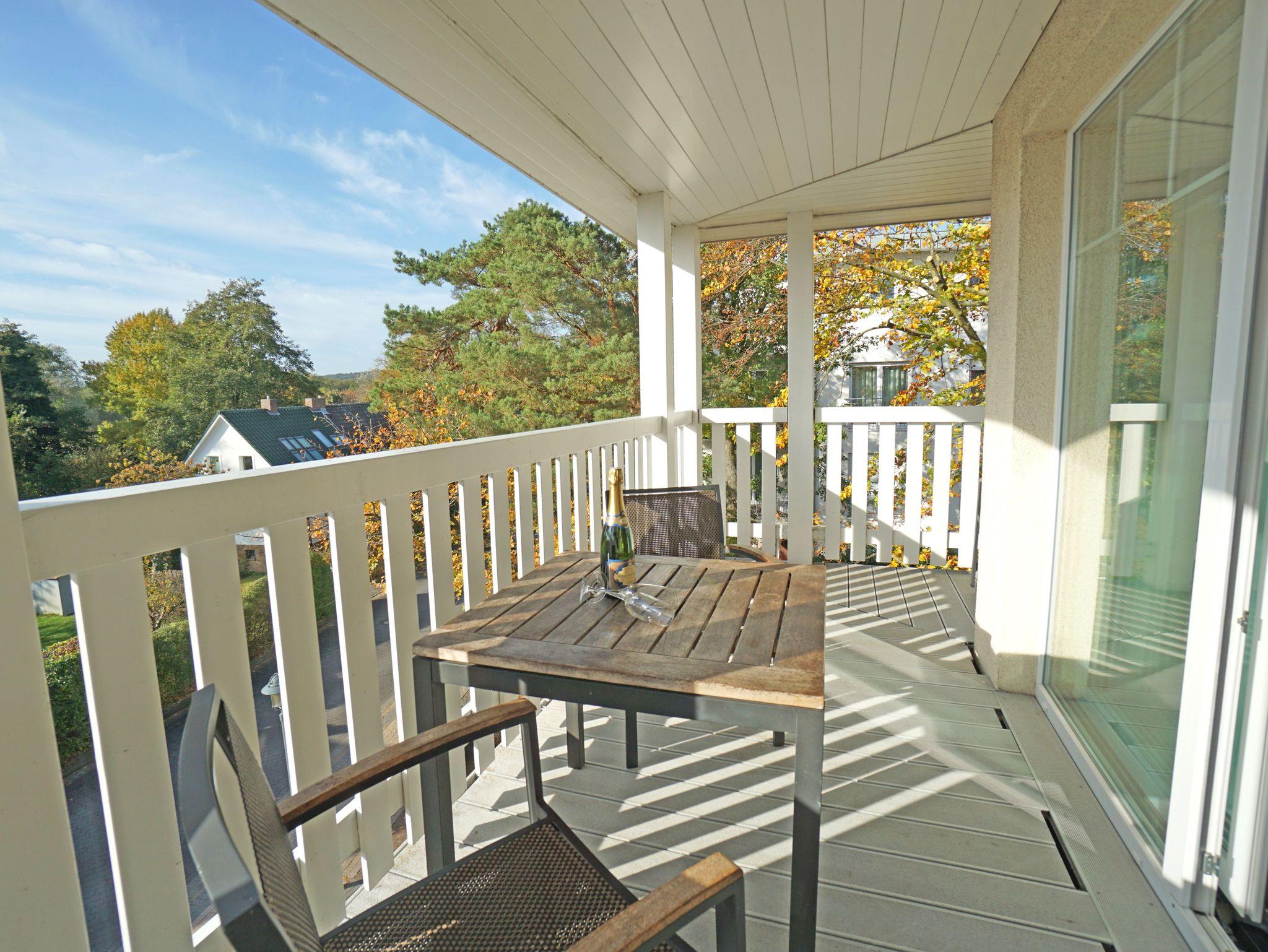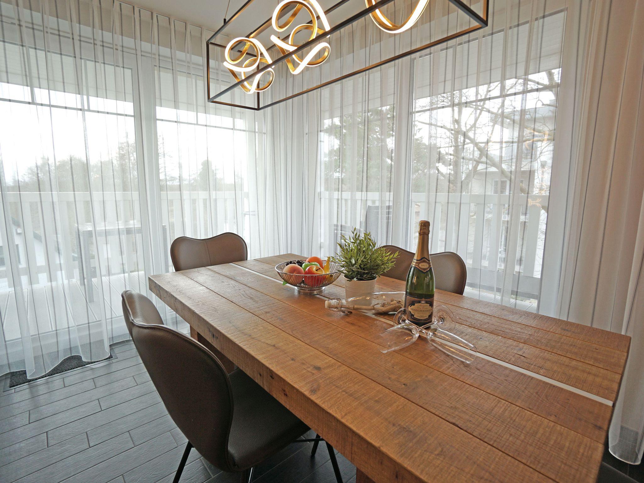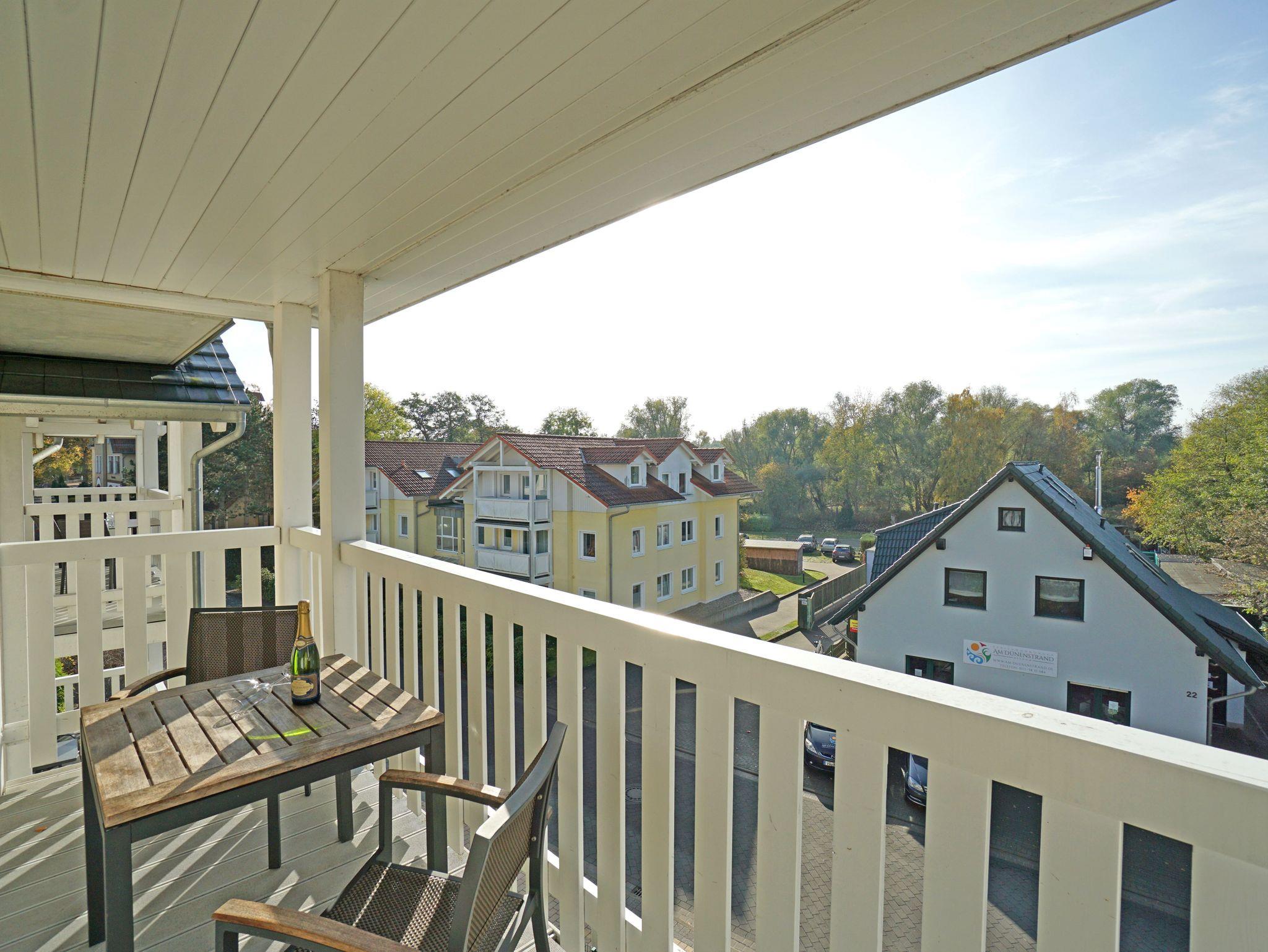 Die stylisch und modern eingerichtete Ferienwohnung ist ein wunderbarer Rückzugsort für maximal 4 Personen. Der feine Ostseestrand ist nur 20 Meter entfernt. Die Wohnung 8 im Dünendomizil im 2. OG mit seinen großzügigen 70 Quadratmetern ist aufgeteilt auf drei Zimmer und zwei Bäder. Das Wohnzimmer, ausgestattet mit einer komfortablen Sitzgruppe und einem Kaminofen, hat durch seine bodentiefen Fenster direkten Zugang zu einem von zwei schönen, großen Balkonen. Die Küche ist vollausgestattet. Die beiden Schlafzimmer verfügen über hochwertige Doppelbetten (180cmx200cm). Eines der beiden Schlafzimmer verfügt zusätzlich über einen Fernseher. Die Bäder besitzen jeweils eine Dusche, einen modernen Waschtisch und ein WC. Ein Pkw-Stellplatz ist für Sie reserviert. Die Betten sind bezogen. Der WLAN-Anschluss ist kostenfrei nutzbar.
