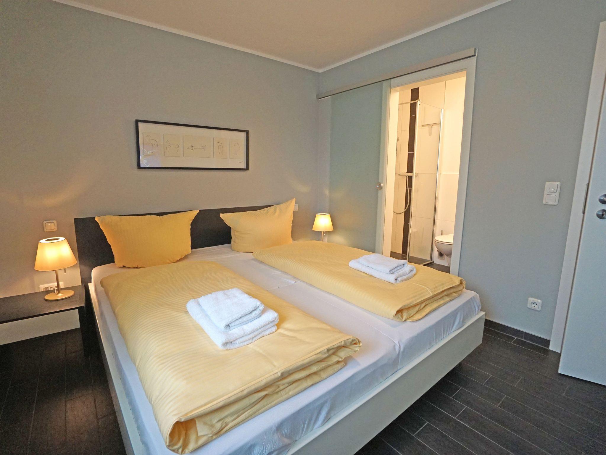Die Stilvoll eingerichtete 3-Zimmer-Ferienwohnung im 2. OG mit hochwertiger Ausstattung verfügt über zwei Balkone. Ein Fahrstuhl im Haus sowie eine Tiefgarage (Stellplätze eng, eingeschränkte Wendemöglichkeit) stehen Ihnen zur Verfügung. Ein kostenfreier WLAN-Zugang kann genutzt werden.