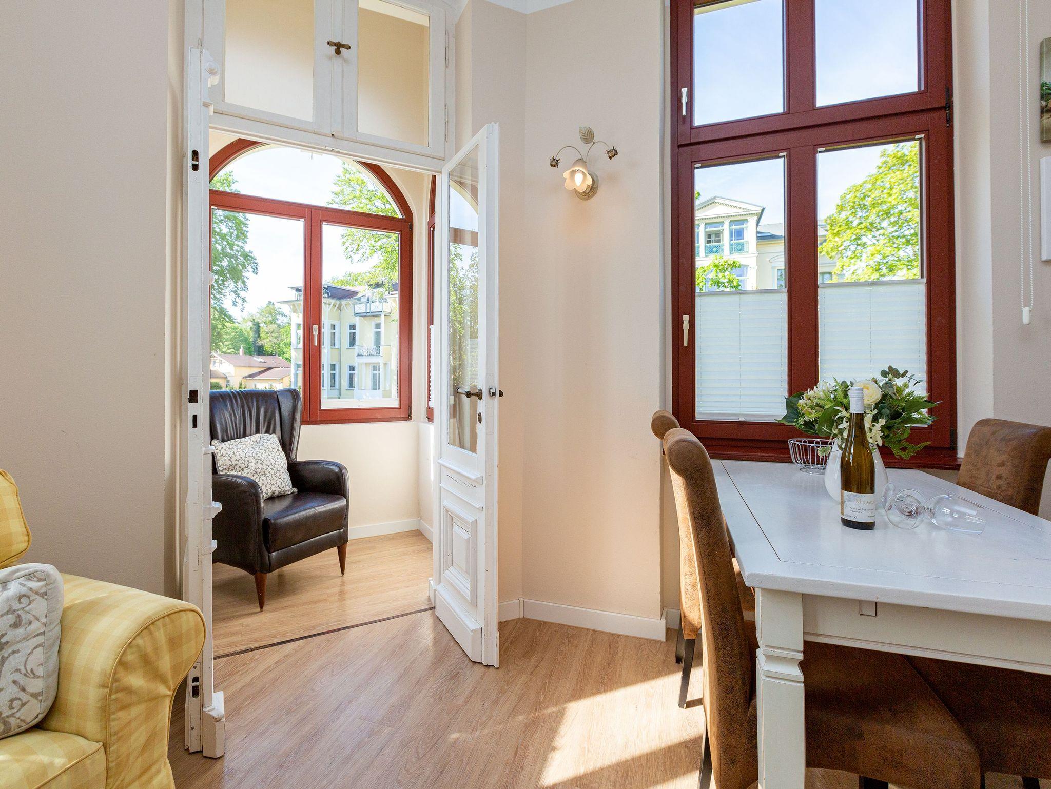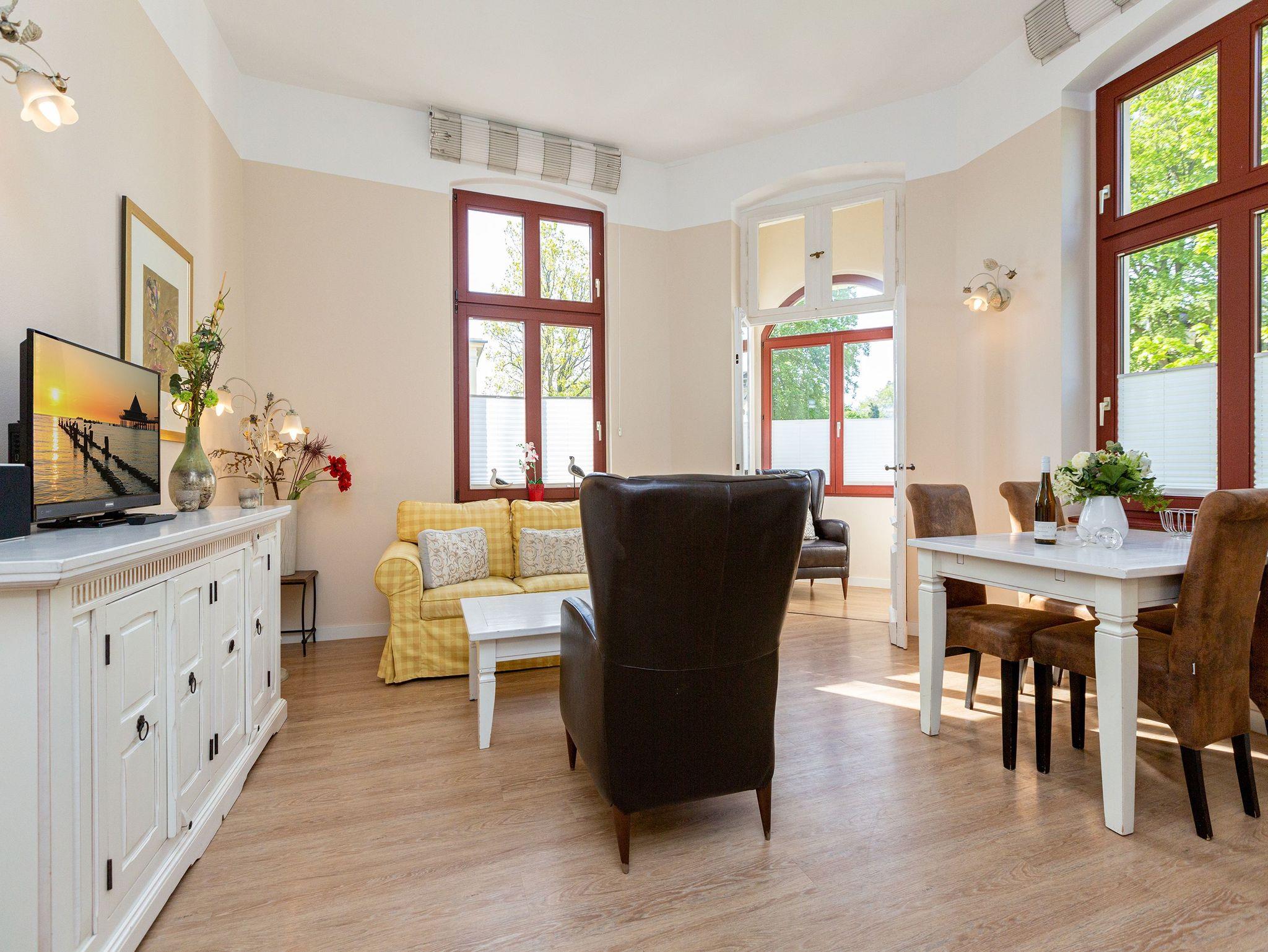 Im 1. Obergeschoss der Villa Arcadia befindet sich das wunderschöne 3-Raum-Appartement, das Platz für bis zu 4 Personen bietet. Das geräumige Wohnzimmer verfügt über eine gemütliche Sitzgruppe, einen Fernseher, einen Essplatz und eine praktische Küchenzeile, die mit allem ausgestattet ist, was Sie zum Zubereiten Ihrer Speisen benötigen. Ein kleiner Erker mit einem bequemen Lesesessel lädt darüber hinaus zum entspannten Verweilen ein. Die Wohnung verfügt über zwei Schlafzimmer, wovon eins mit einem komfortablen Doppelbett und das andere mit zwei Einzelbetten ausgestattet ist. Im Badezimmer befindet sich ein Waschtisch mit WC und Dusch. Für Ihren Komfort sind die Betten bei Ihrer Ankunft bereits bezogen und Handtücher liegen als Erstausstattung bereit. Ein PKW-Stellplatz direkt am Haus steht rundet dieses Appartement ab. WLAN-Netzwerk steht Ihnen im gesamten Haus kostenfrei zur Verfügung.